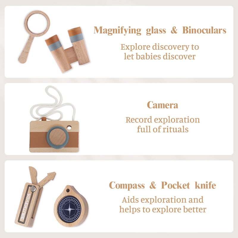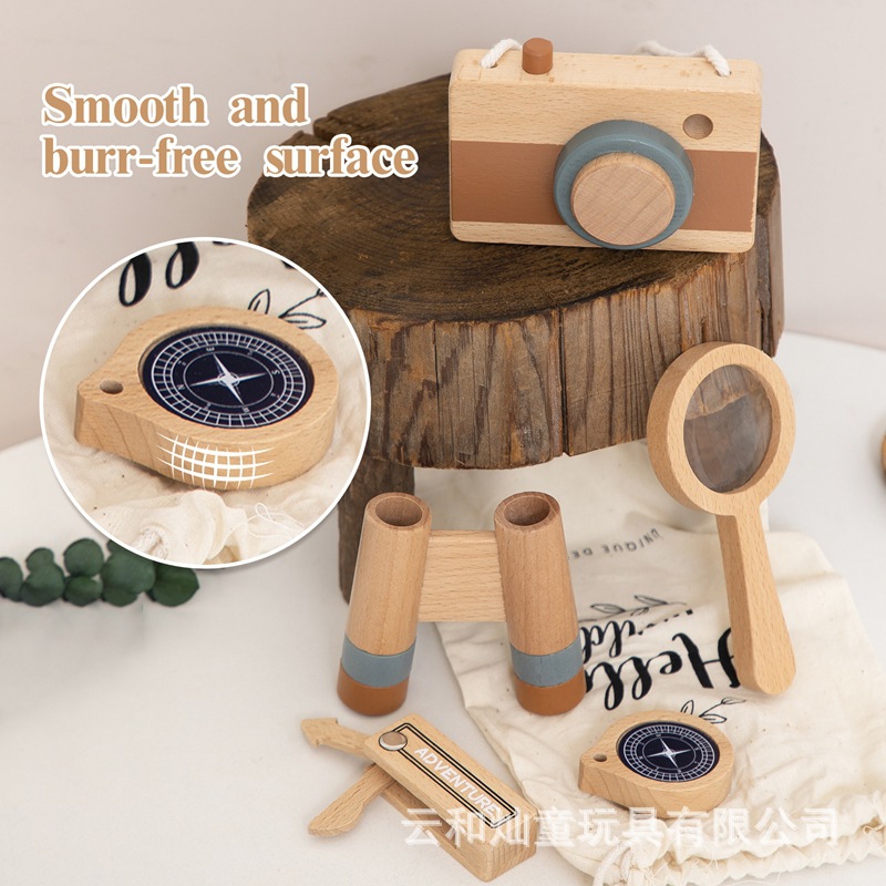 Juego de aventuras al aire libre divertido para niños, brújula de madera, lupa, cámara, educación temprana, juguetes cognitivos