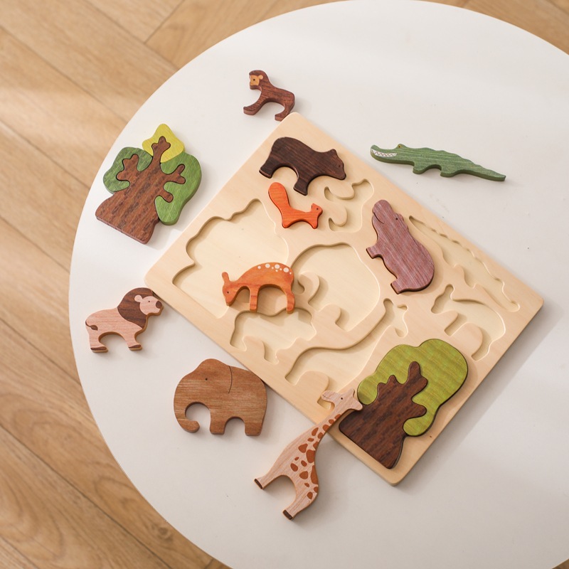Educación temprana para bebés, rompecabezas de animales tridimensionales de madera, paneles apilados, escenas de bosque, juguetes de agarre de mano