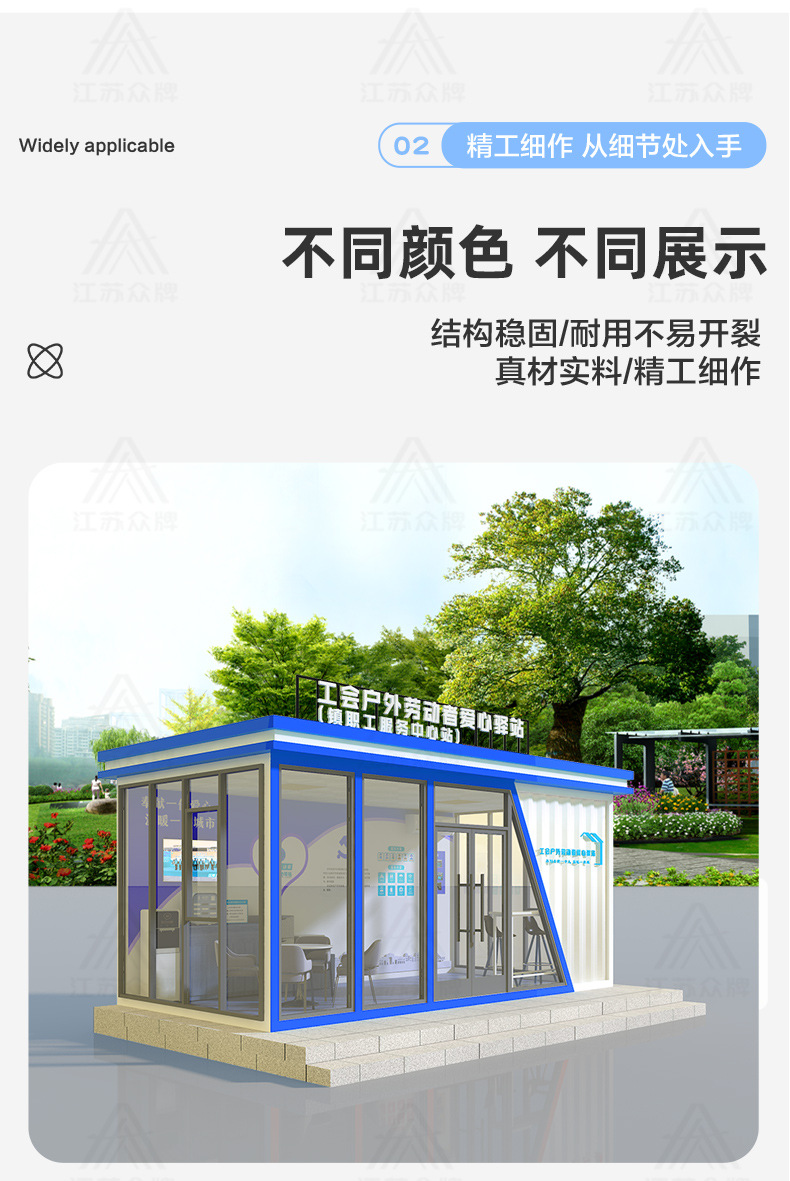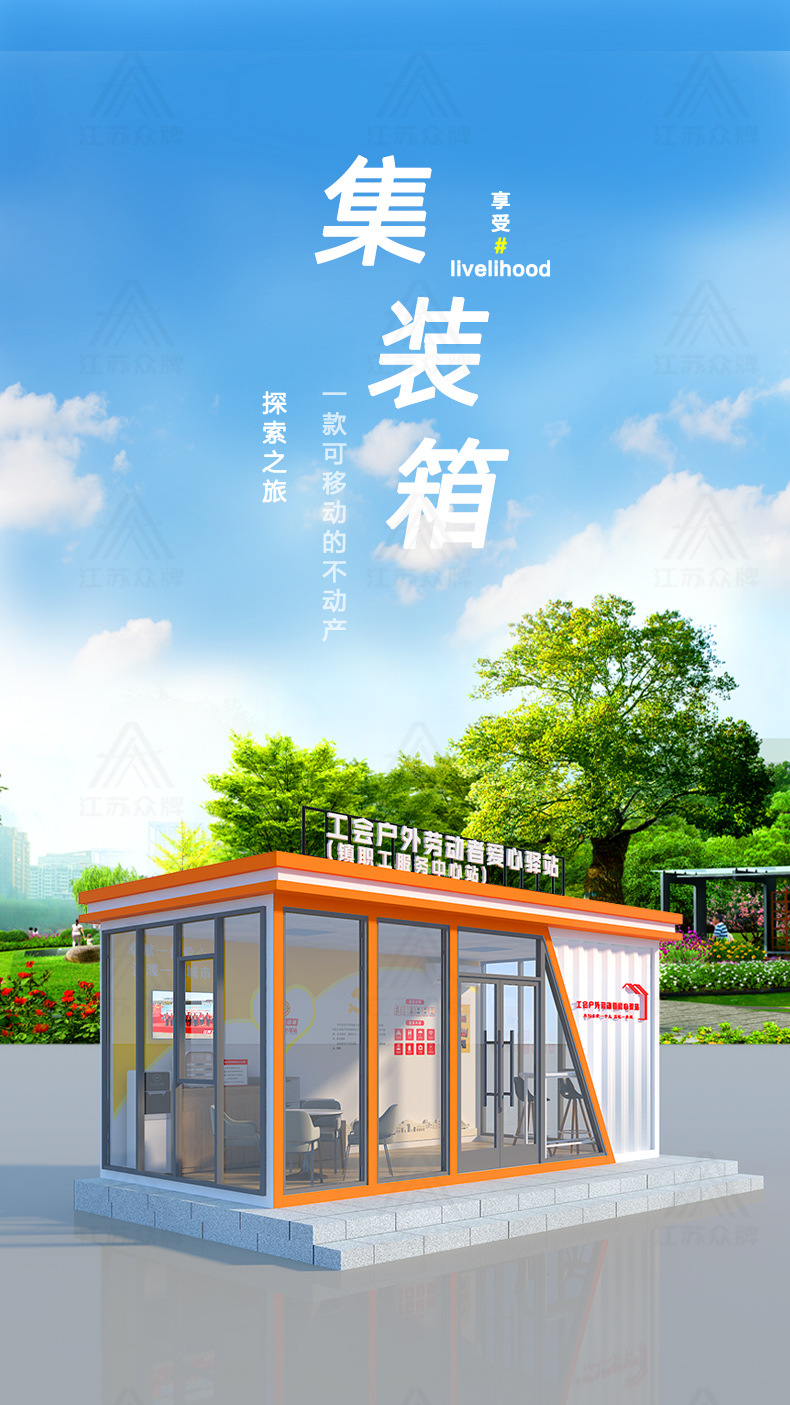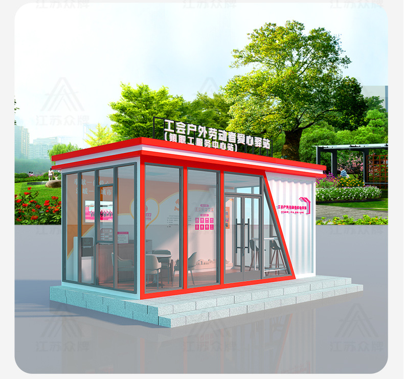 Sala móvil de contenedores, trabajador al aire libre, estación de amor, sala de servicio común, sala de sol escénica