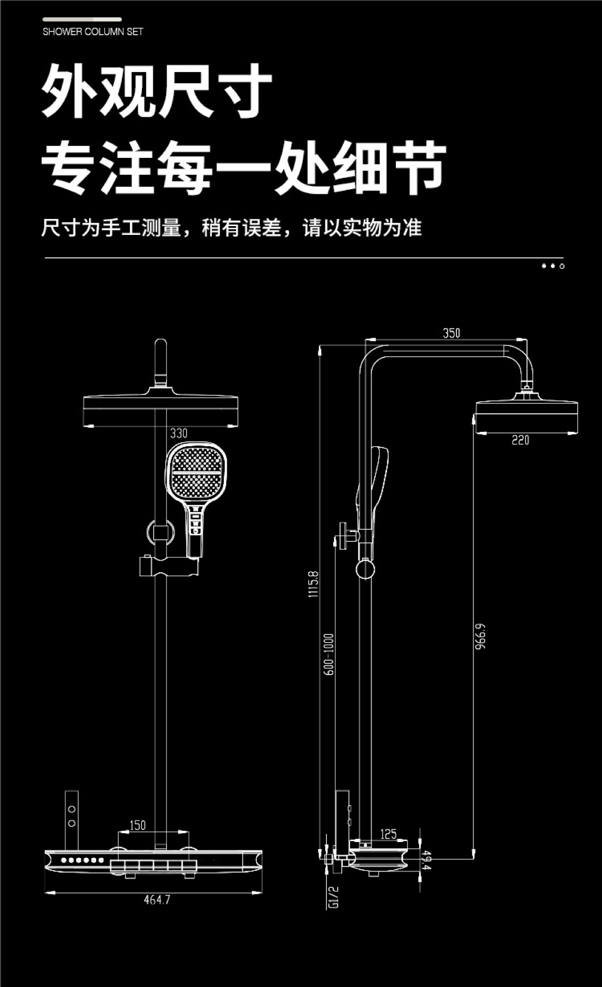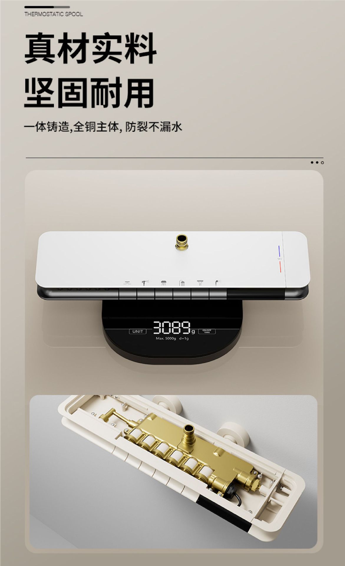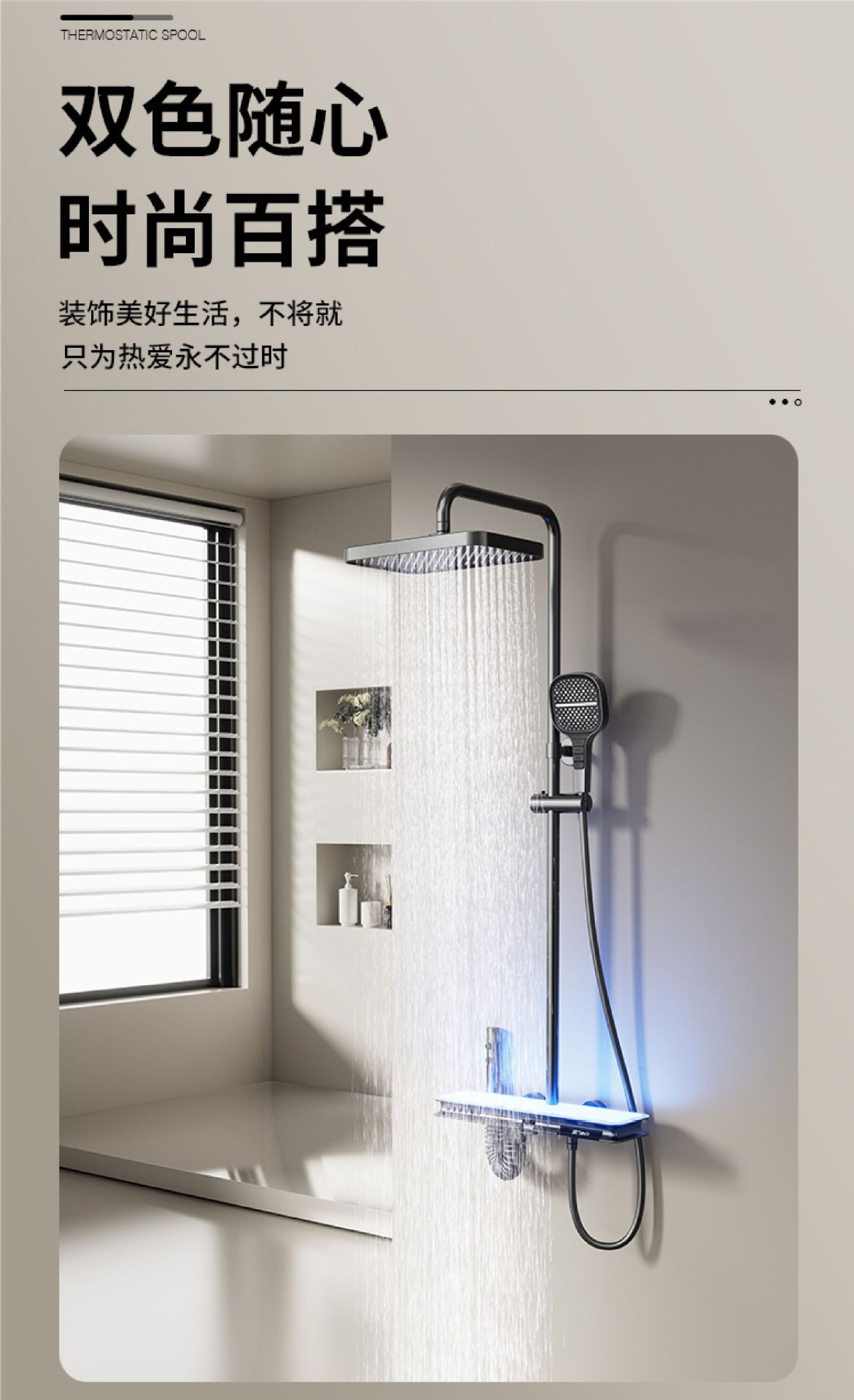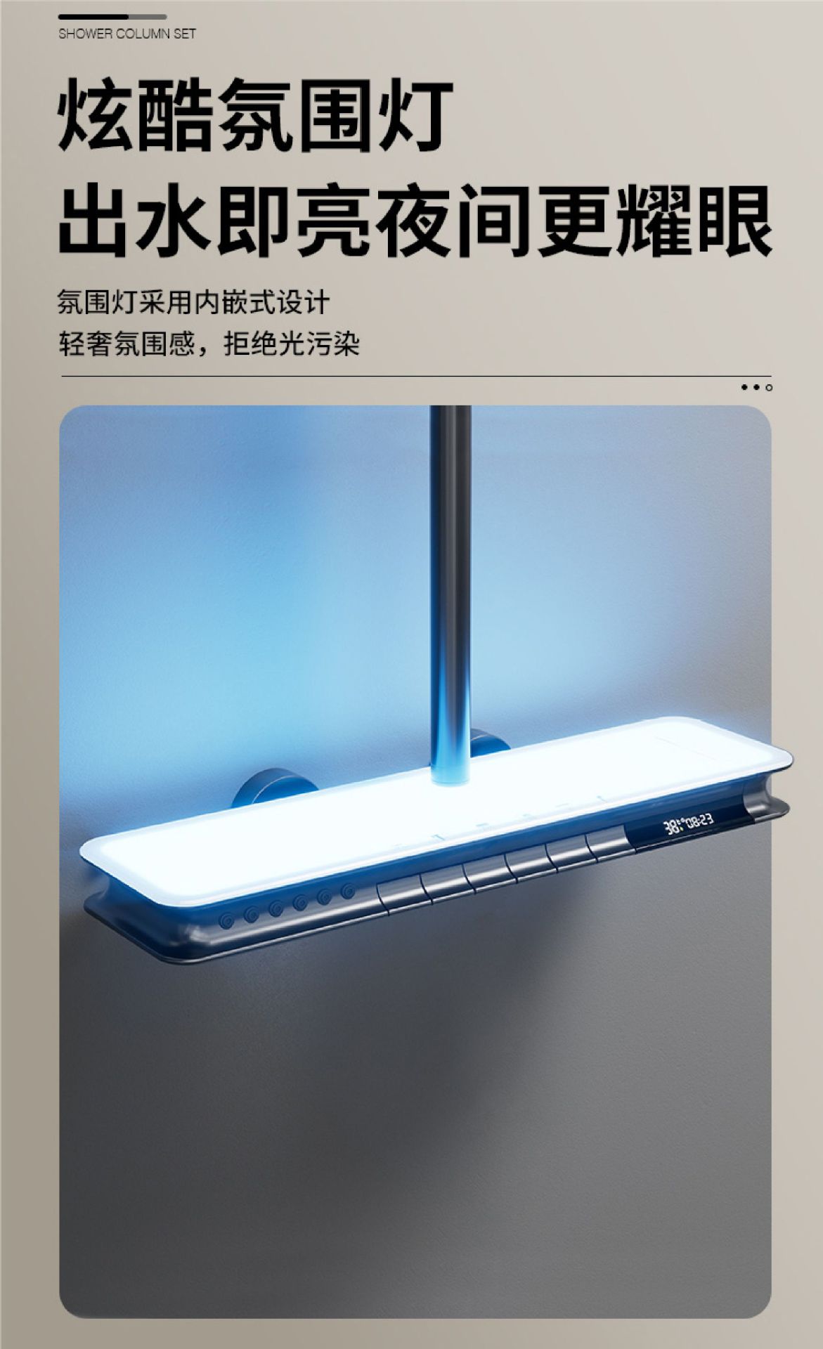 Juego de cabezal de ducha gris blanco de seis funciones con rociador superior en cascada, rociador de cintura, pantalla digital, luz ambiental, baño de ducha