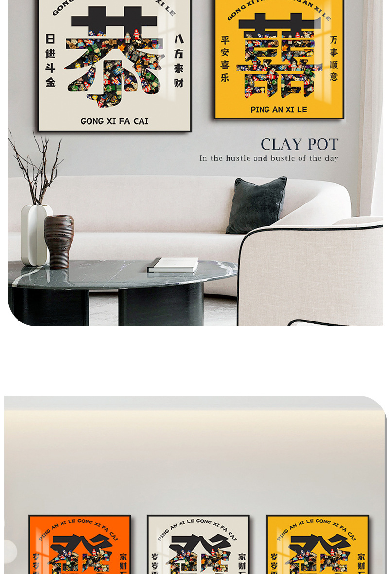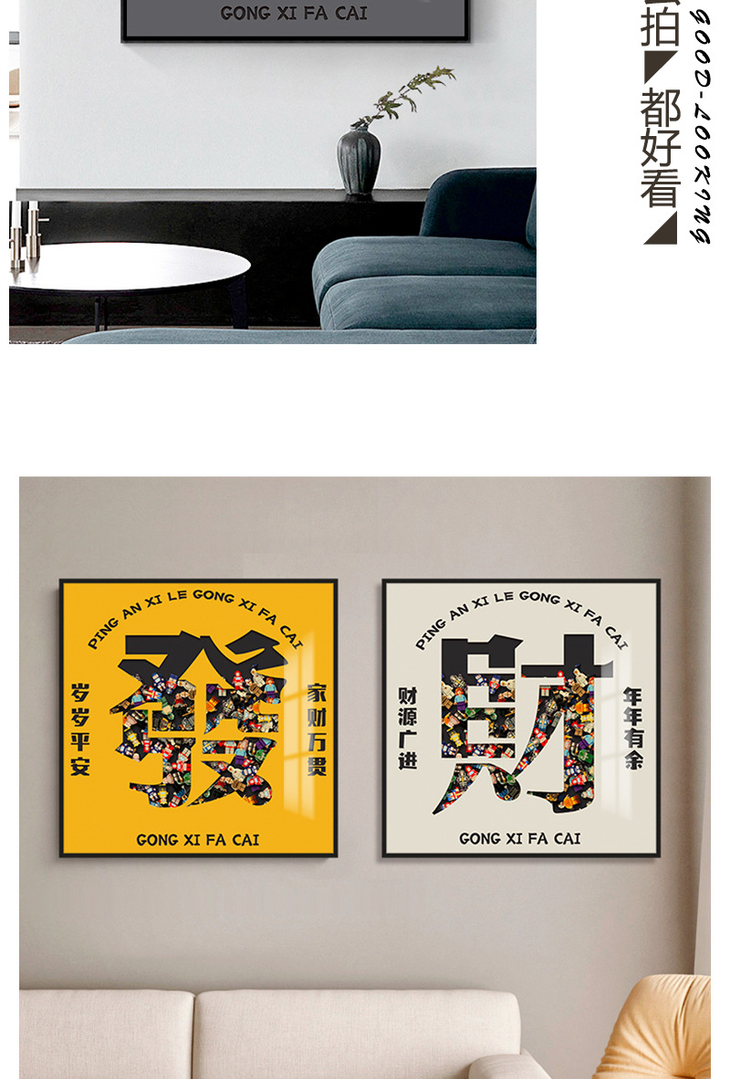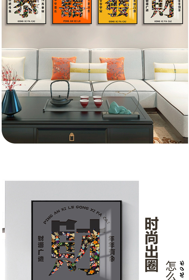 Felicitaciones a la sala de estar de Fa Cai Sofá Fondo de pared Pintura decorativa Significado Feliz inauguración de la casa Pintura colgante Madera de construcción 3D tridimensional