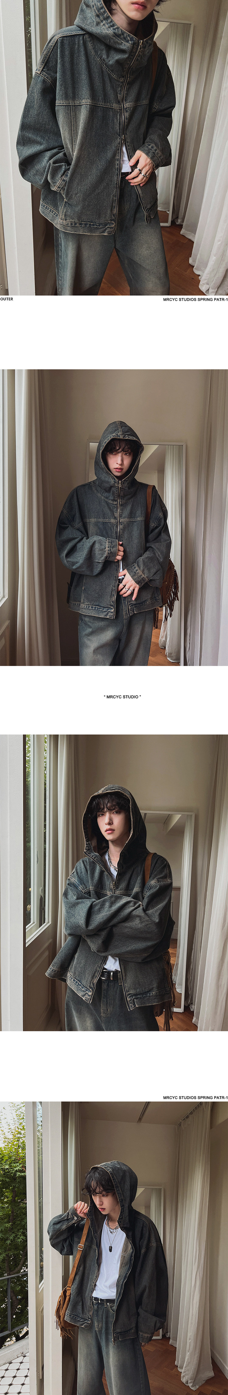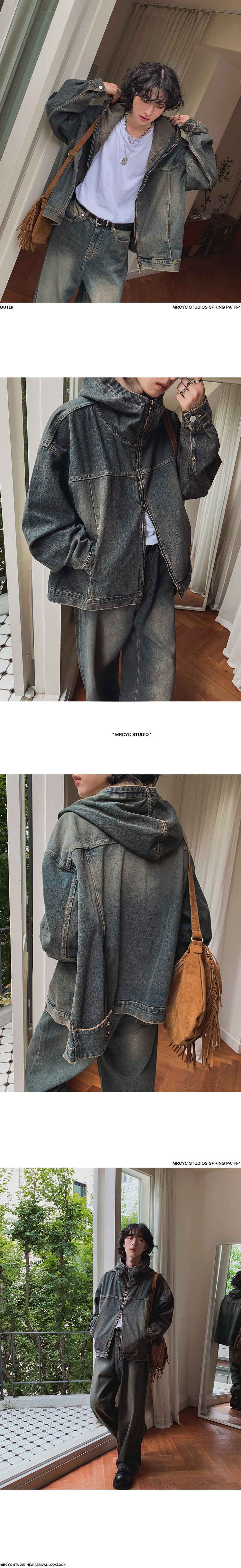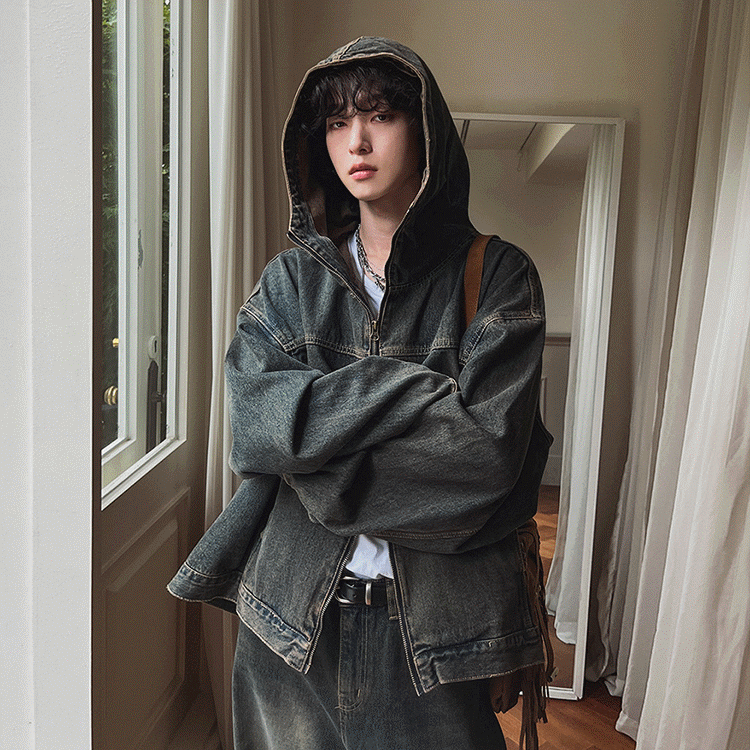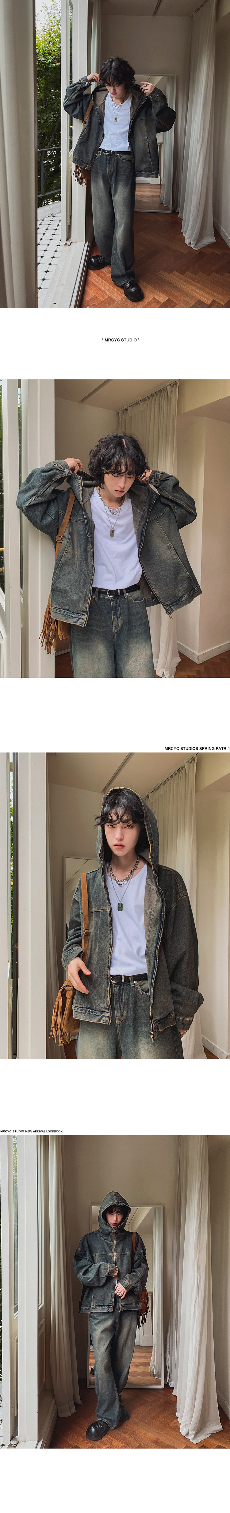 MYQ otoño retro viejo traje de mezclilla chaqueta con capucha suelta para hombre jeans rectos de moda coreana