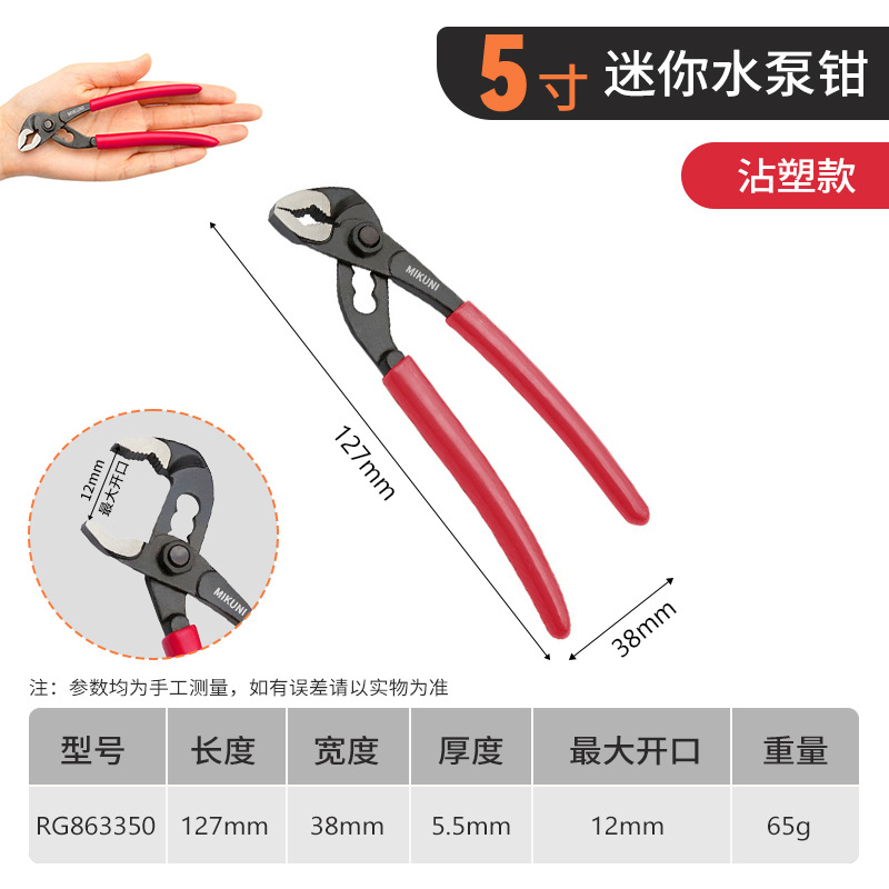 | Modelo | Alicates Mini para Bomba de Agua de 5 pulgadas, Rojo (CRV),Alicates Mini para Bomba de Agua de 5 pulgadas Rosa (CRV),Alicates Mini para Bomba de Agua de 5 pulgadas con Botón Rojo (CRV),Llave de abrazadera de 7.5 pulgadas (calidad estándar) con mango recubierto de plástico.,Llave de abrazadera de cabeza grande de 8 pulgadas (calidad estándar) con mango recubierto de plástico.,Llave de abrazadera de 10 pulgadas (calidad estándar) con mango recubierto de plástico.,Llave de abrazadera de 12 pulgadas (calidad estándar) con mango recubierto de plástico.,Llave de abrazadera de 7,5 pulgadas (alta calidad),Llave de abrazadera de 7.5 pulgadas con funda (alta calidad).,Llave de abrazadera de 10 pulgadas (alta calidad),Llave de abrazadera de 10 pulgadas con funda (alta calidad),Un par de fundas de abrazadera de 10 pulgadas.,Un par de fundas de abrazadera de 7,5 pulgadas,Llave de abrazadera de 5 pulgadas (alta calidad) con mango recubierto de plástico.,Llave de abrazadera de 7.5 pulgadas (alta calidad) con mango recubierto de plástico.,Llave de mordaza de 10 pulgadas (alta calidad) con mango recubierto de plástico.,Llave de abrazadera de 12 pulgadas (alta calidad) con mango recubierto de plástico. |