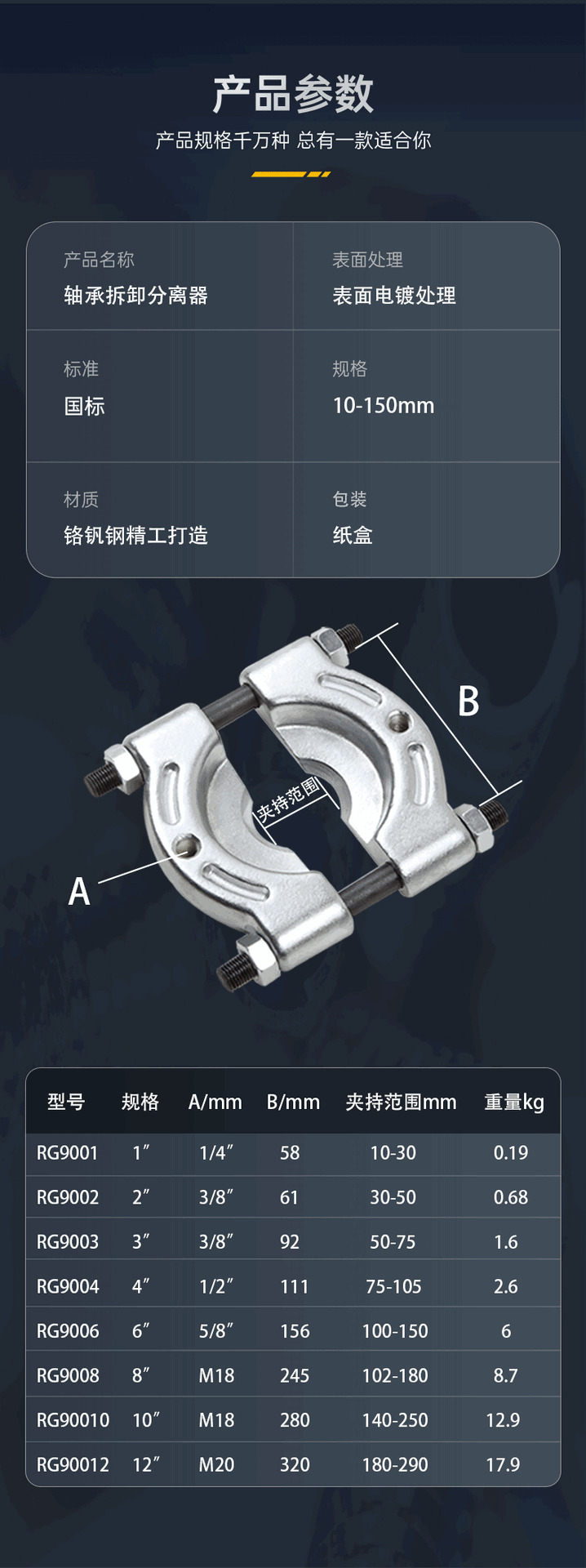 | Modelo de especificación | RG9001 1 pulgadas (10-30mm),RG9002 2 pulgadas (30-50mm),RG9003 3 pulgadas (50-75mm),RG9004 4 pulgadas (75-105mm),RG9006 6 pulgadas (100-150mm),RG9008 8 pulgadas (140-180mm),RG90010 10 pulgadas (180-250mm),RG90012 12 pulgadas (190-300mm) |