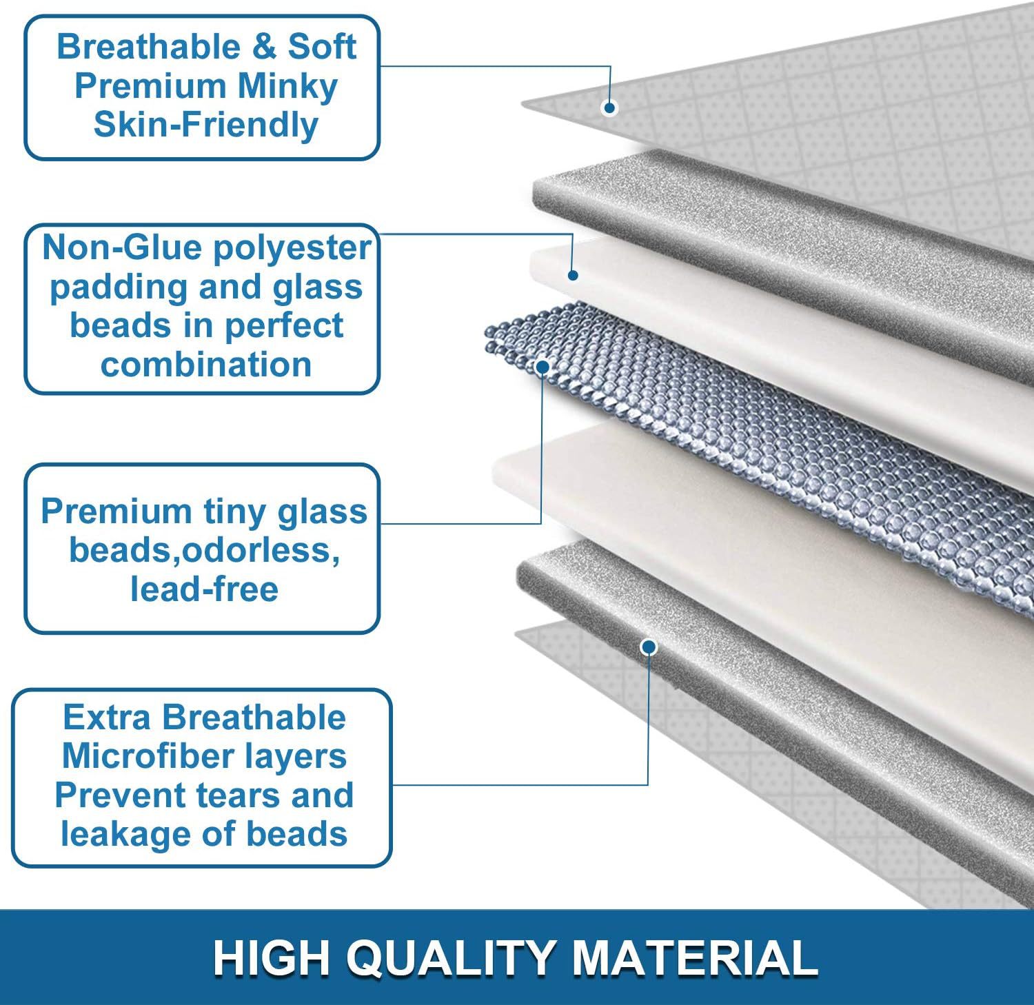 •重力毯一面采用磨毛布压泡,另一面采用超柔面料,并采用四层结构(面料+玻璃珠+无胶绵+面料),使用0.8-1mm的玻璃珠,中间放有无胶绵可以防止珠子泄露。