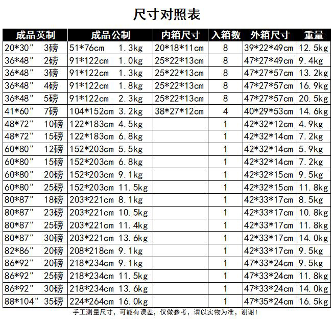 | Especificaciones de tamaño | 20 * 30in 3 lbs,36 * 48in 2 lbs,36 * 48in 3 lbs,36 * 48in 4 lbs,36 * 48in 5 lbs,41 * 60in 7 lbs,48 * 72in 10 lbs,48 * 72in 15 lbs,60*80in 12 lbs,60*80in 15 lbs,60*80in 20 lbs,60*80in 25 lbs,80 * 87in 18 lbs,80 * 87in 23 lbs,80 * 87in 25 lbs,80 * 87in 30 lbs,82 * 86in 20 lbs,86 * 92in 20 lbs,86 * 92in 25 lbs,86 * 92in 30 lbs,88 * 104in 35 lbs |
