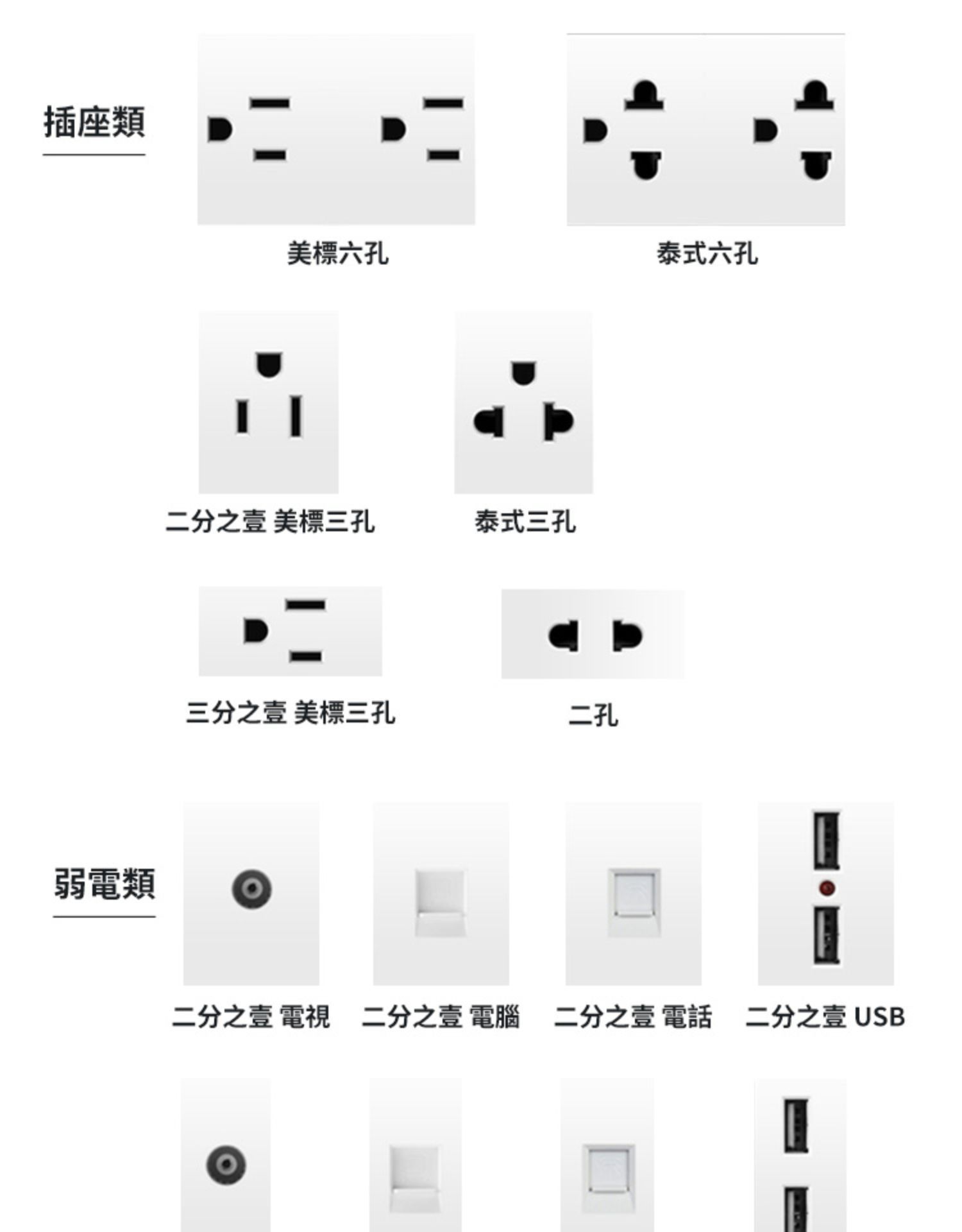 ModeloSeis hoyos americanos,USB americano del seis-agujero,USB + tres agujeros,Conector USB único,Americano de tres agujeros,Tecla de encendido (indicador LED),Llave de dos interruptores (luz indicadora LED),Llave de tres interruptores (luz indicadora LED),Cuatro llaves (luz indicadora del LED),Tecla de piano abierta (indicador LED) + tres agujeros,Palanca abierta con LED,Palanca dos-abierta con LED,Palanca de tres abierto con LED,Control único de un solo interruptor,Dos-control único abierto,Tres-control único abierto,Un doble corte abierto,Dos de doble corte abierto,Tres doble corte abierto,Cuatro doble corte abierto,Corte doble de cinco cortes,De seis cortes de doble corte,Un agujero y tres agujeros,Americana dividir seis agujeros,Estilo americano de Seis hoyos,Americano de nueve hoyos,Uno abierto + cuatro agujeros,3-bit 2-agujero,Dos abiertos + tres agujeros americanos,Dos agujeros abiertos + 2,Toma de antena de TV,Toma de teléfono,Zócalo del cable de la red,TV + teléfono,TV + cable de red,TV + tres agujeros americanos,Teléfono + tres agujeros americanos,Cable DE LA RED + tres-agujero americano,Teléfono + cable de red,Enchufe doble del cable de la red,Enchufe de teléfono Doble,Panel en blanco,Caja inferior de montaje abierto,Caja inferior oculta,Caja impermeable,Zócalo del aire frío 20A,Americano de seis agujeros [USB + Typec] 2.1A