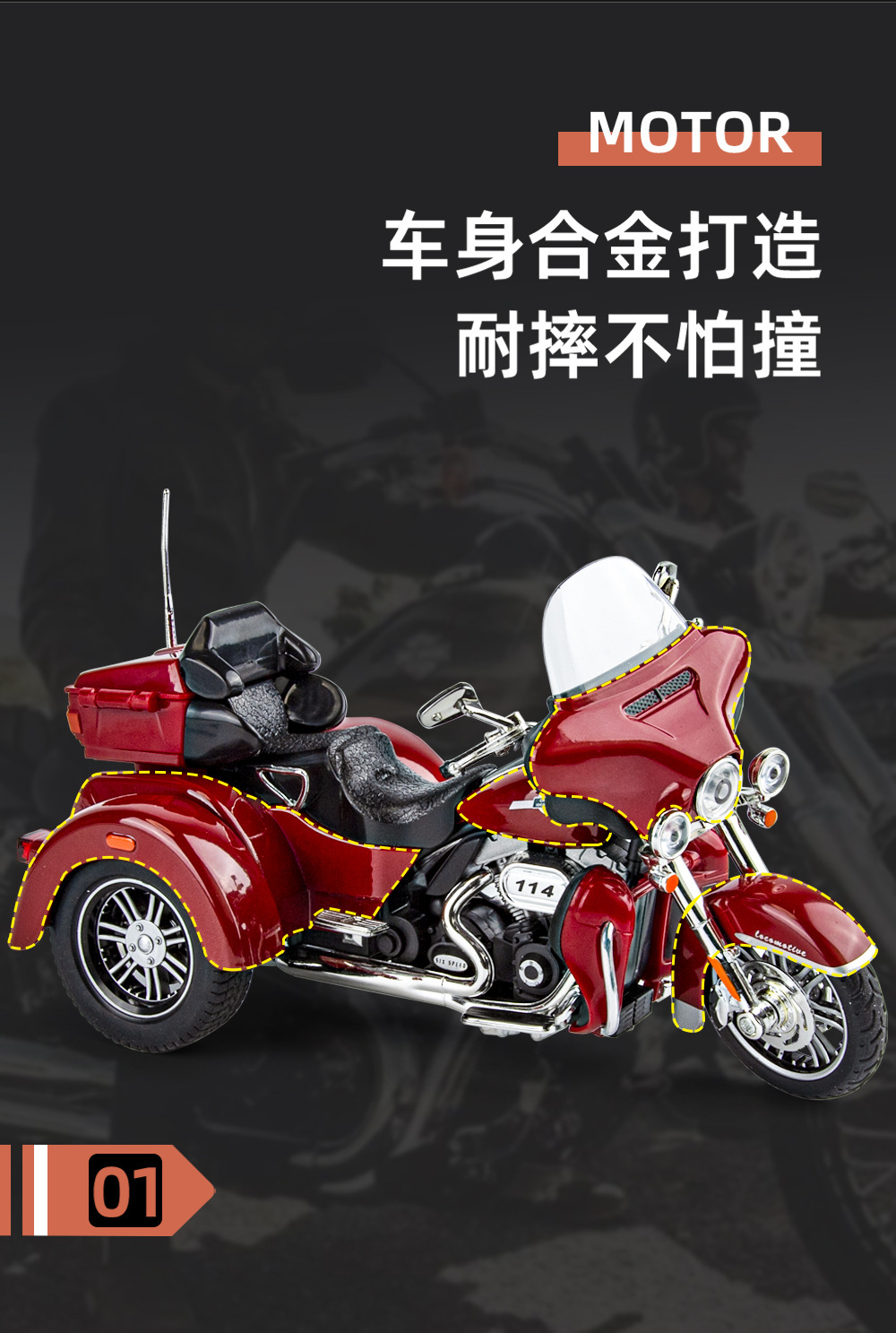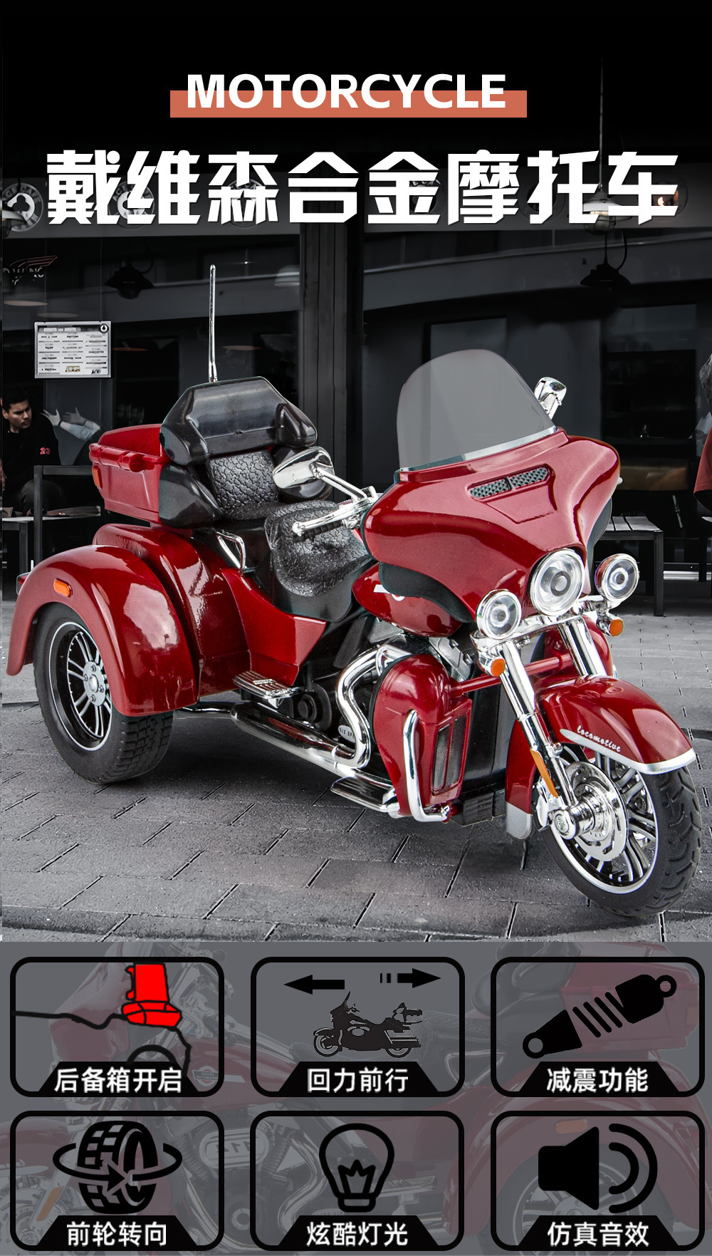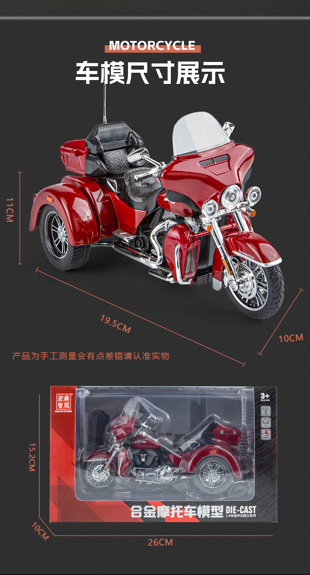 Modelo de coche de aleación Zhiguan Tianxia 1 a 9 motocicleta de tres ruedas Davidson con sonido y luz modelo de sonido de coche de juguete