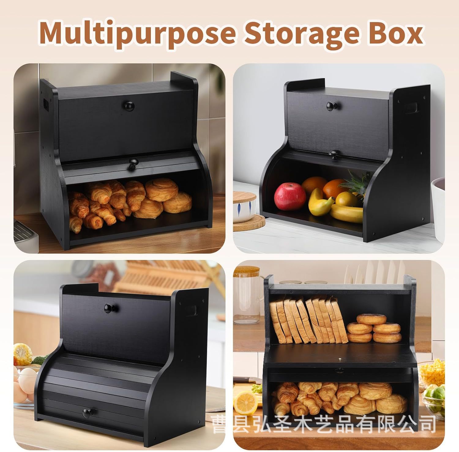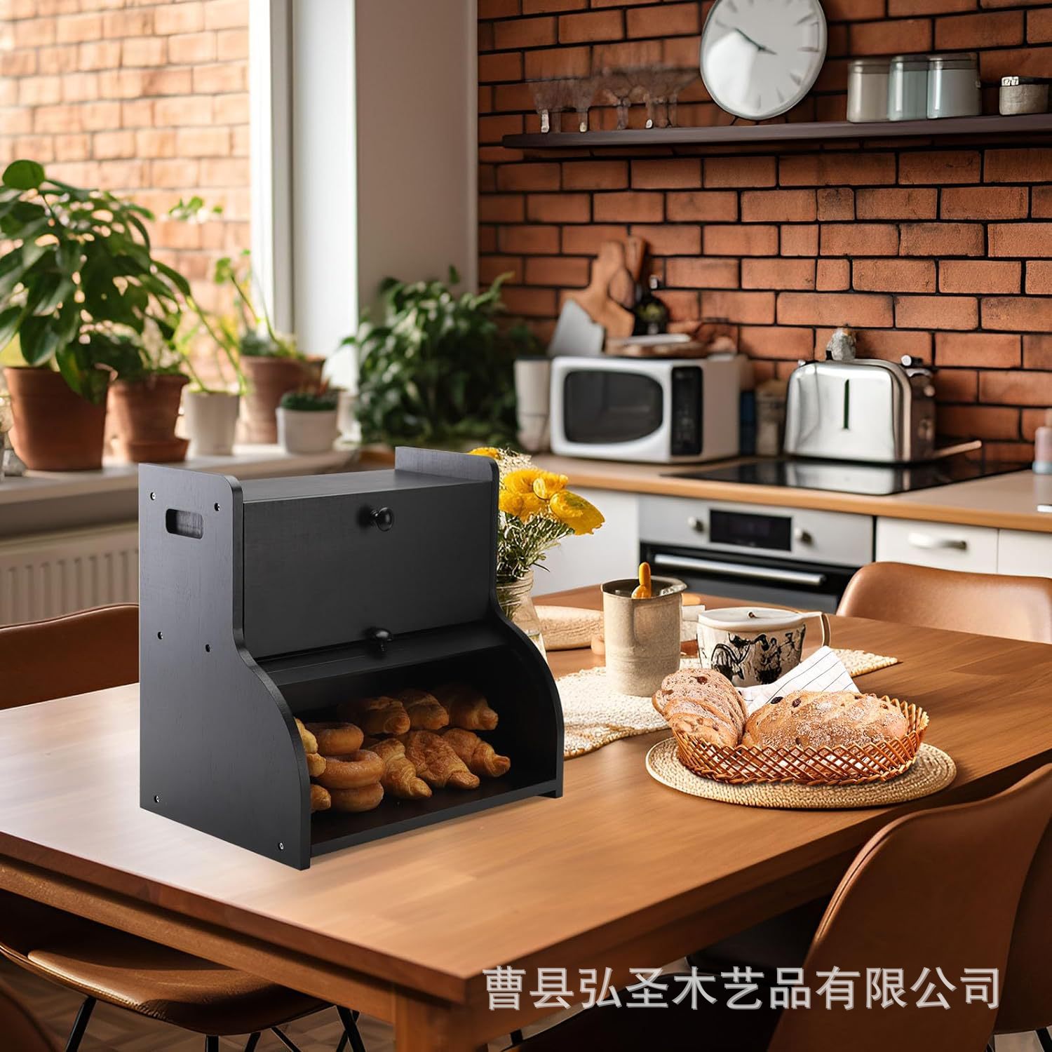Caja de pan de madera maciza, mesa de cocina, caja de condimento, caja de punto tipo solapa, caja de almacenamiento de madera maciza de doble capa con soporte para vajilla