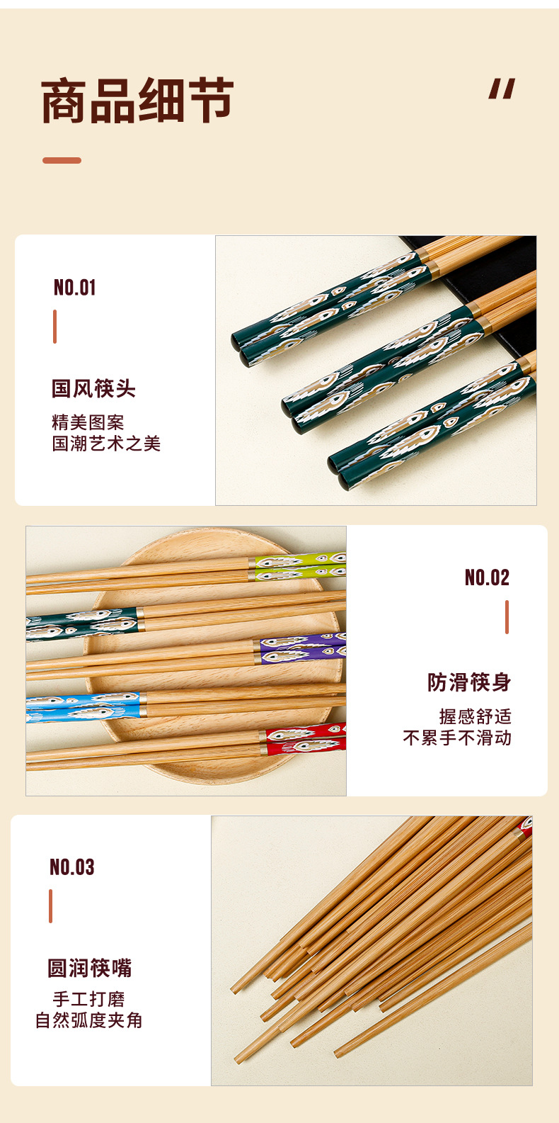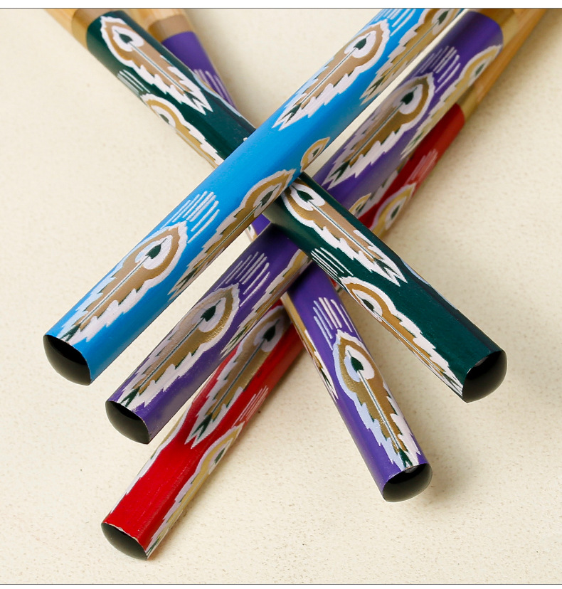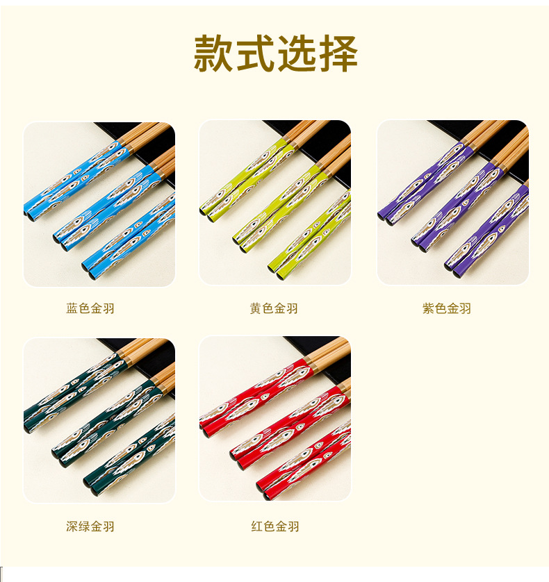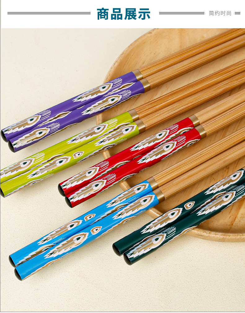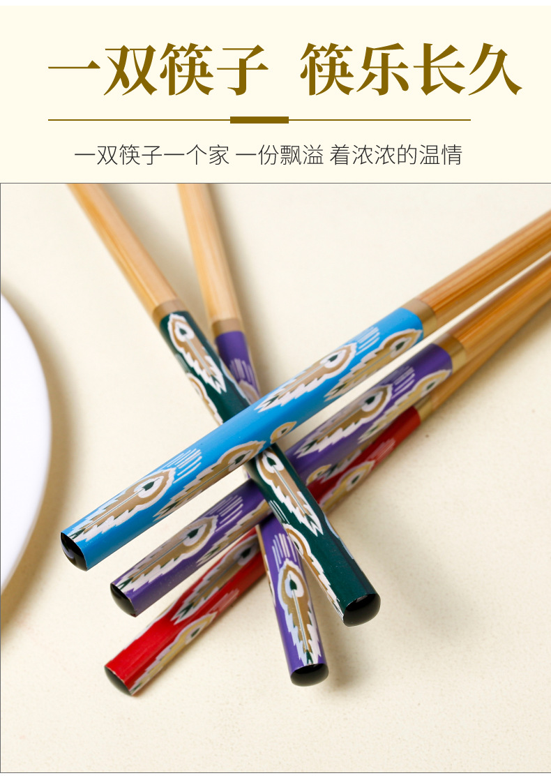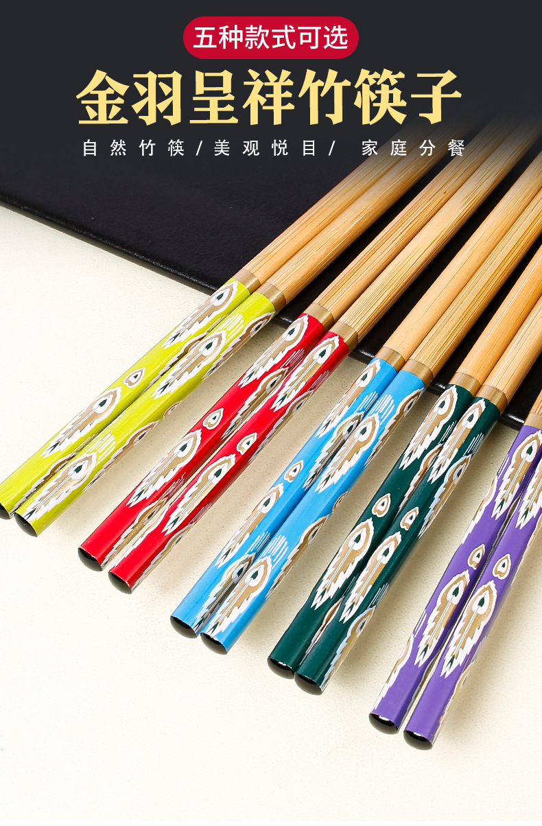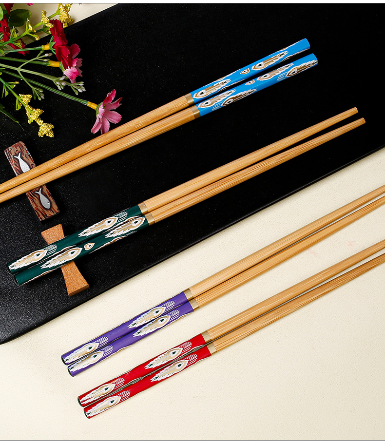 Palillos de bambú al por mayor Película de flores con patrón de cola de pavo real de 24cm Palillos de comida divididos en cinco colores Una persona Palillos de comida Suministro de vajilla de regalo