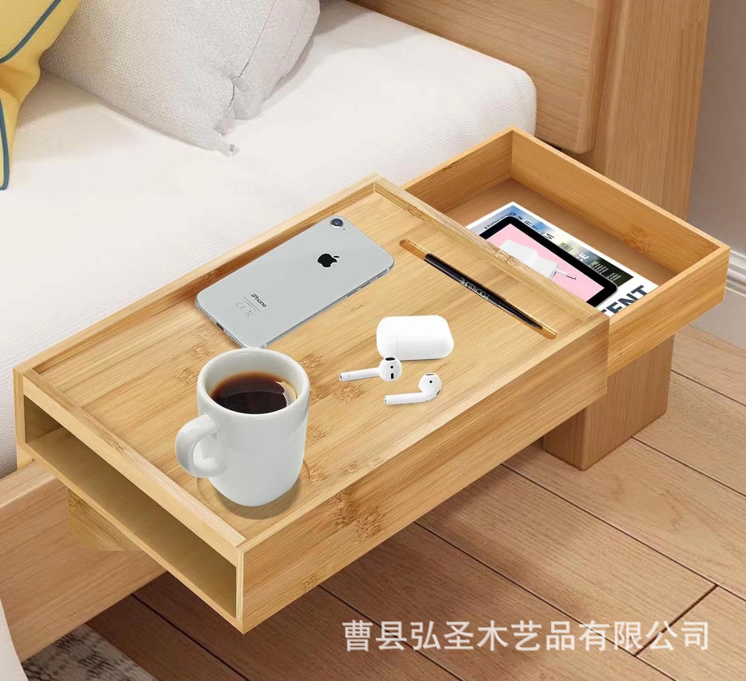 Nuevo marco de borde de cama de bambú Mesa de borde de cama con cajón Estante de almacenamiento de borde de cama de madera Clip de bambú Estante de bandeja