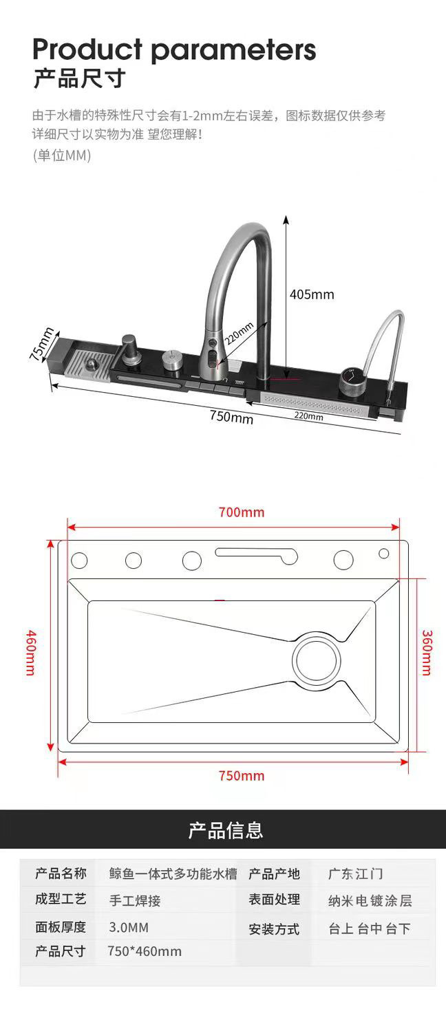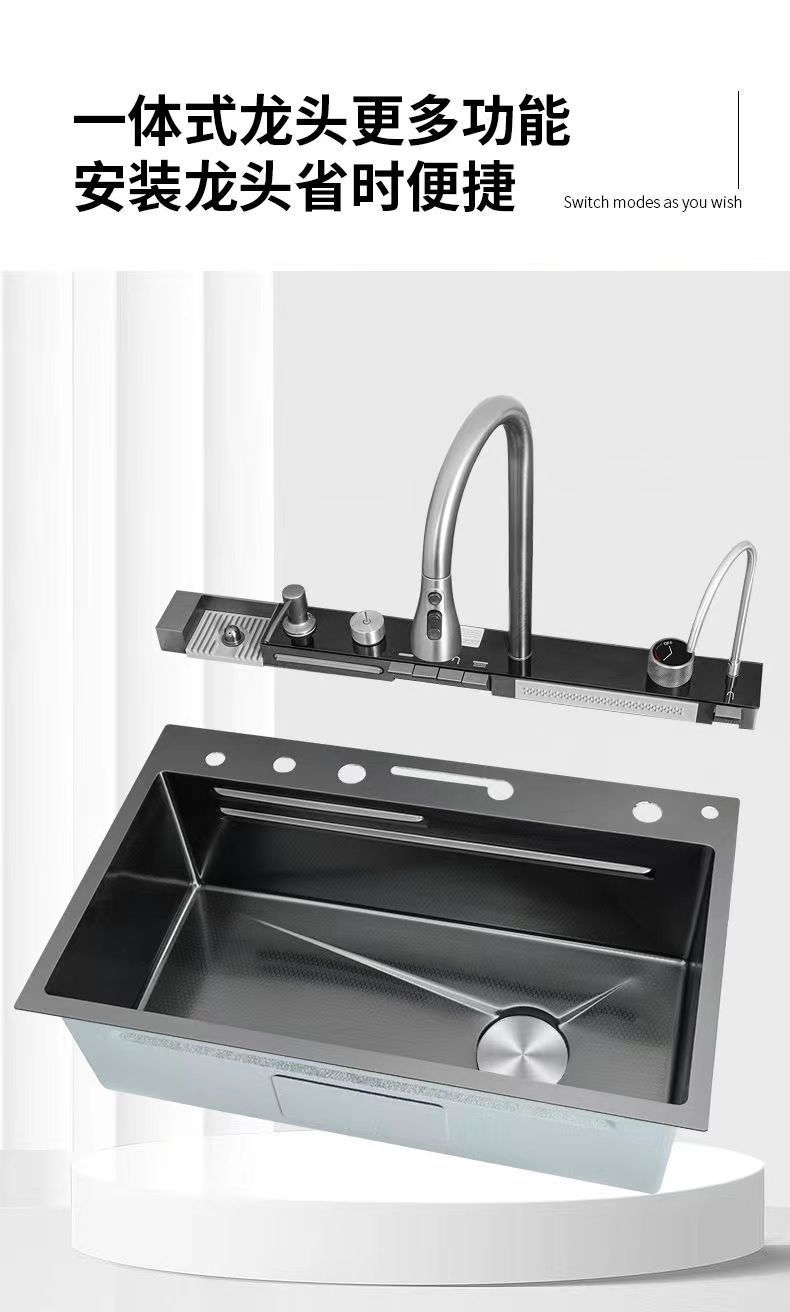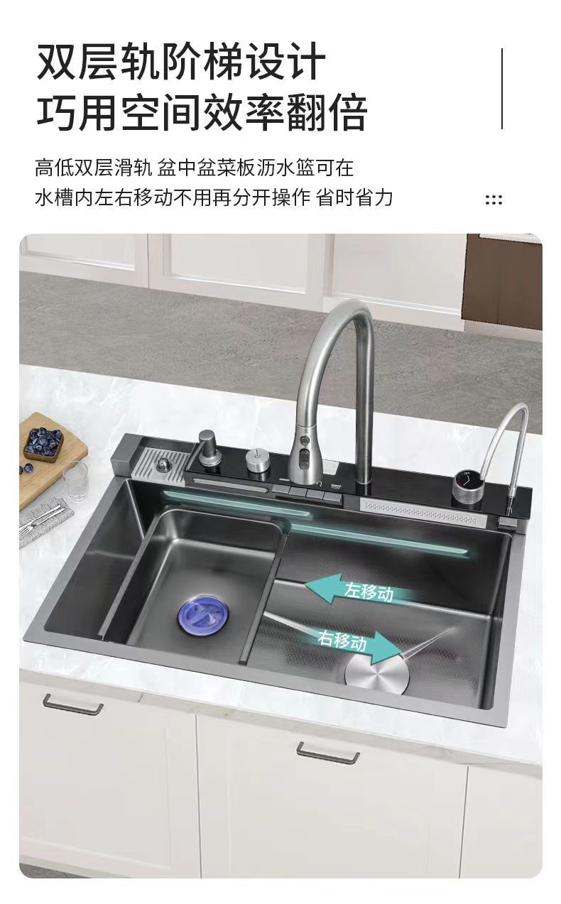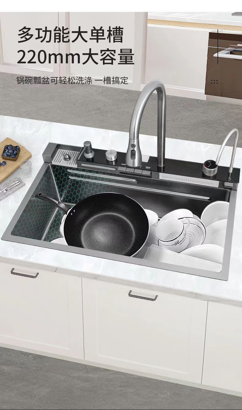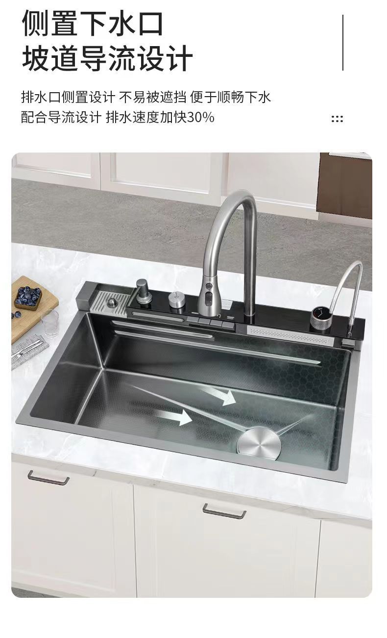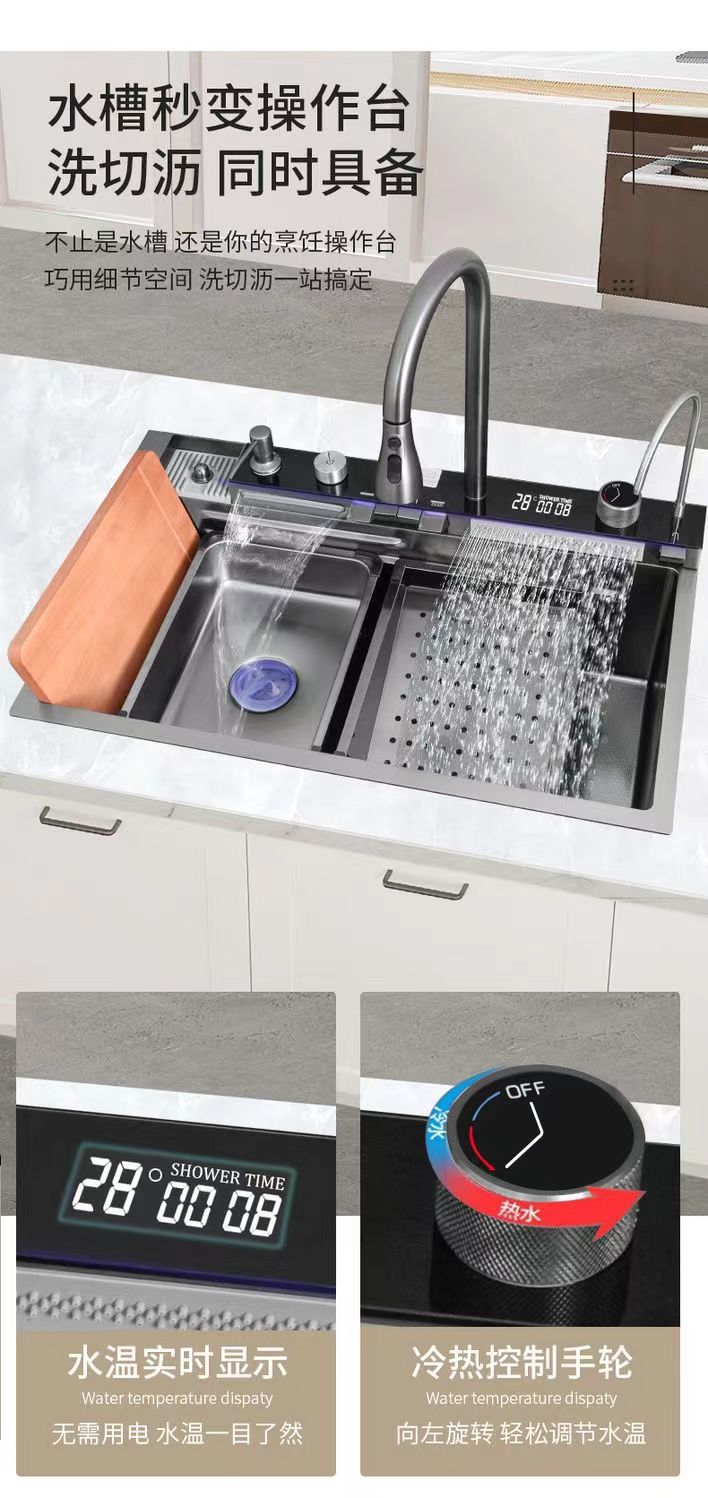 Lavabo de acero inoxidable, fregadero de cascada de lluvia de ballena, fregadero de cocina, fregadero de pantalla digital multifunción de un solo tanque grande de acero inoxidable