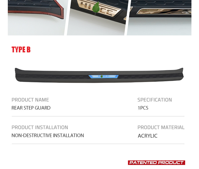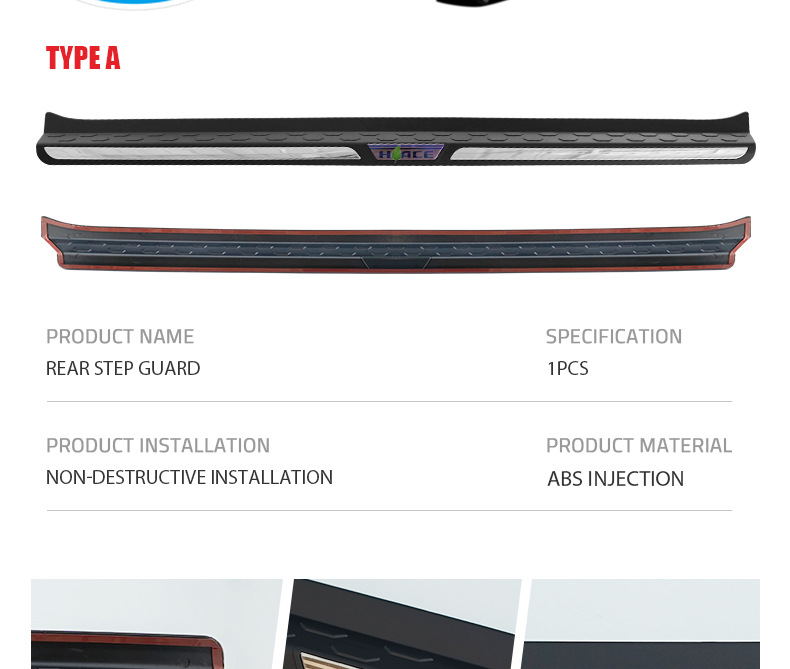 | Especificaciones | Hiace 2019-ahora placa de protección trasera de inyección 1 pieza,Hiace 2019-ahora blíster placa de protección trasera 1 pieza |