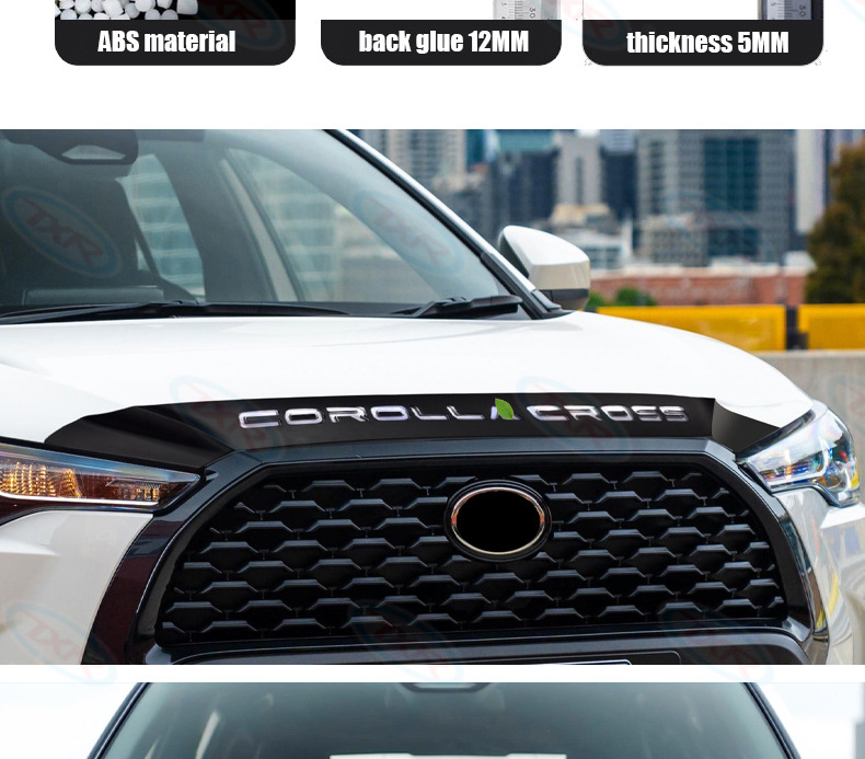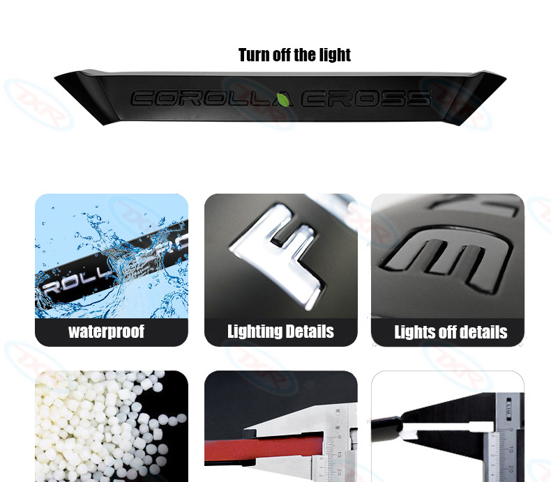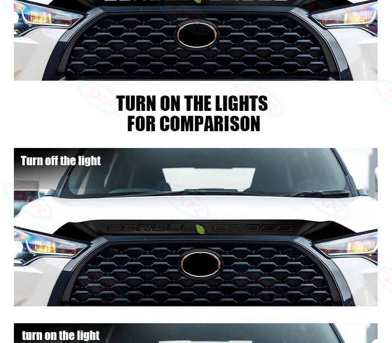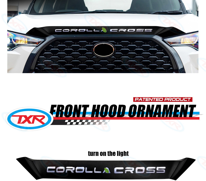 | Especificaciones | Embellecedor especial del capó para Corolla Cross 2020-presente, con fondo negro y caracteres blancos (1 unidad).,Embellecedor especial para capó del Corolla Cross 2020-presente con caracteres negros electrochapados (1 pieza).,Embellecedor de Capó Corolla Cross 2020-Presente - Base Negra con Emblema de Letras Iluminado (Juego de 1 Pieza) |