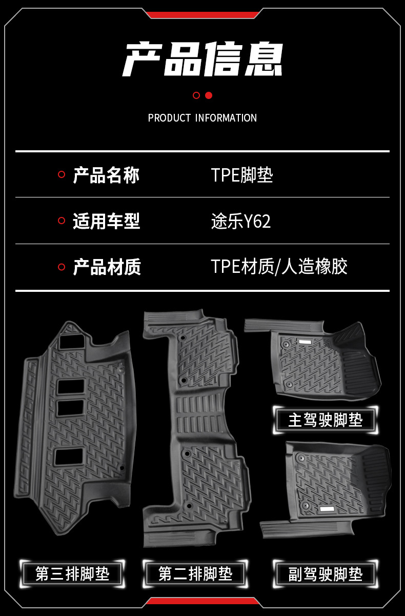 | Especificaciones | 2010-2023 Patrol y62-almohadilla de pie TPE especial para conducción izquierda de cinco asientos juego de 3 piezas,2010-2023 Patrol y62-almohadilla de pie TPE especial para conducción izquierda de siete asientos juego de 4 piezas |