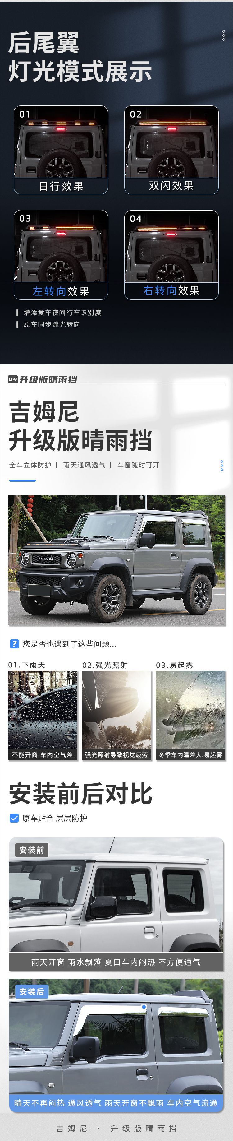 | Especificaciones | Jimny 21-Bloque de grava con lámpara streamer (juego de 1 pieza),Jimny 21-cubierta del motor anti-grava (juego de 1 piezas),Jimny 21-cola trasera con luz streamer (juego de 1 pieza),Jimny 21-Escudo de lluvia galvanizado de platino (4 piezas),Jimny 21-Escudo de lluvia negro original (4 piezas),Jimny 21-Escudo de lluvia transparente claro (4 piezas) |
