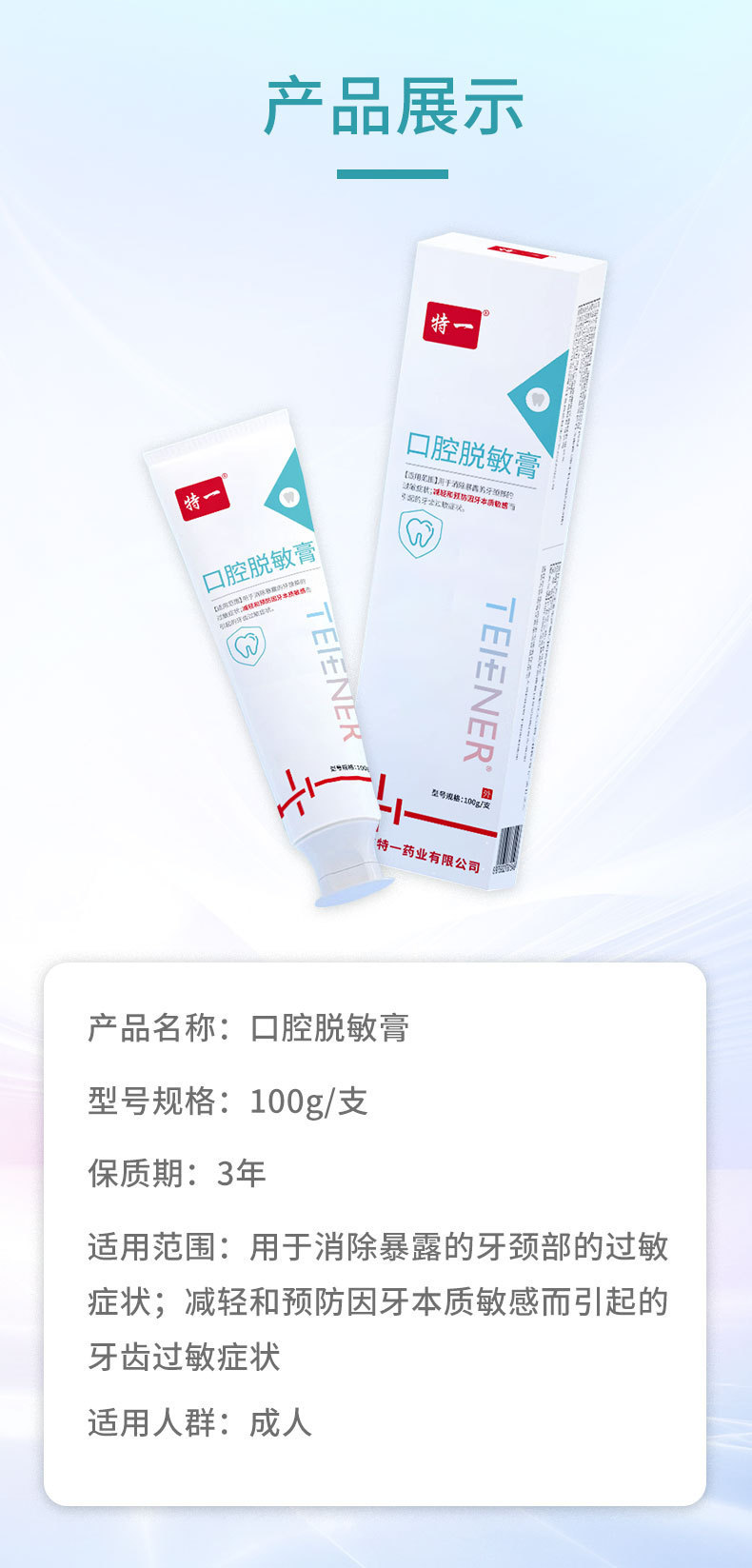 | Especificaciones | Crema de desensibilización oral 100 g/rama |