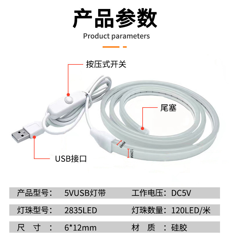 Tira de luz de neón de 5V 5*12 (precio unitario sin cable USB)