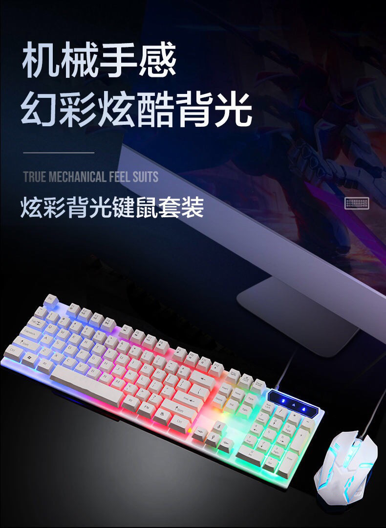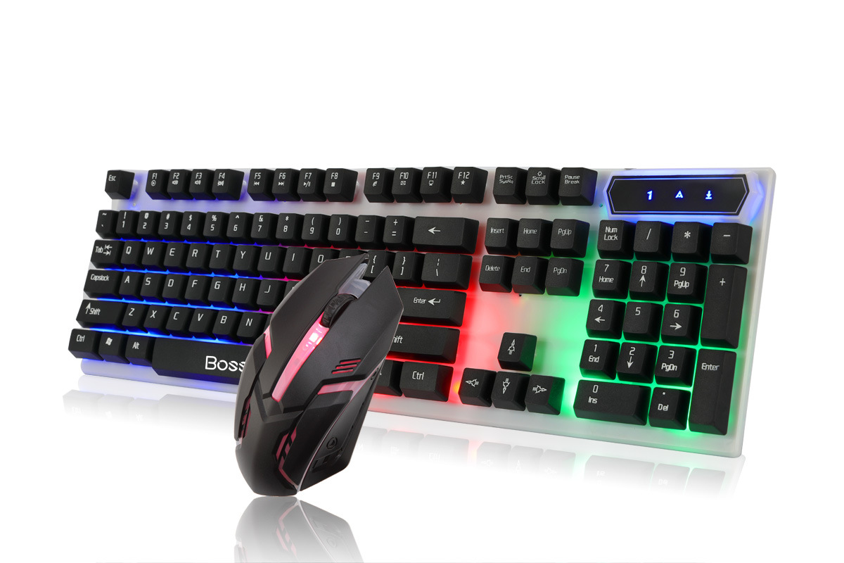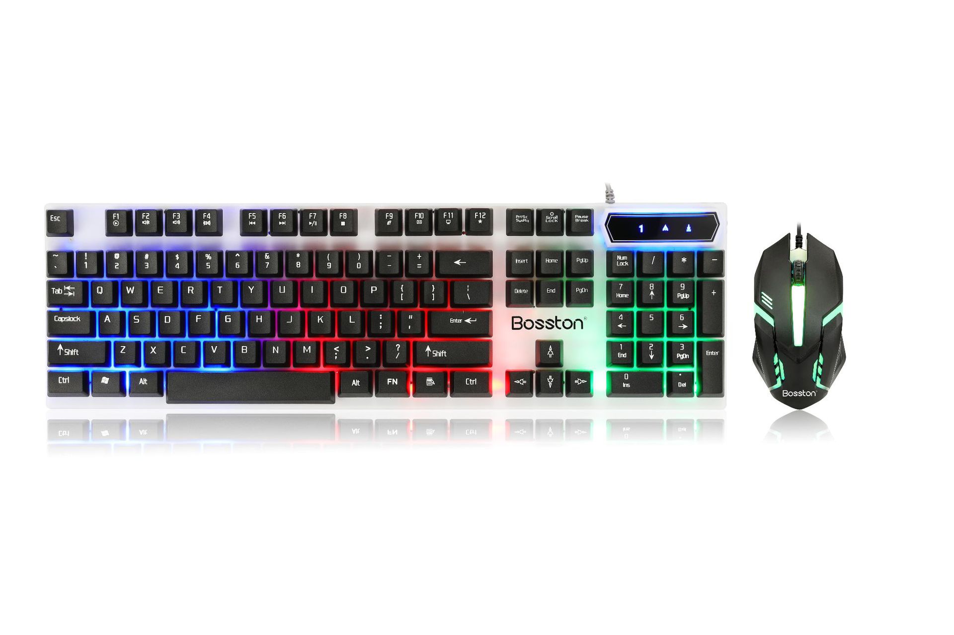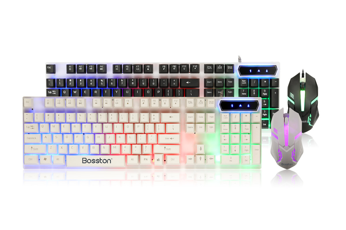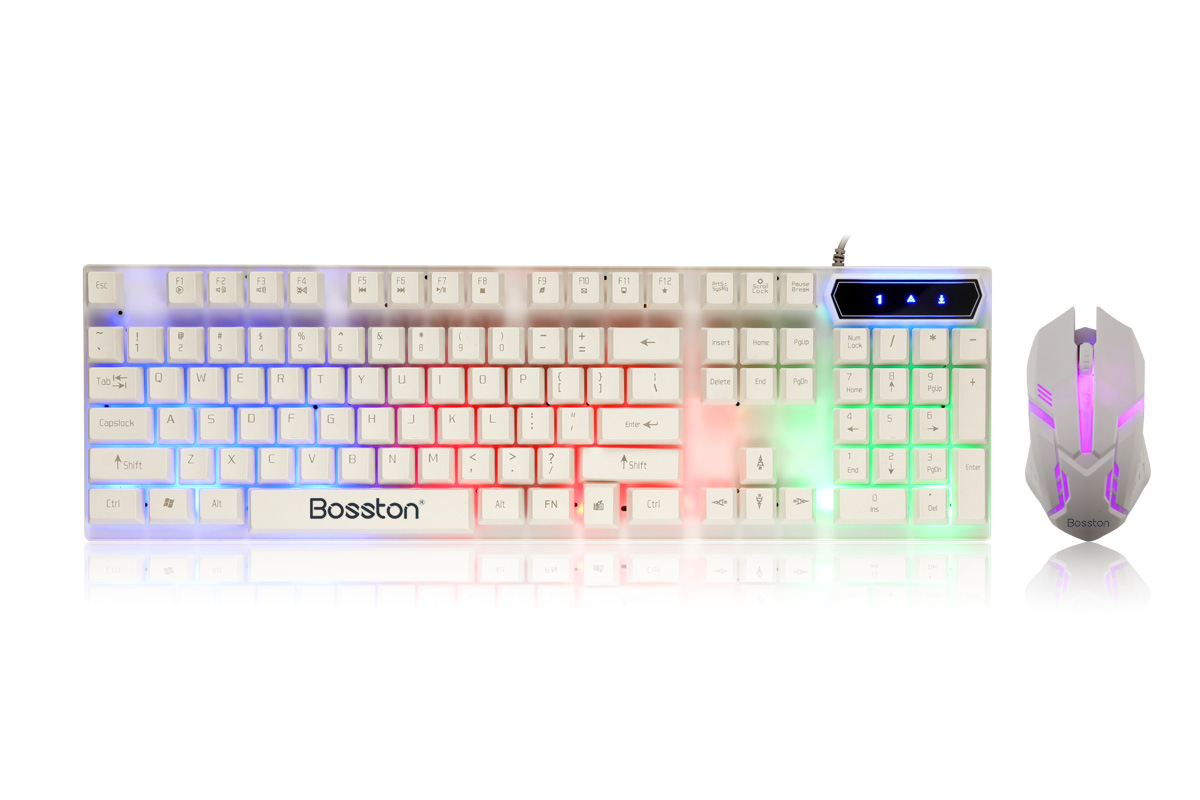 Kit teclado y mouse USB Boston 8310, retroiluminación RGB colorida, diseño suspendido.
