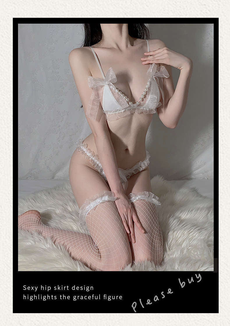 Nueva lencería sexy, encaje de tres puntos, pecho pequeño, gran tentación de perlas, tanga, traje de tentación libre de pasión