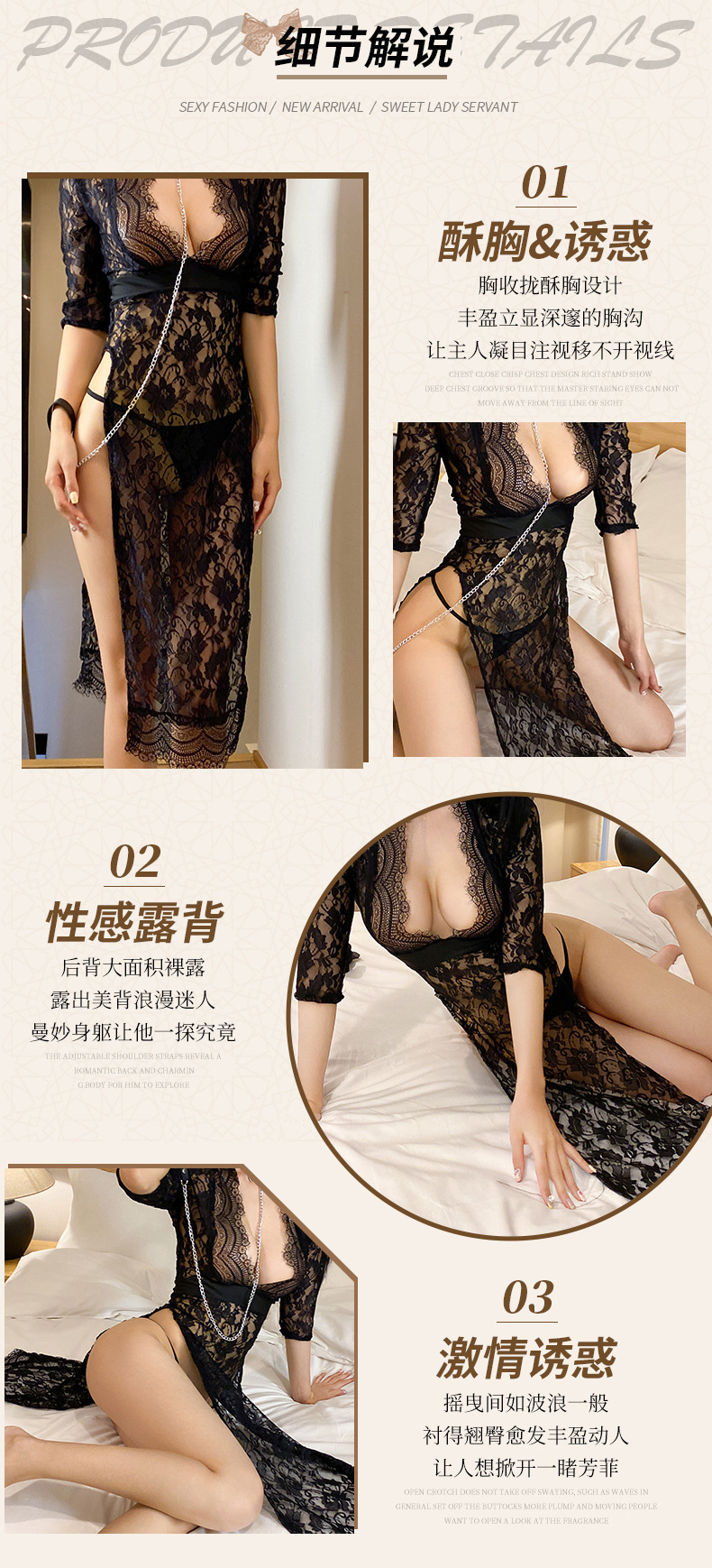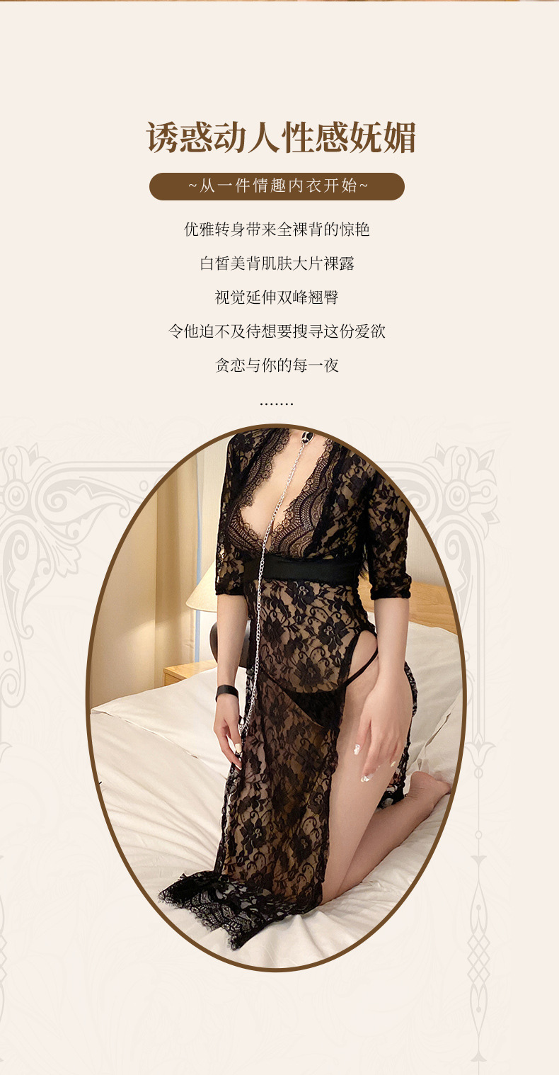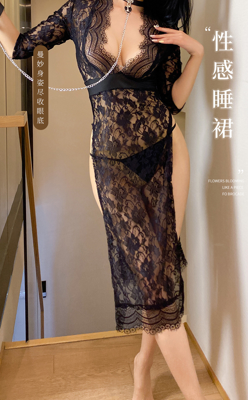 Nueva lencería sexy, falda larga de tentación de encaje sexy, bifurcación lateral caliente, pijamas de uniforme delgado, cabello femenino de una pieza