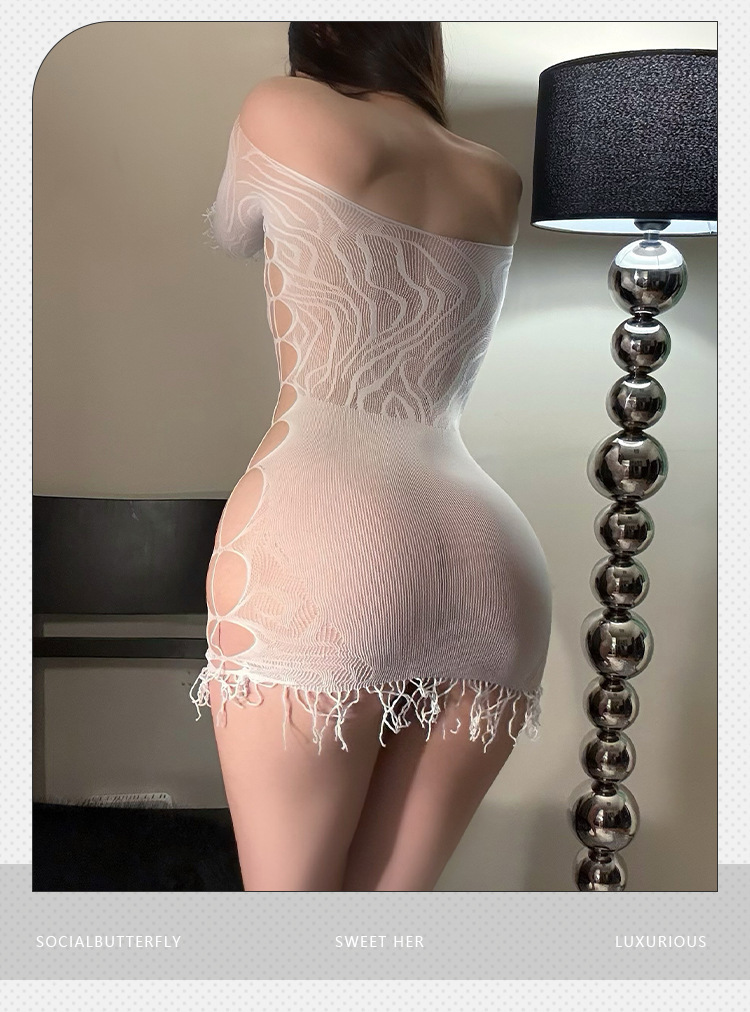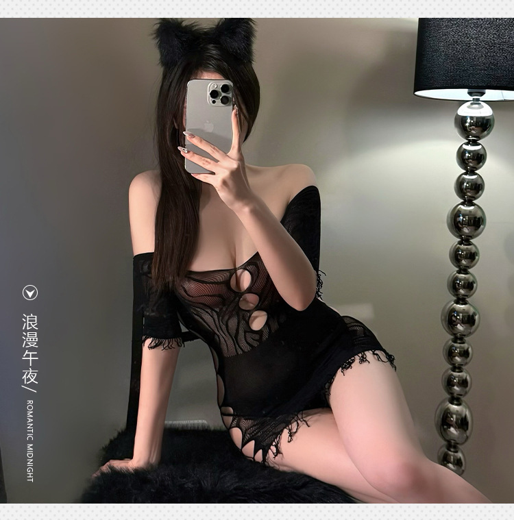Ropa interior sexy gratis 2024 nuevo estilo sexy jacquard de un solo hombro agujero malla vestido uniforme puro deseo de pecho pequeño en nombre del cabello