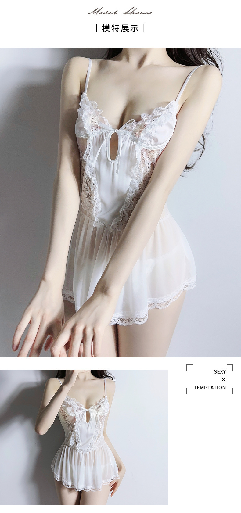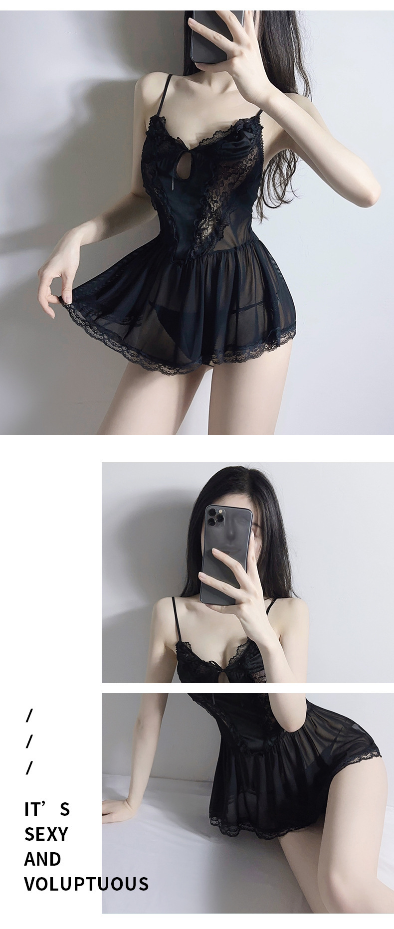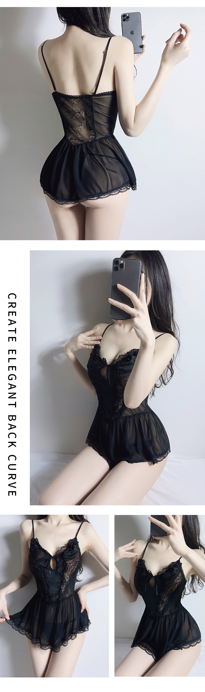 | Colores | Camisón negro,Camisón blanco,Camisón negro medias negras,Camisón negro medias de red negras,Camisón negro medias negras abiertas,Camisón blanco medias blancas,Camisón blanco medias de red blancas,Camisón blanco medias abiertas blancas |