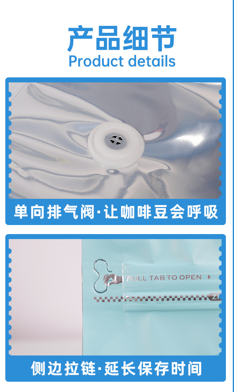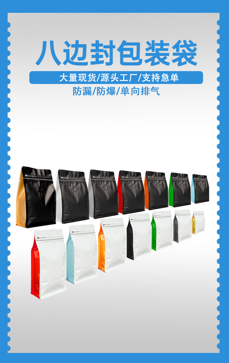 Bolsas de embalaje para alimentos para café, té, refrigerios, bolsas de aluminio autoportantes con cierre zip para granos de café con válvula, bolsas autoportantes con sellado de ocho lados