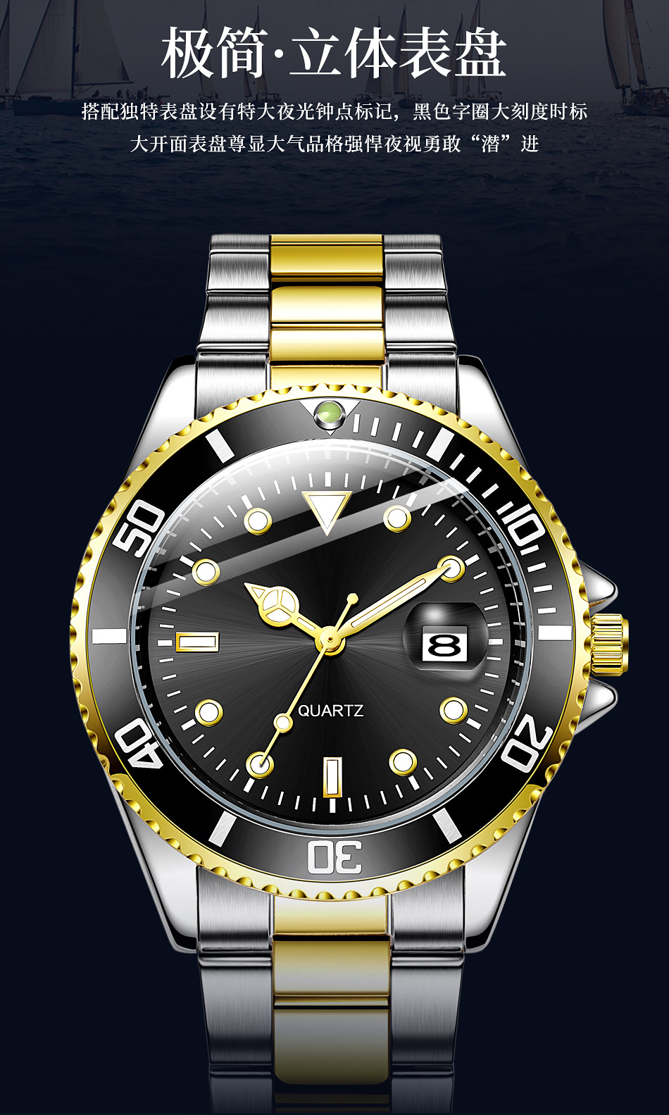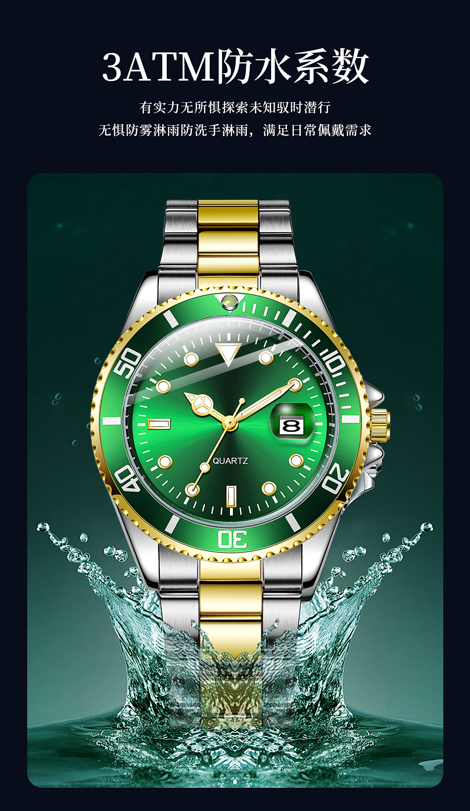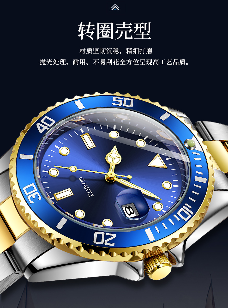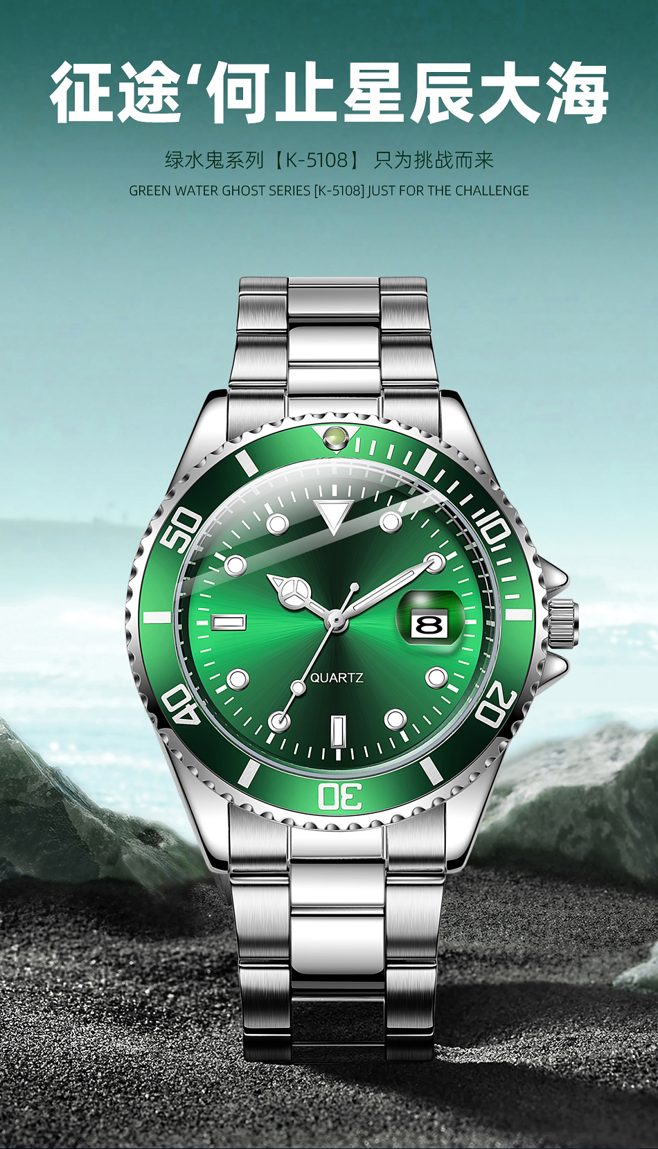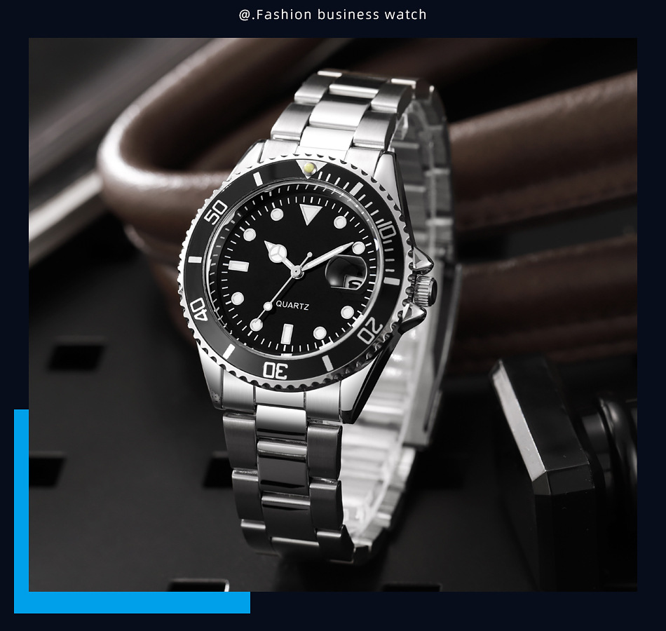 Reloj de cuarzo con calendario de fantasmas de agua verde para hombres de negocios casuales con cinturón de acero, reloj de buceo con espejo de zafiro para hombres en stock