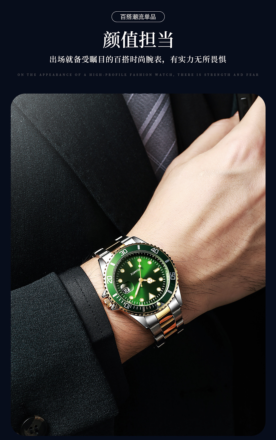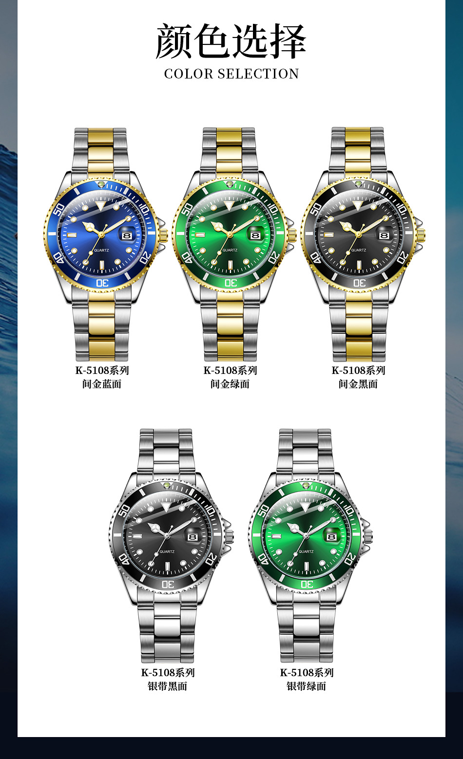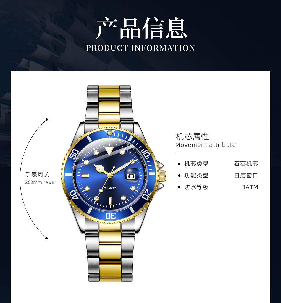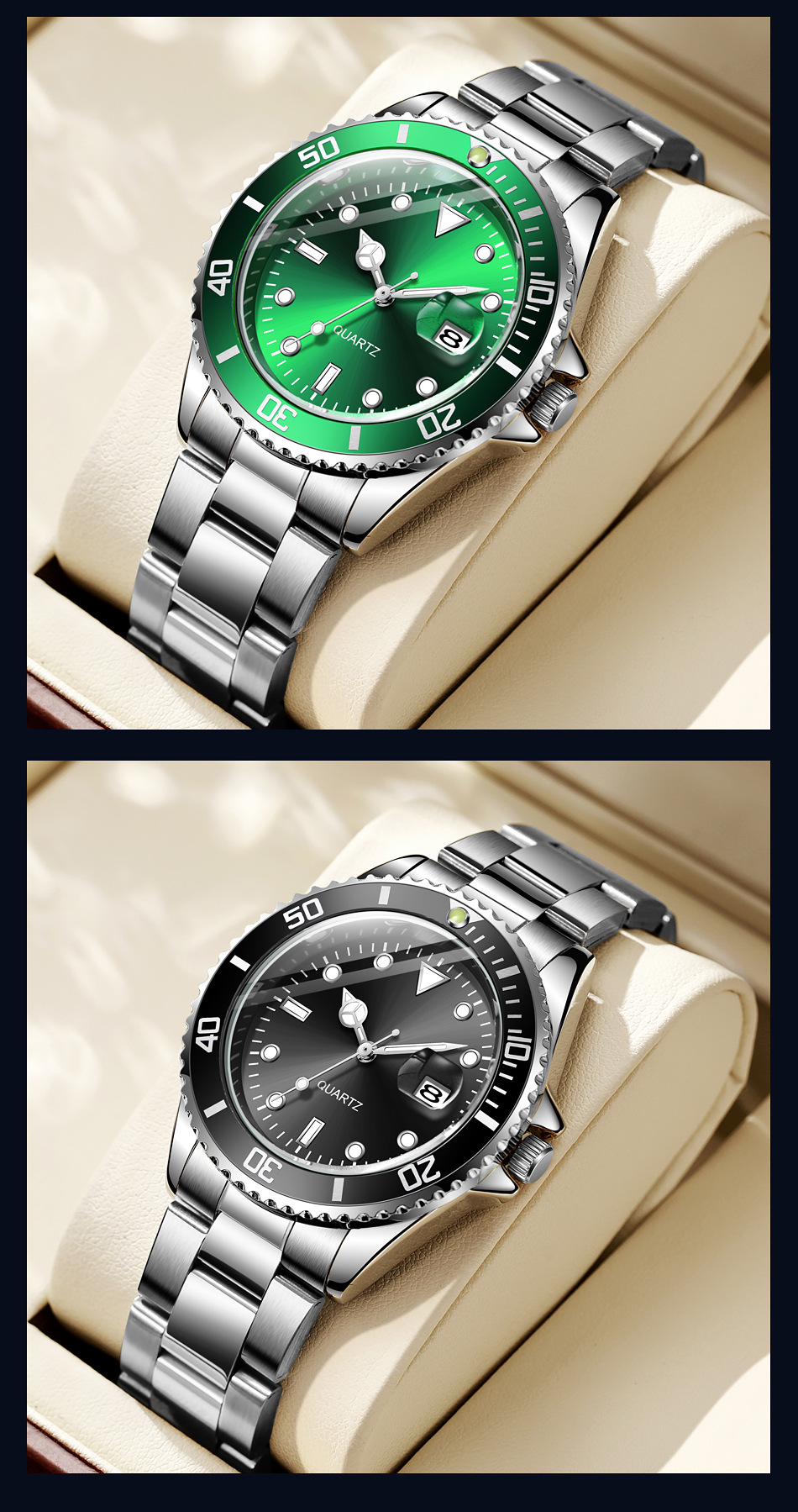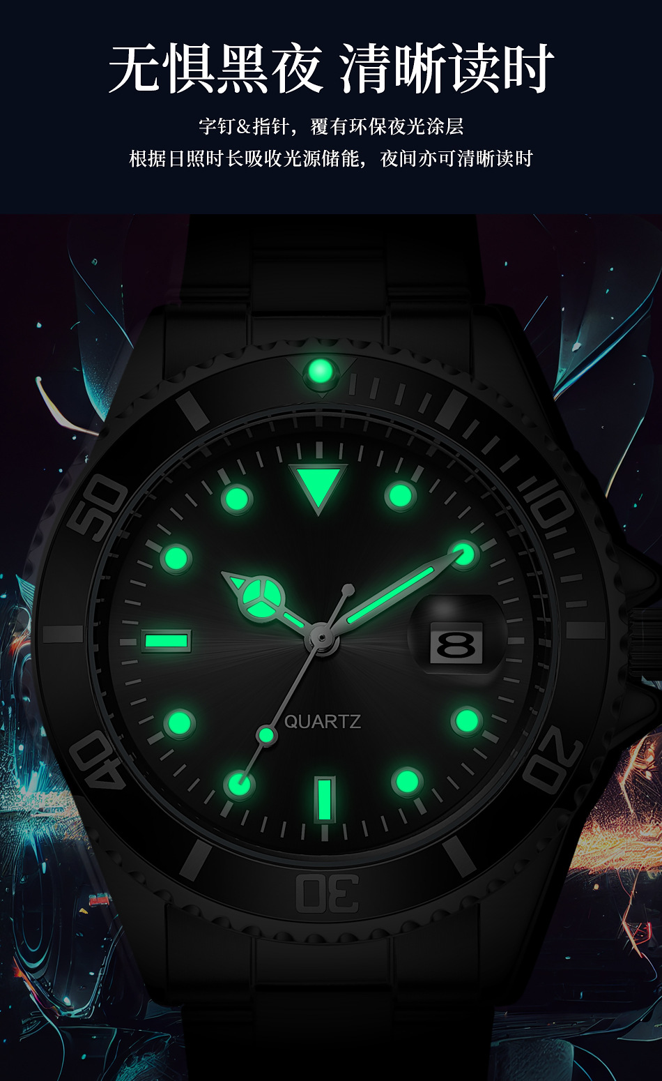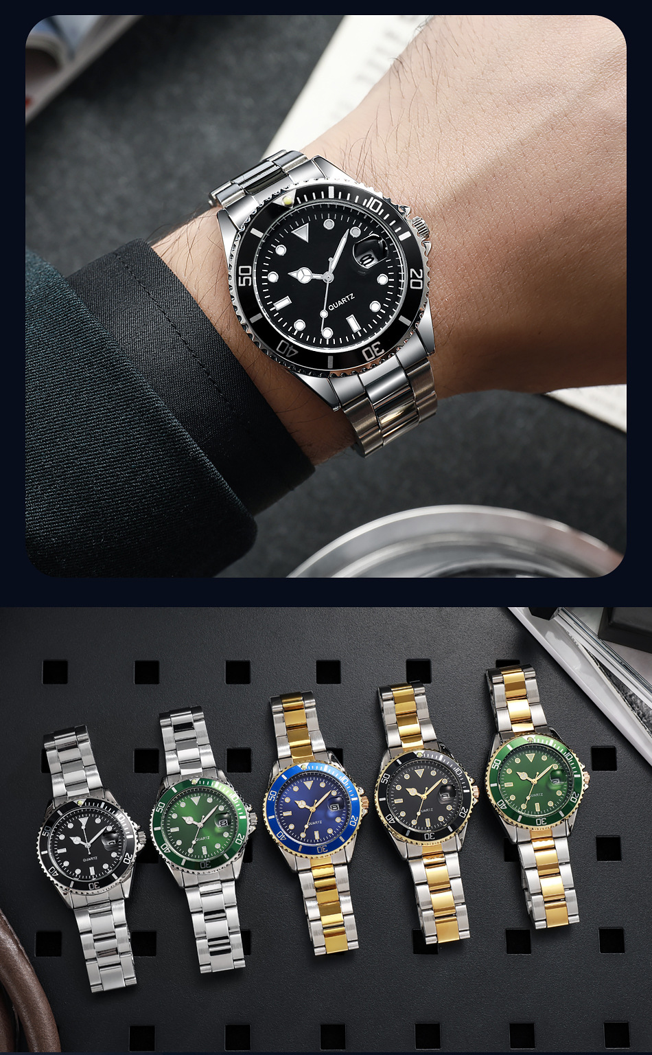 Reloj de cuarzo con calendario de fantasmas de agua verde para hombres de negocios casuales con cinturón de acero, reloj de buceo con espejo de zafiro para hombres en stock