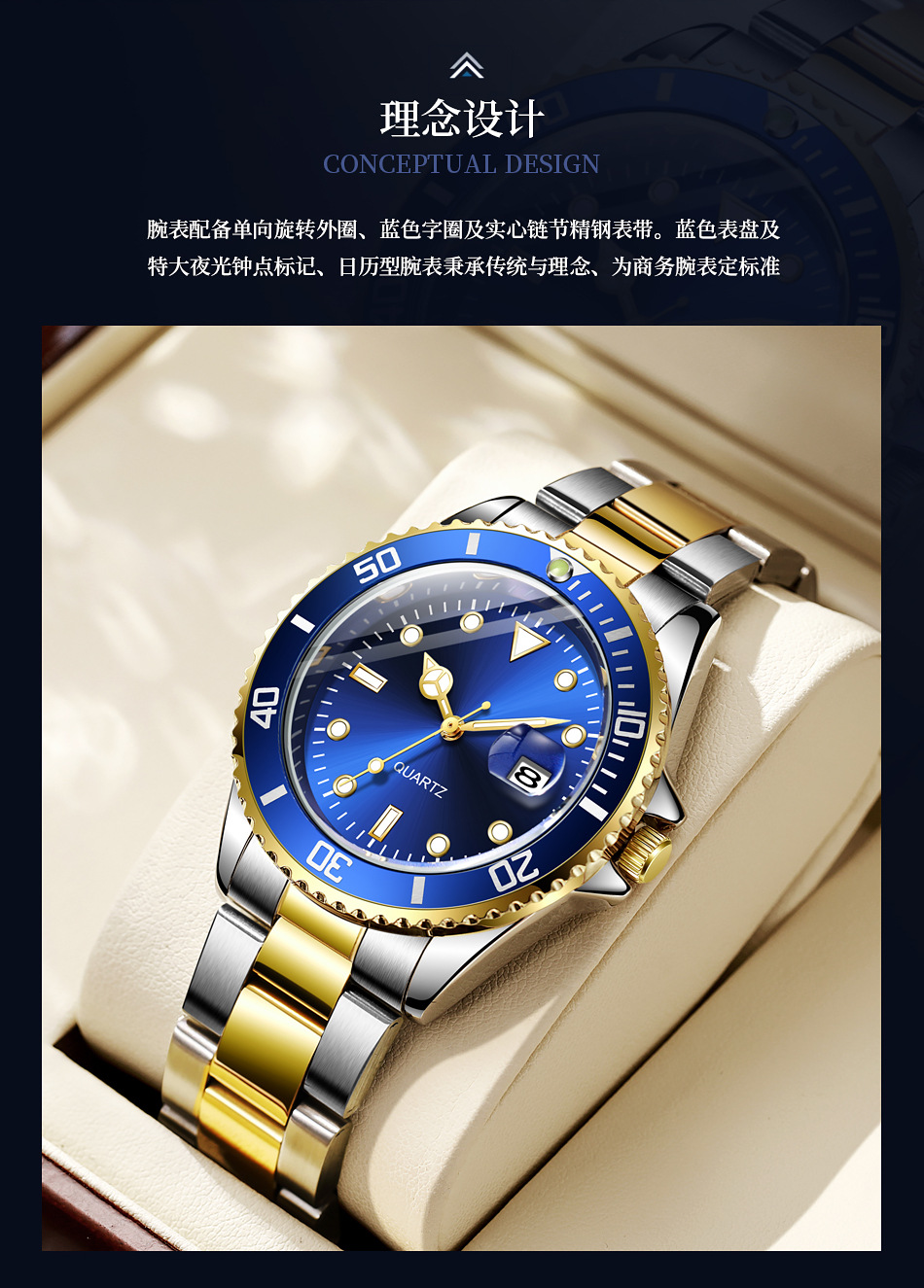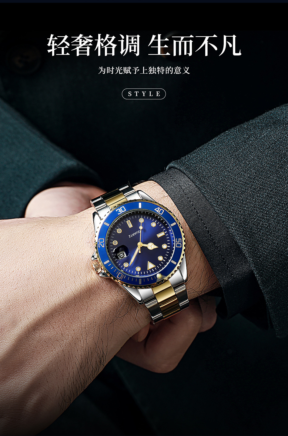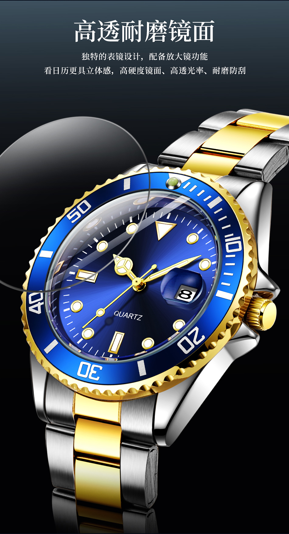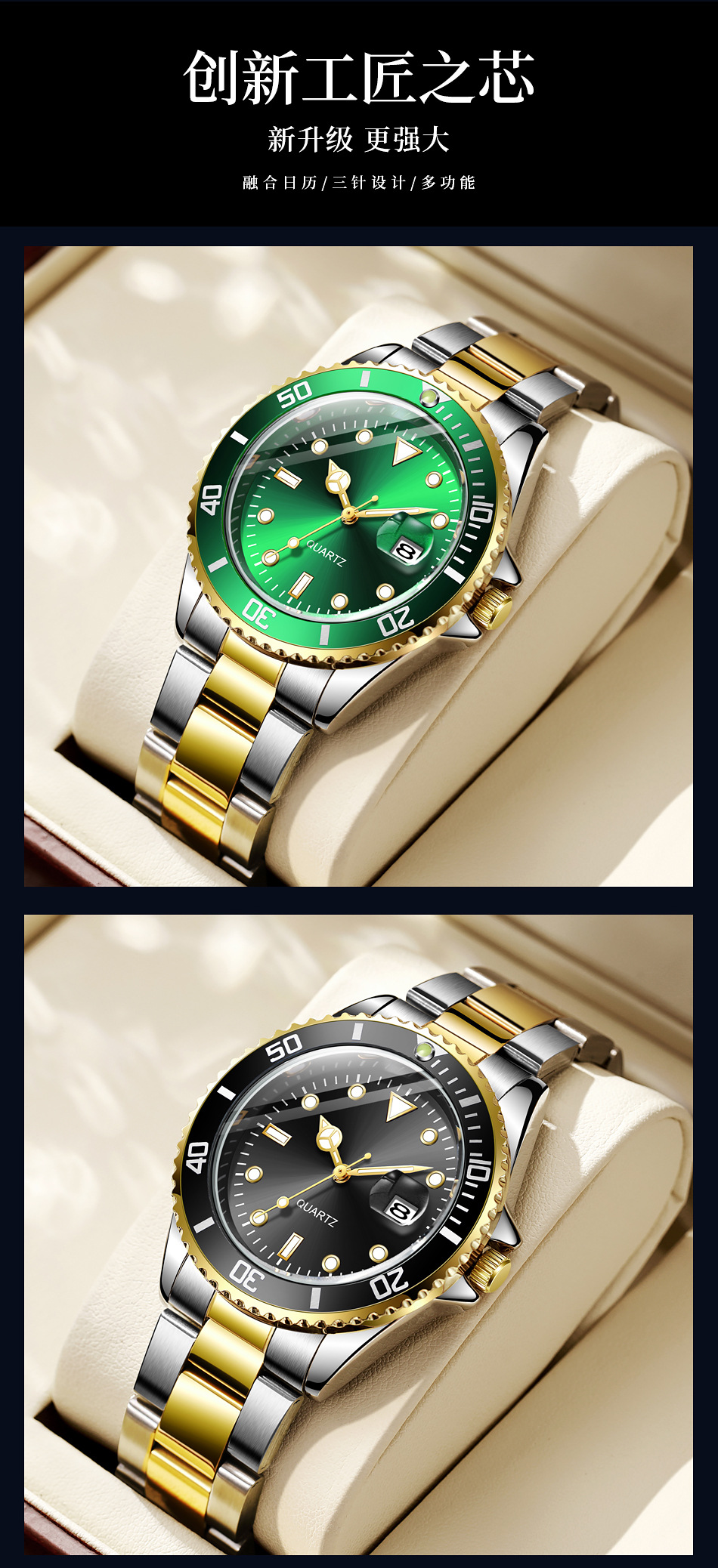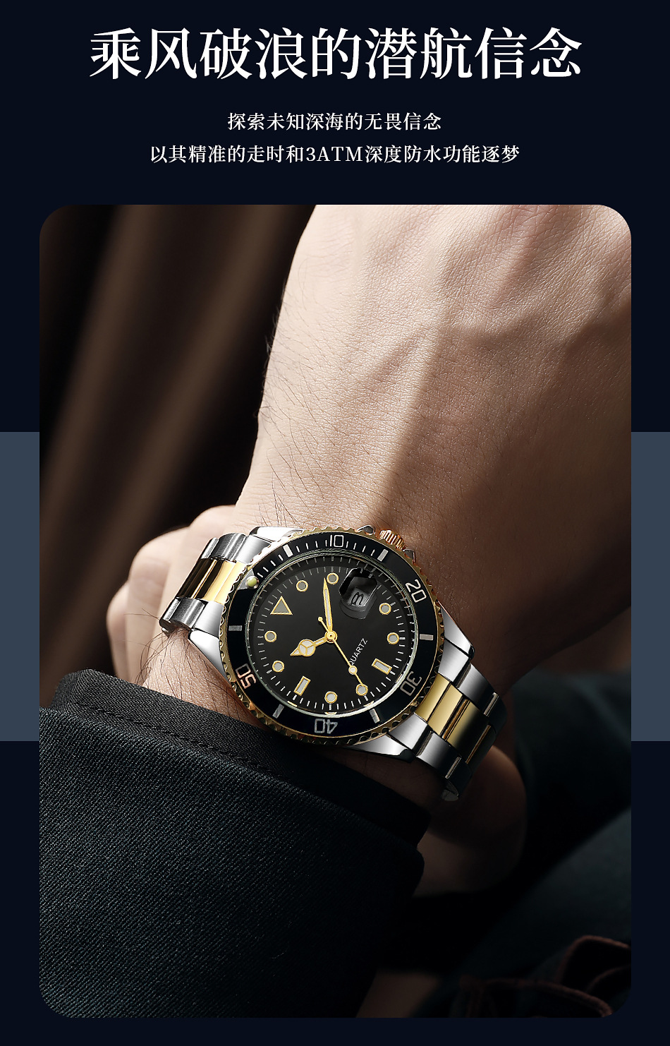 Reloj de cuarzo con calendario de fantasmas de agua verde para hombres de negocios casuales con cinturón de acero, reloj de buceo con espejo de zafiro para hombres en stock