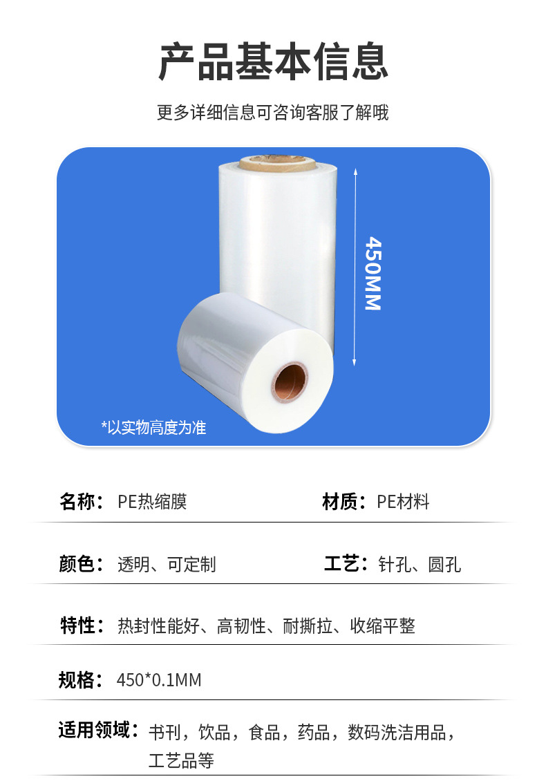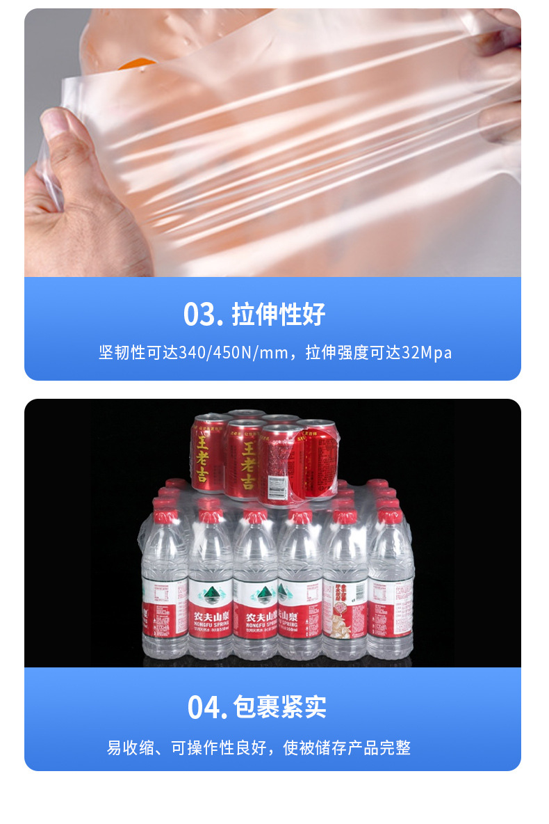 Suministro directo de fábrica de película termorretráctil PE película de envasado de bebidas de agua mineral transparente película termorretráctil película retráctil 450