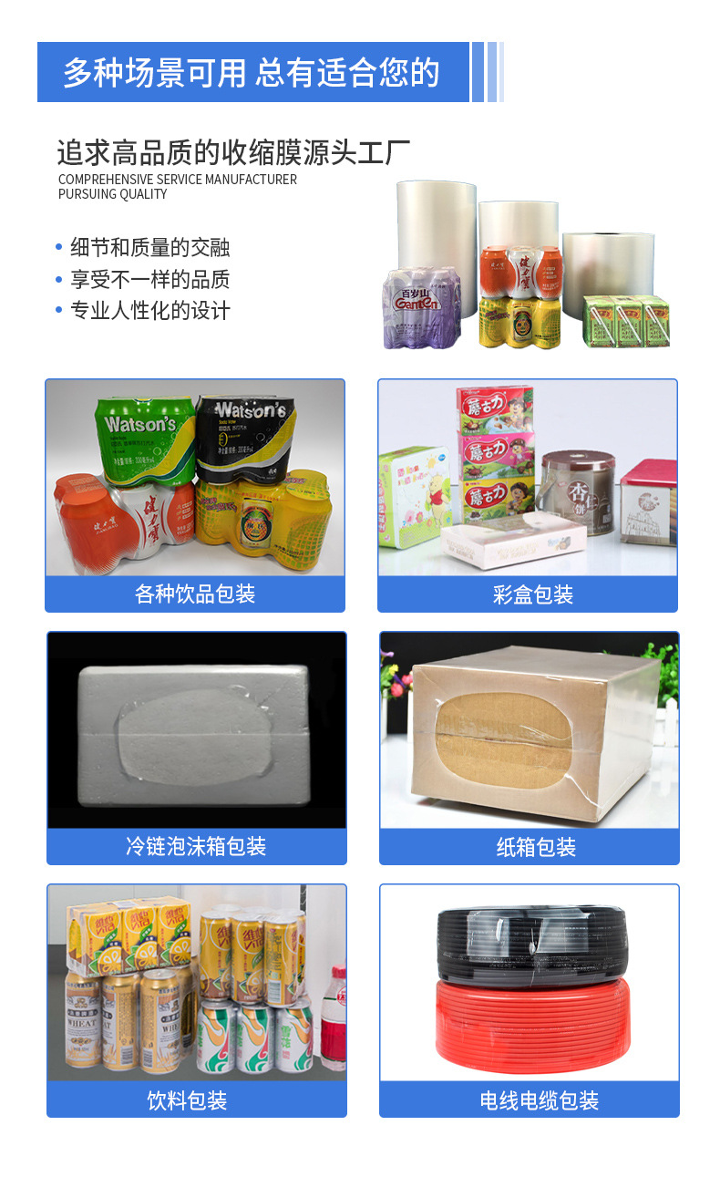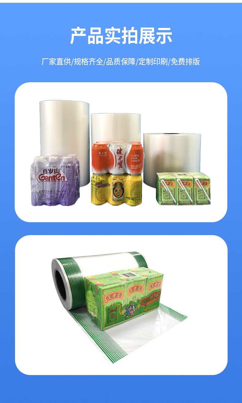 Los fabricantes suministran película retráctil pe película impresa personalizada película termorretráctil embalaje transparente al por mayor película termorretráctil de plástico