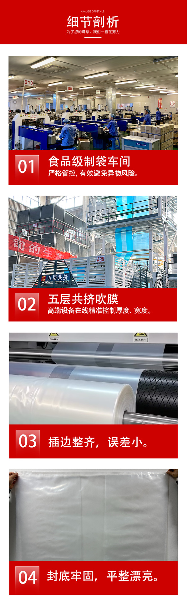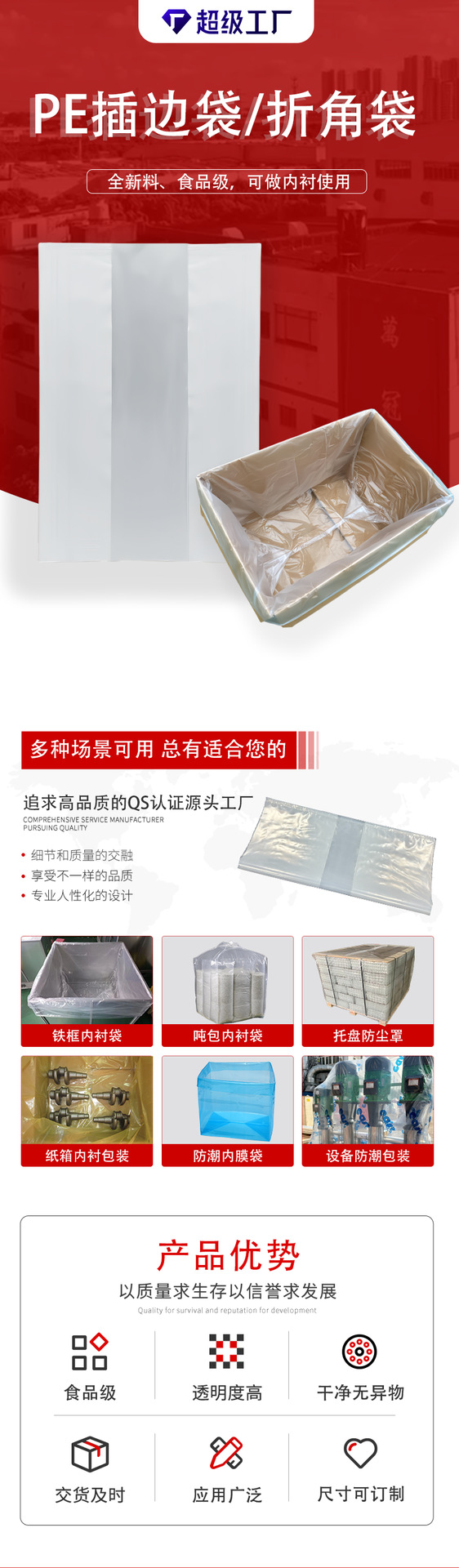 | Usos | Bolsa de revestimiento de cartón, bolsa interior con marco de hierro, bolsa de embalaje exterior de palet, equipo mecánico grande, película de PE a prueba de polvo y humedad, bolsa de revestimiento interior de gran especificación, bolsa de plástico de PE tipo M |
