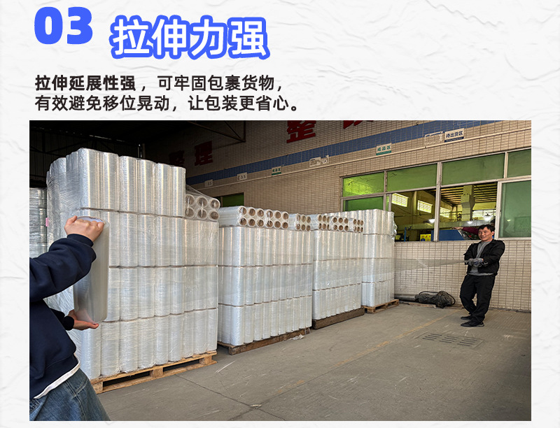 Venta directa de fábrica Película estirable Paquete de PE Película plástica transparente de alta viscosidad Película estirable industrial Película estirable al por mayor