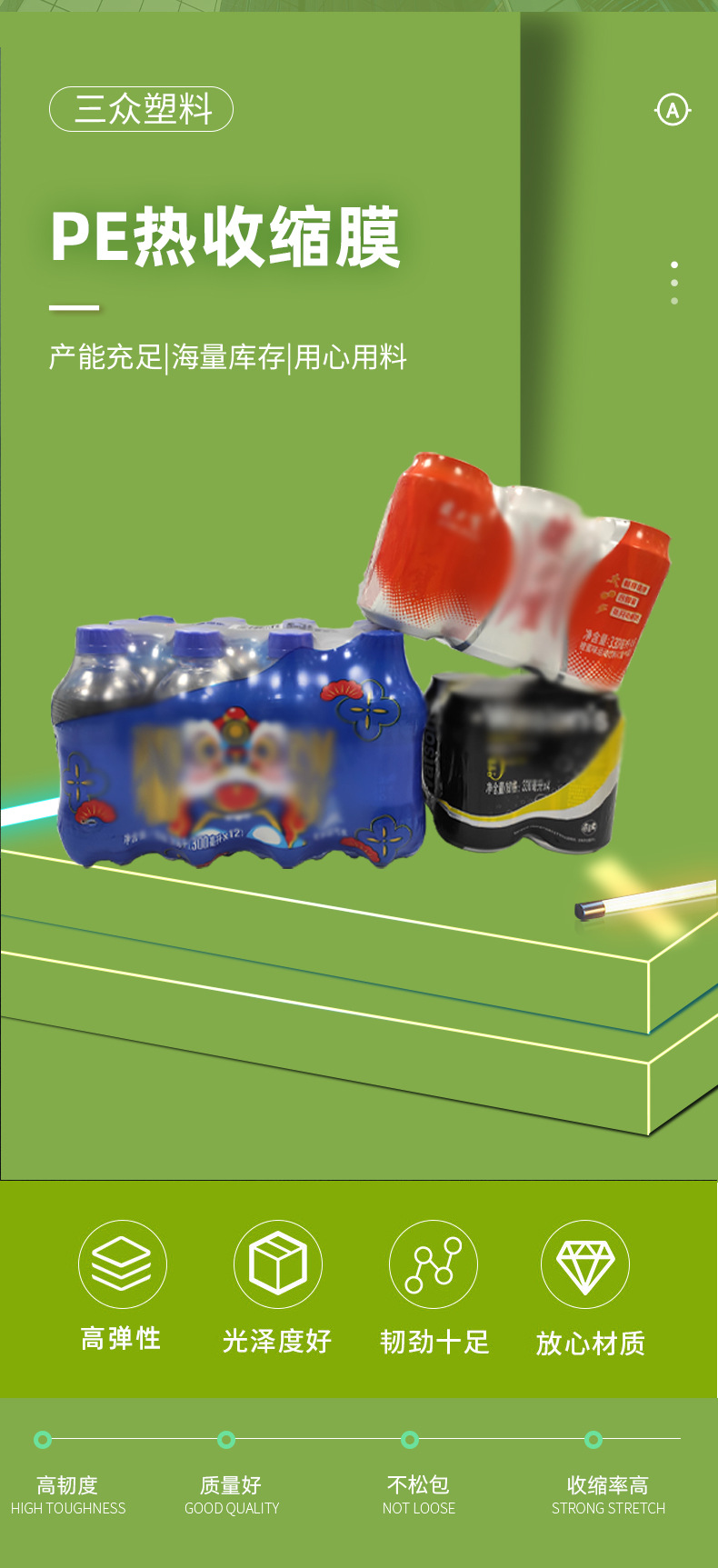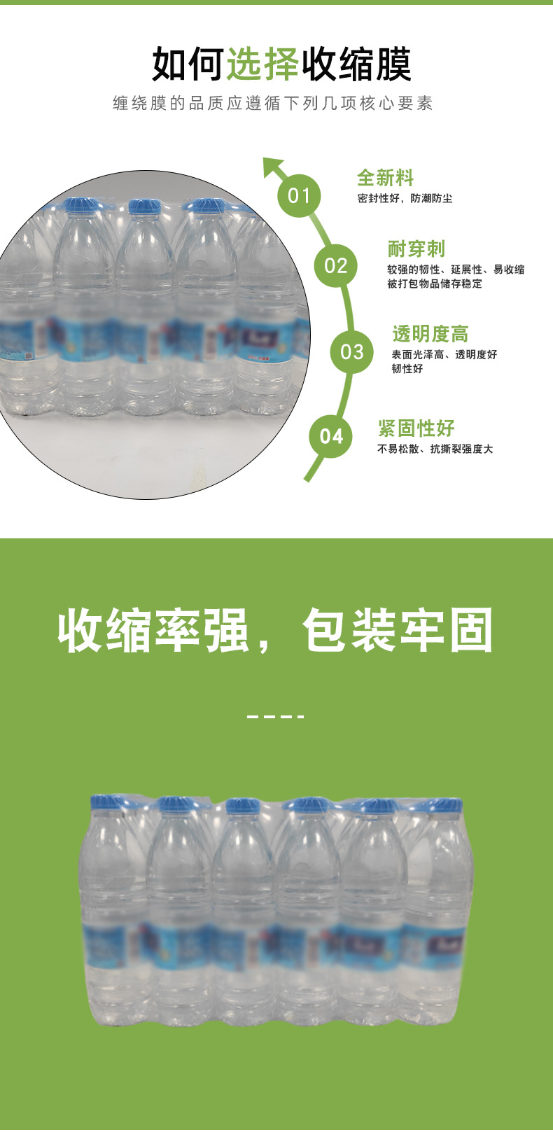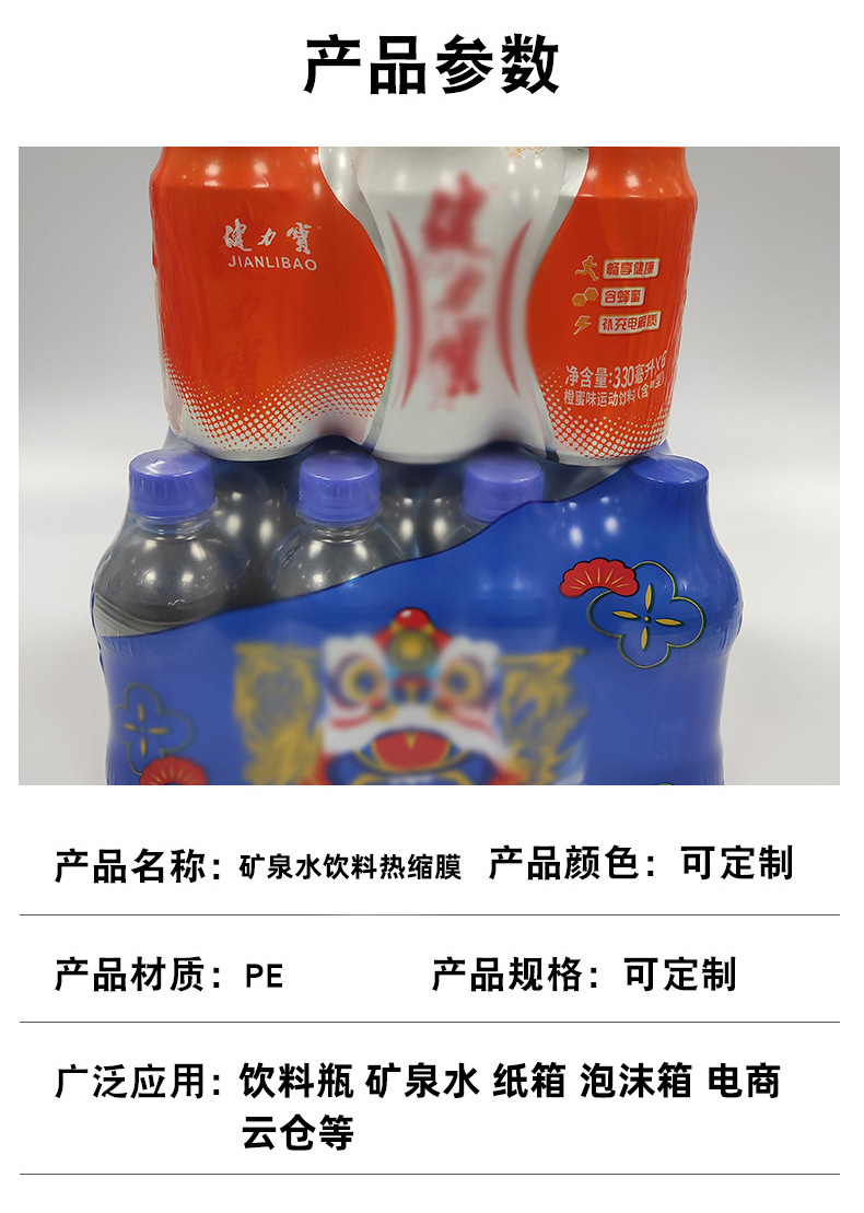 Película termorretráctil al por mayor, botella de bebida, botella de agua mineral, PE, película termorretráctil transparente incolora, paquete de boca de botella de leche de soja, película termorretráctil