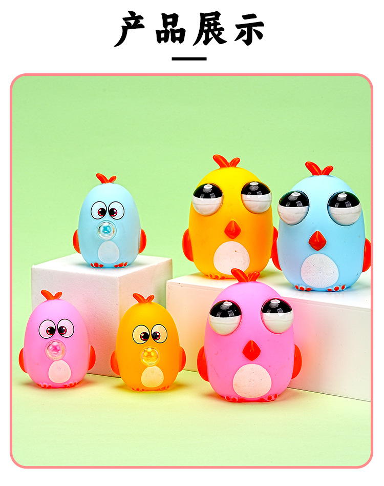 | Colores | El pollo pequeño con ojos grandes se mezcla al azar (400 pcs/caja),Pollo de gran tamaño con ojos grandes mezclados al azar (150 cajas),Pollo de burbujas (400 cajas),Pollo burbujeante luminoso (400 cajas),Ojos expuestos |