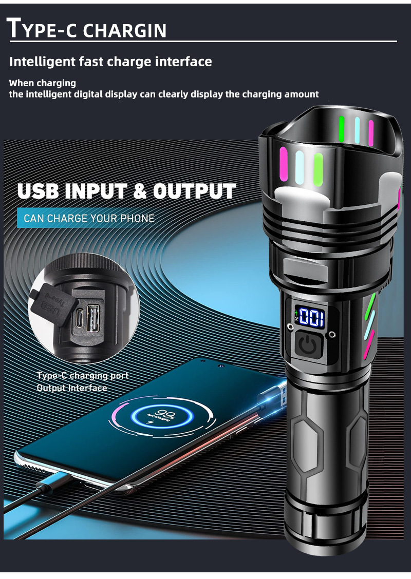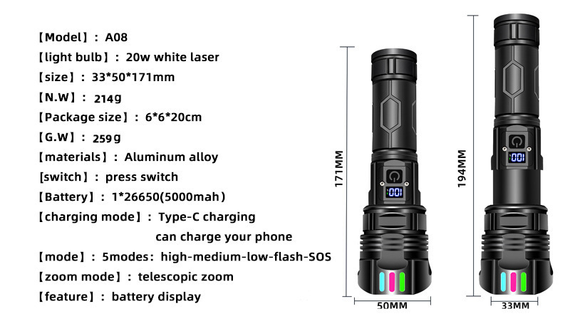| Colores | Cable de datos TYPE-C en caja de color A09 1*26650 batería de litio (3000mah),A09 caja de regalo cable de datos TYPE-C 1*26650 batería de litio (5000mah),Cable de datos TYPE-C en caja de color A08 1*26650 batería de litio (3000mah),A08 caja de regalo cable de datos TYPE-C 1*26650 batería de litio (5000mah) |