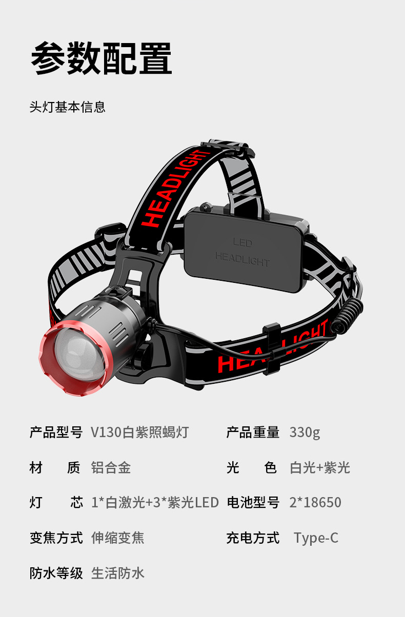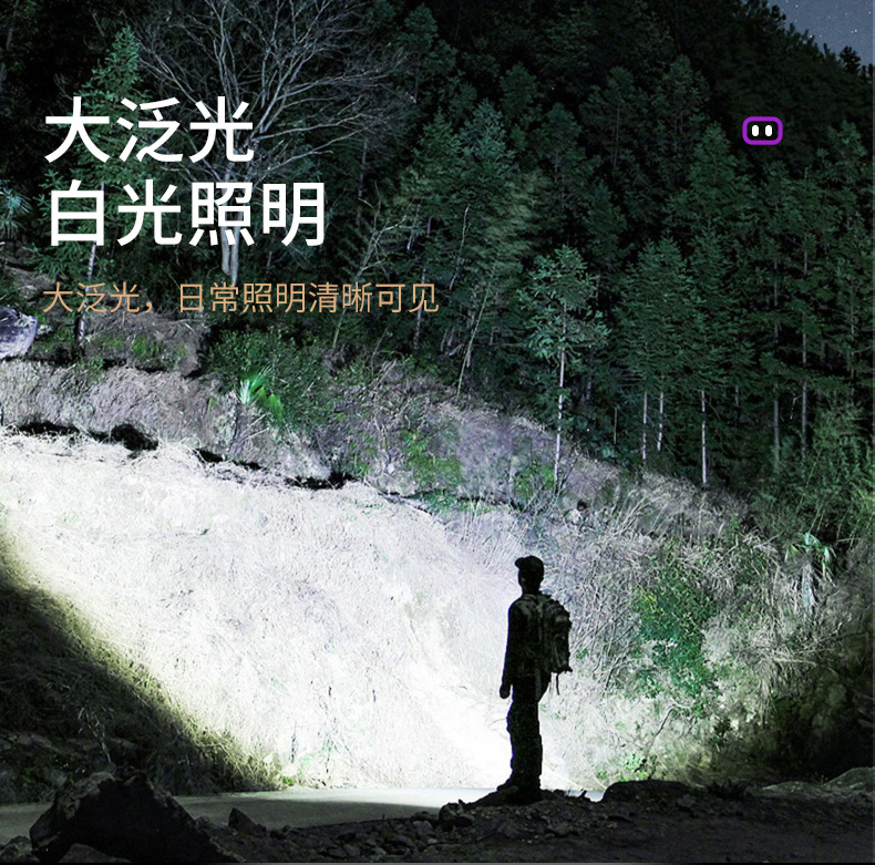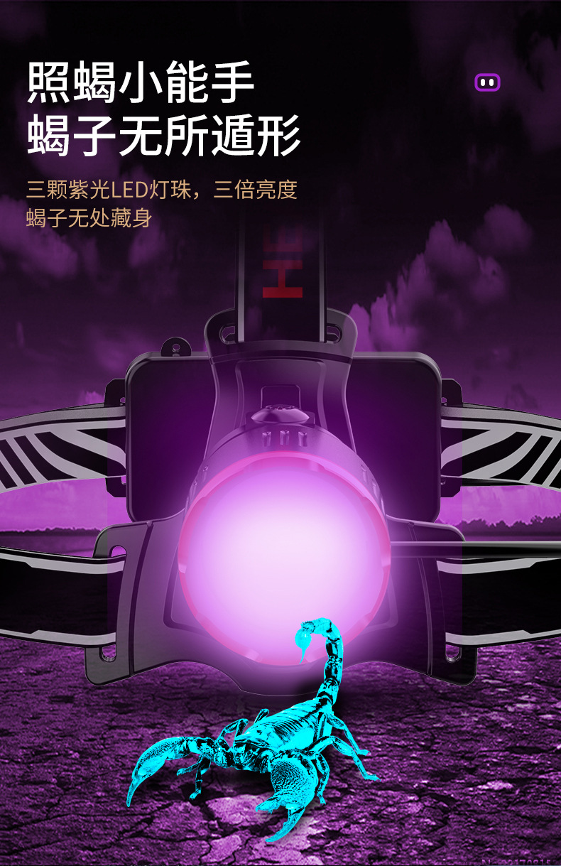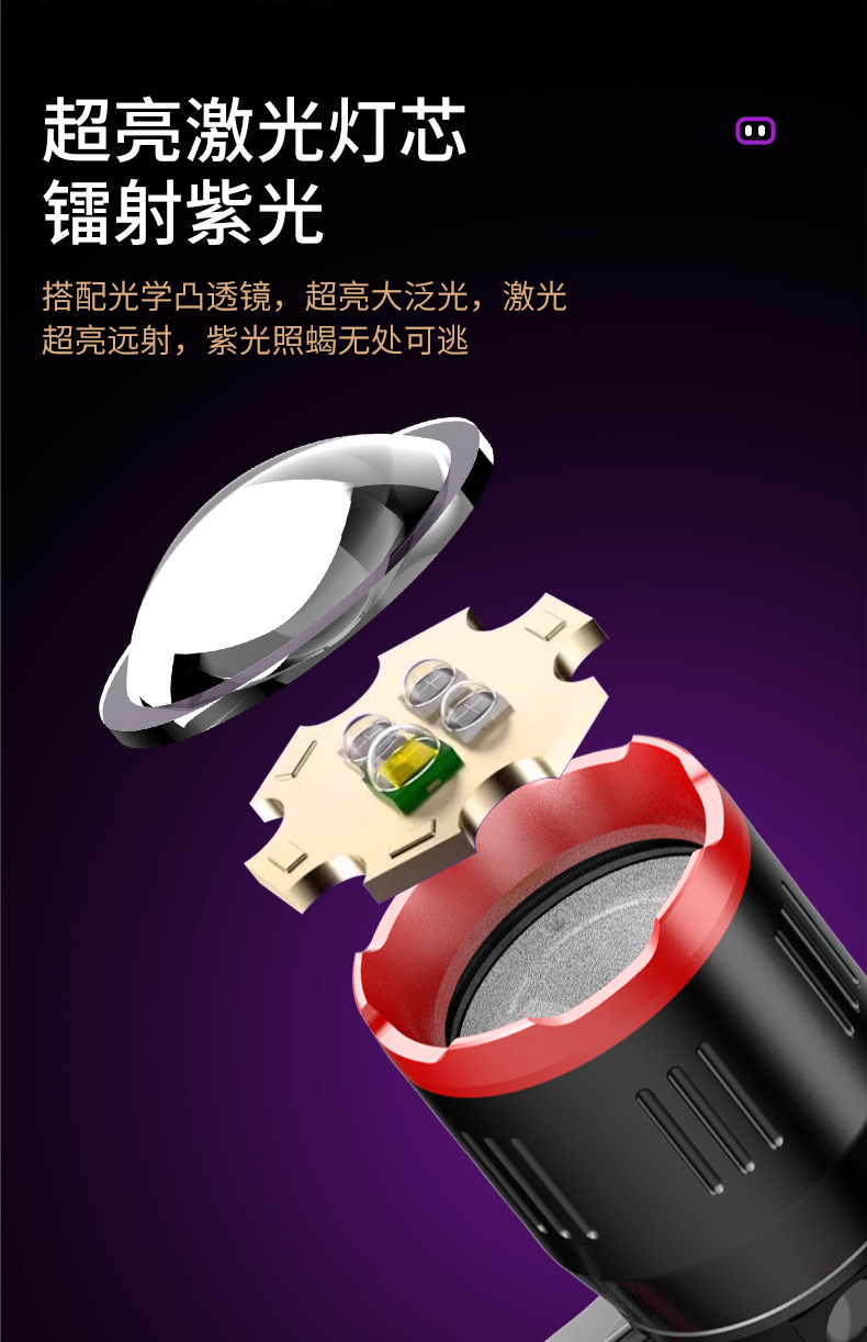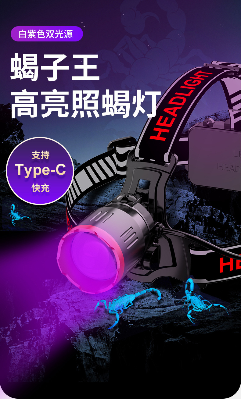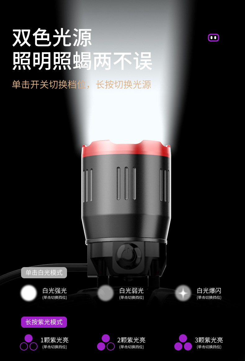 Faros de luz violeta de luz blanca, viajes al aire libre, pesca nocturna, faros de luz fuerte, batería recargable de largo alcance, faros de aleación de aluminio al por mayor