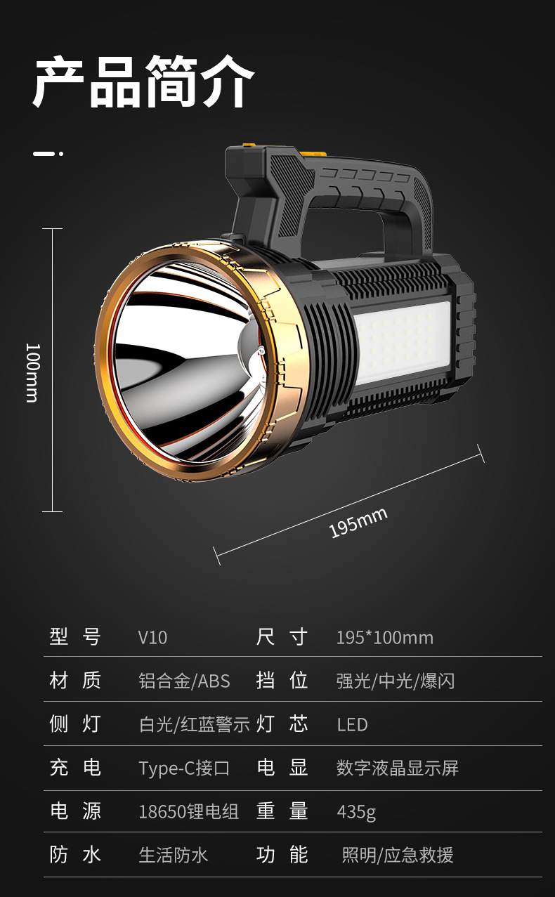 Salida de pantalla digital V10 2*1200 batería 96 tazas 45 mecha luz lateral de plástico dorado (blanco) luz de advertencia roja y azul