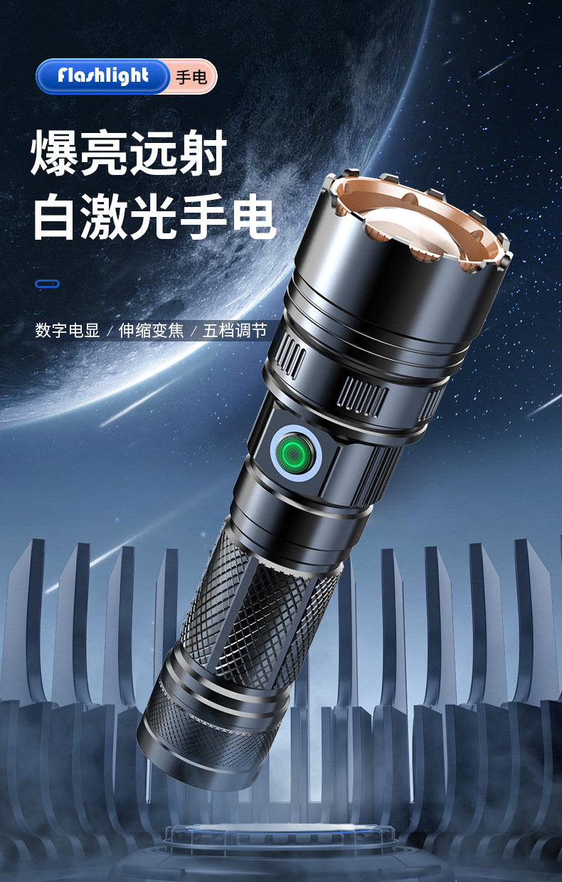 Cola digital linterna eléctrica láser blanco aleación de aluminio telescópica zoom linterna luz fuerte tiro largo linterna al por mayor