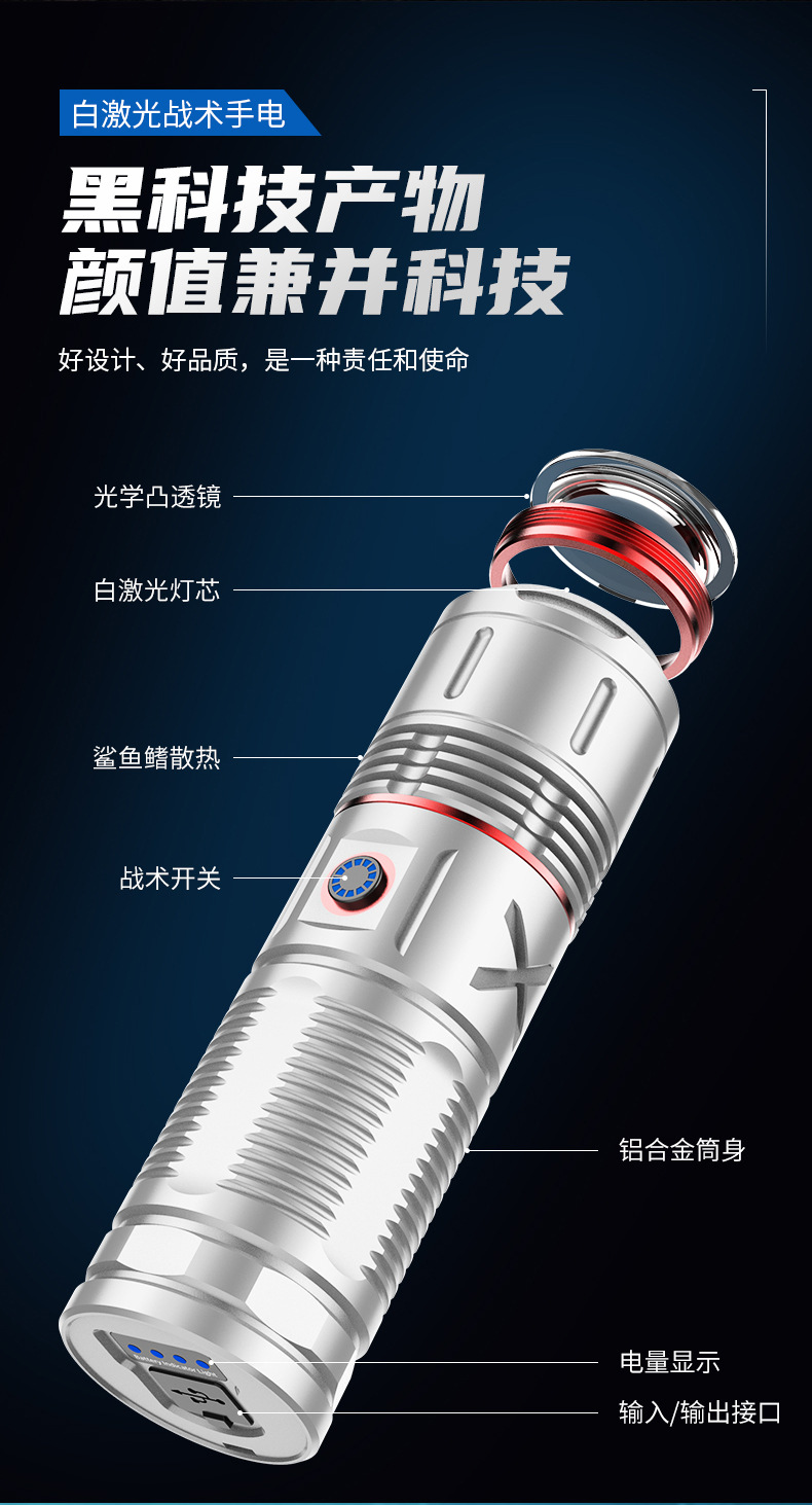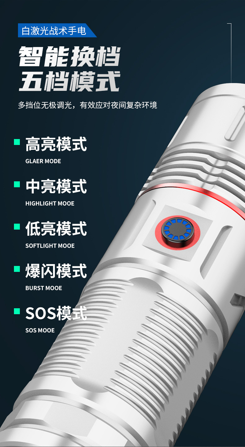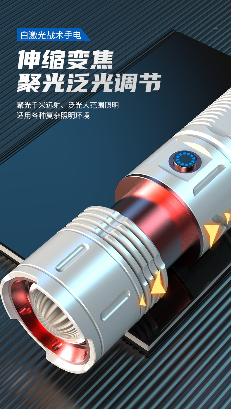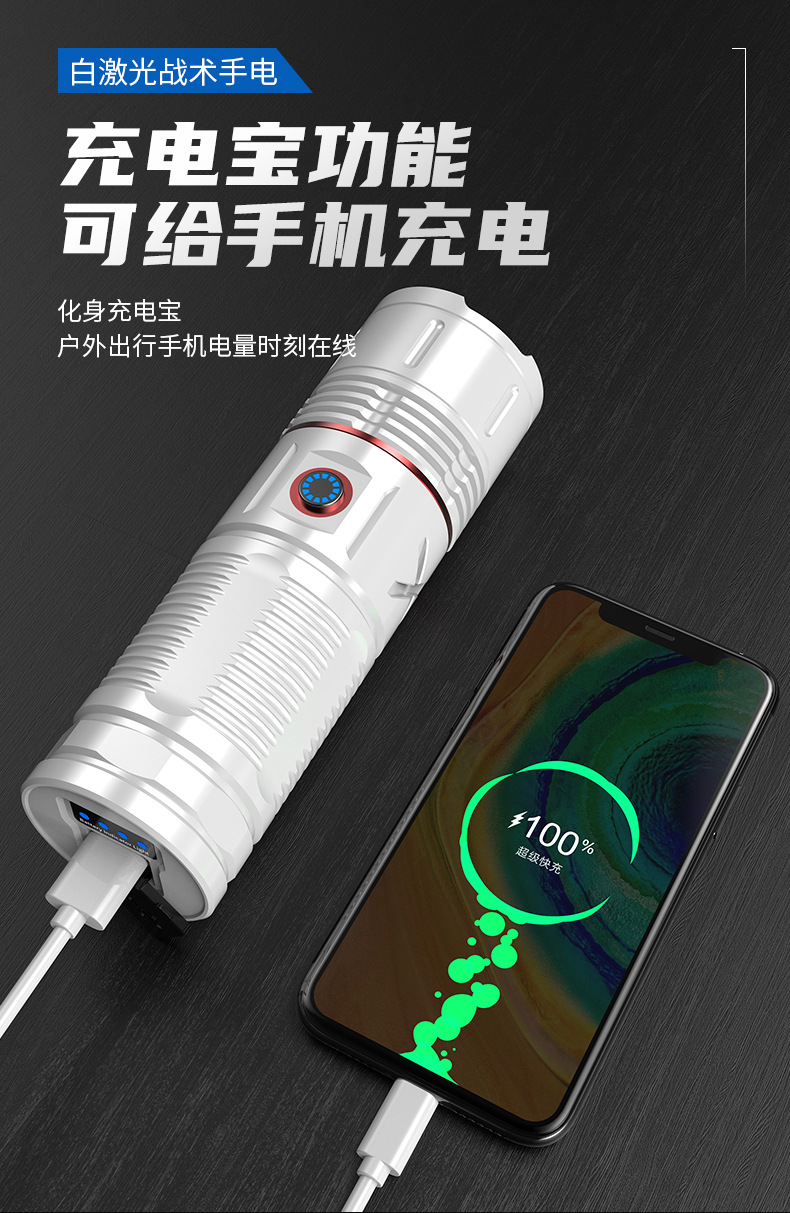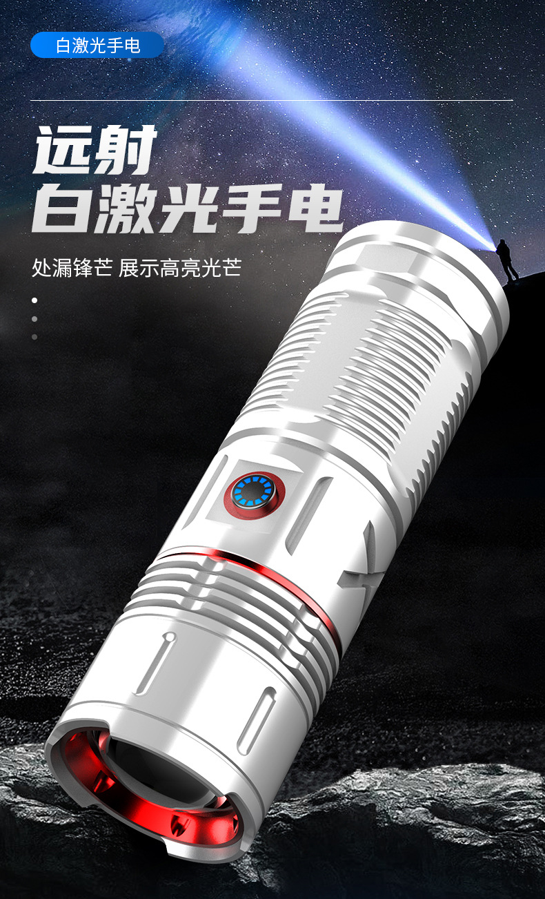 Nueva linterna de plata al aire libre láser blanco proyector remoto Tipo-C de carga rápida cola pantalla eléctrica linterna de zoom telescópico
