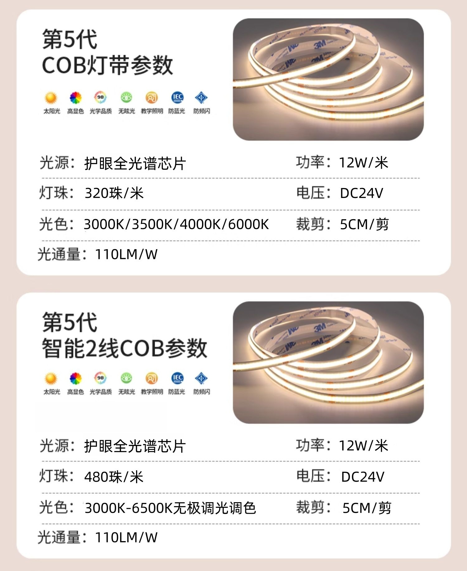 Tira de Luz LED COB de Espectro Completo para Protección Ocular, Barra de Luz LED, Una Luz Un Corte, 12V Inteligente a Prueba de Agua, Tira de Luz de Bajo Voltaje de 24V