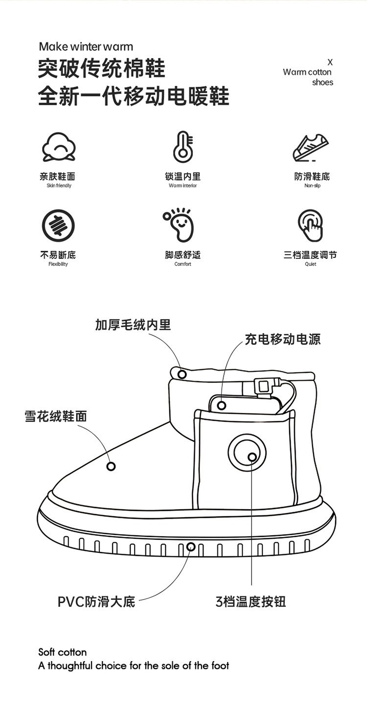 Grafeno zapatos calientes eléctricos pies no congelantes zapatos para caminar pies calientes artefacto calefacción zapatos para el hogar invierno cálido control de temperatura zapatos de algodón