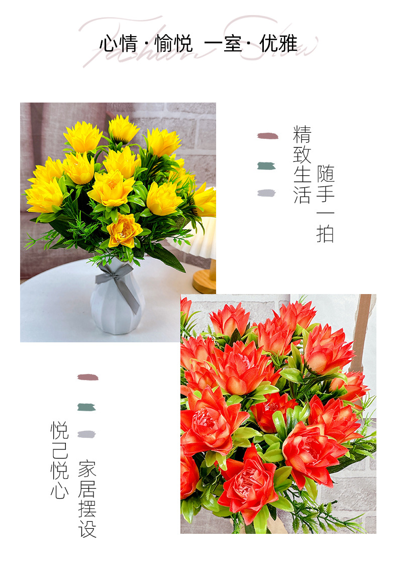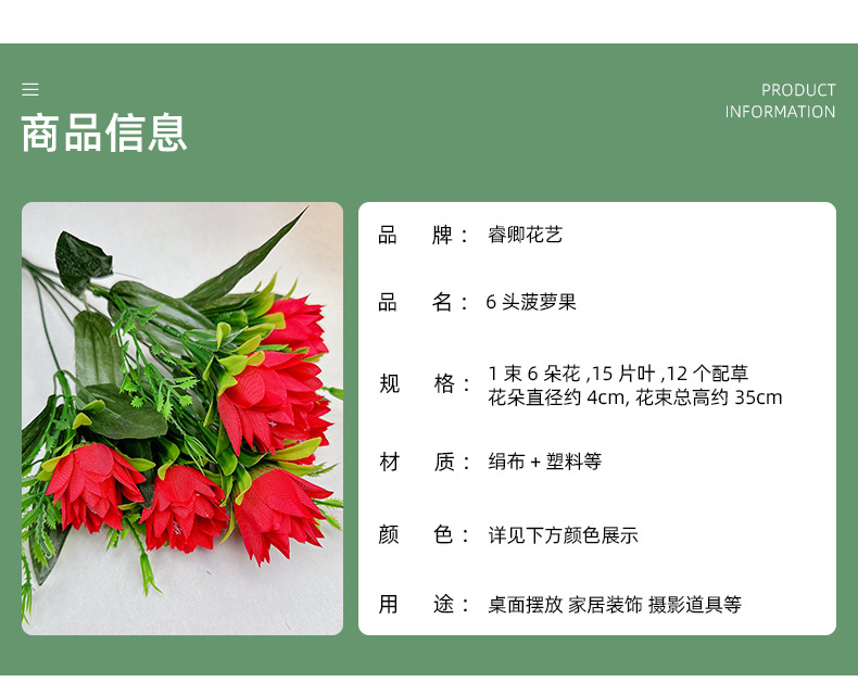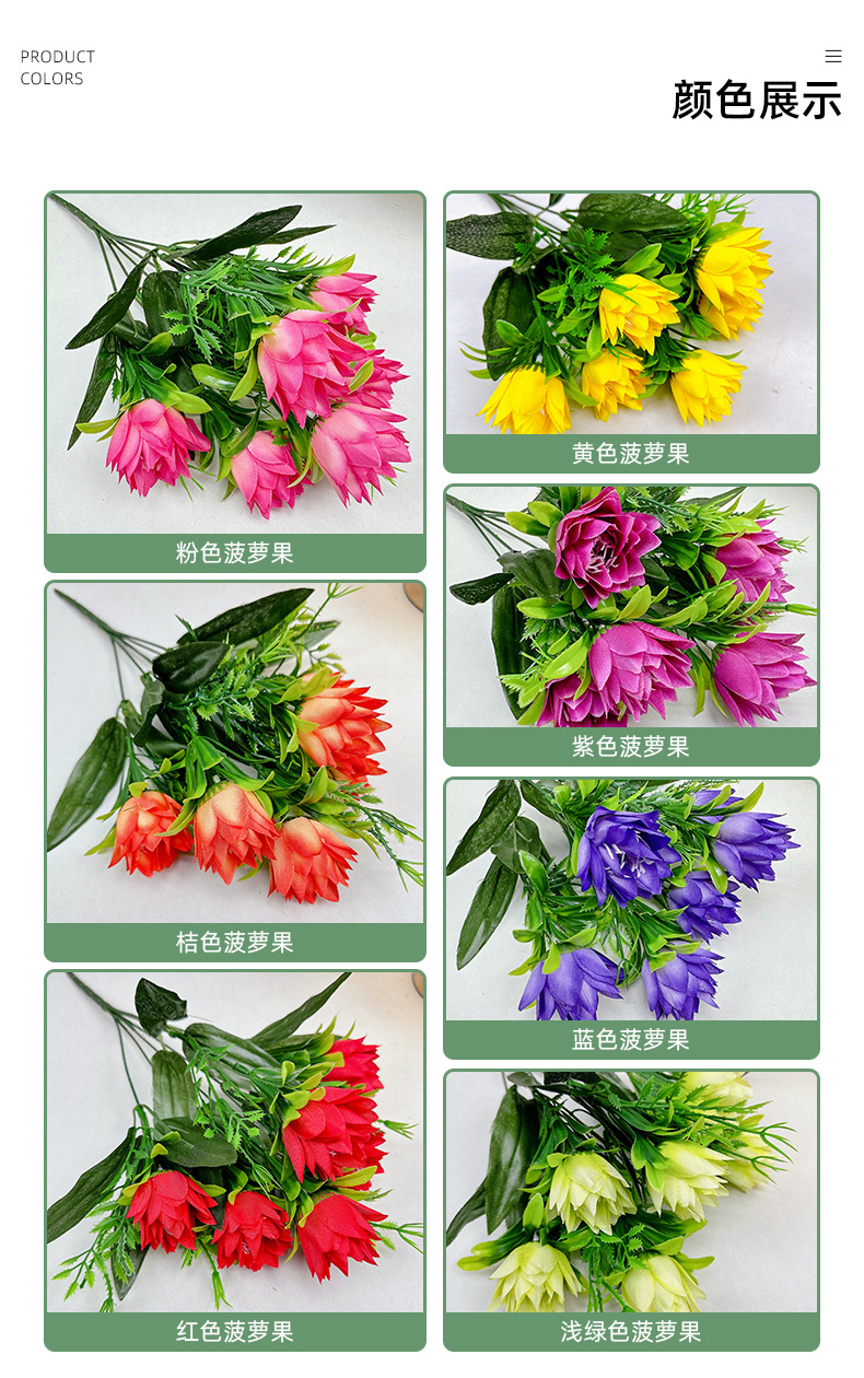 | Colores | 6 cabezas de piña rosa 1 paquete,6 cabezas de piña naranja 1 manojo,6 cabezas de piña roja 1 manojo,6 cabezas de piña amarilla 1 manojo,6 cabezas de piña púrpura 1 paquete,6 cabezas de piña azul 1 paquete,6 cabezas de piña verde claro 1 manojo,6 piñas de color champán claro 1 paquete |