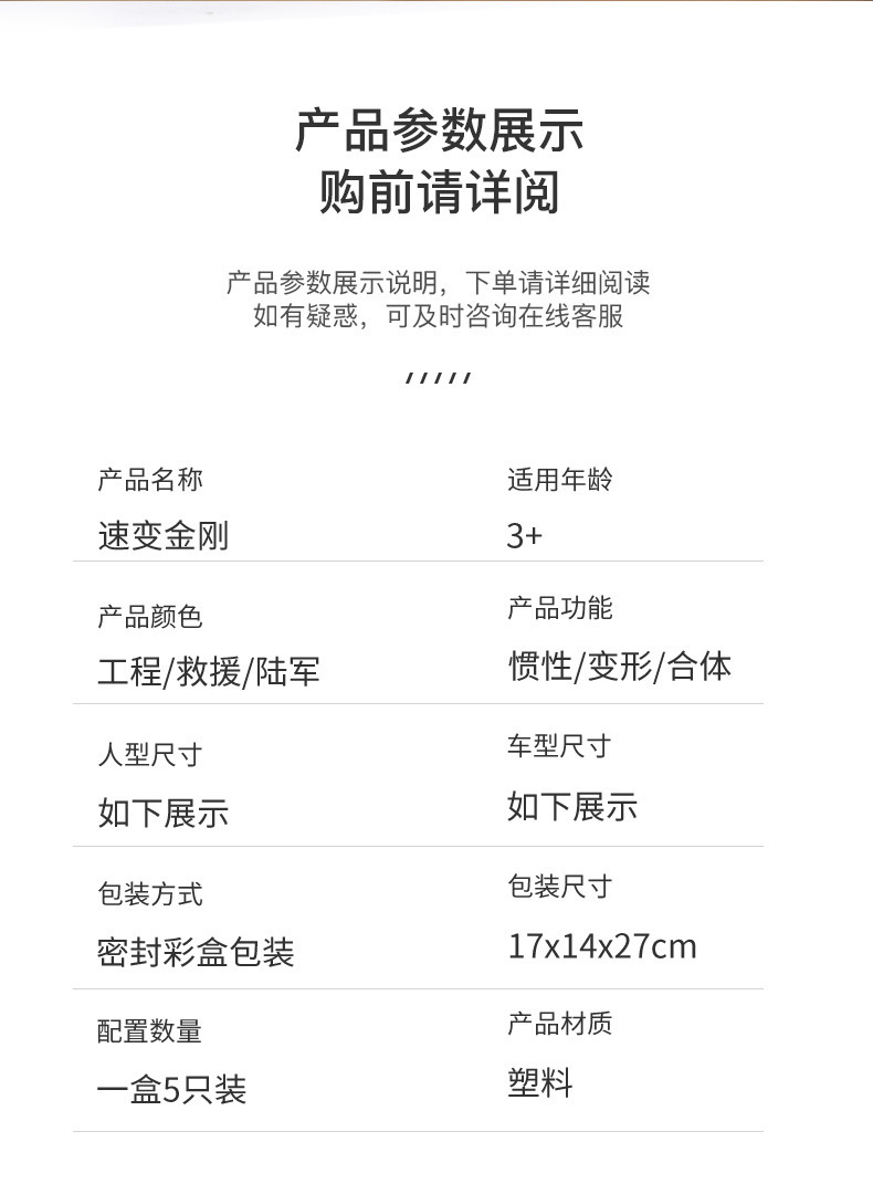 | Colores | Dinosaur Engineering King Kong-[Caja de color] (Contiene 5 piezas, se puede usar en 1 juego),Dinosaur Fire Pioneer-[Caja de color] (Contiene 5 piezas, se puede usar en 1 juego),Battle of Dinosaur Army-[Color Box] (Contiene 5 piezas, se puede usar en 1 juego),Dinosaur Engineering King Kong-[paquete opp] excavadora,Dinosaur Engineering King Kong-[paquete opp] grúa,Dinosaur Engineering King Kong-[paquete opp] coche de madera de captura,Dinosaur Engineering King Kong-[Opp] Camión mezclador,Dinosaur Engineering King Kong-[paquete opp] aspersor,Dinosaur Fire Pioneer-[Paquete opp] Excavadora,Dinosaur Fire Pioneer-[paquete opp] grúa,Dinosaur Fire Pioneer-[Paquete opp] Camión de escalera,Dinosaur Fire Pioneer-[carga opp] carro tanque de agua,Dinosaur Fire Pioneer-[Paquete opp] Aspersor,General de guerra del ejército de dinosaurios-[paquete opp] excavadora,Batalla del ejército de dinosaurios-[paquete opp] coche cohete,Battle of Dinosaur Army-[paquete opp] obús,Battle of Dinosaur Army-[Paquete opp] Caja de doble bala,Battle of Dinosaur Army-[paquete opp] aspersor,Motocicleta inercial (verde),Motocicleta inercial (azul),Motocicleta inercial (rosa),Motocicleta inercial (gris) |