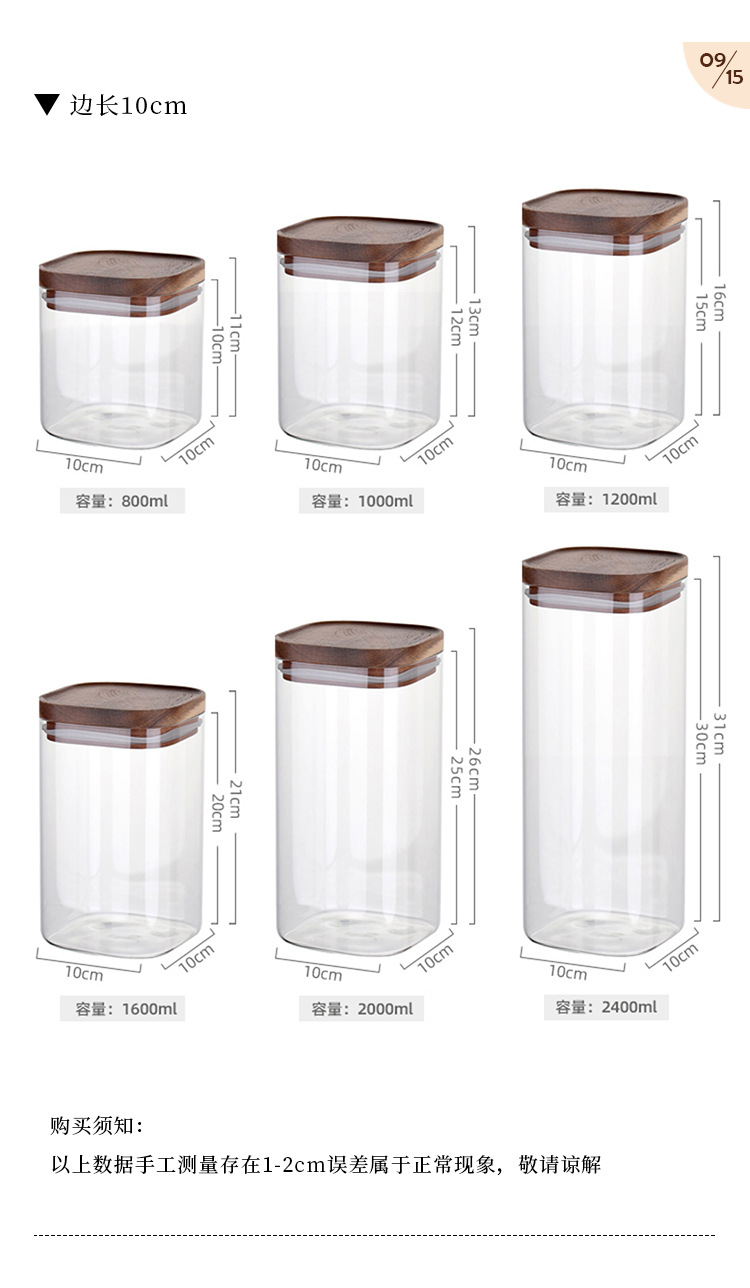 | Colores | Capacidad aproximada de 800 ml, diámetro 10 cm, altura 11 cm,Capacidad aproximada de 1000 ml, diámetro 10 cm, altura 13 cm,Capacidad aproximada de 1200 ml, diámetro 10 cm, altura 16 cm,Capacidad aproximada de 1600 ml, diámetro 10 cm, altura 21 cm,Capacidad aproximada de 2000 ml, diámetro 10 cm, altura 26 cm,Capacidad aproximada de 2400 ml, diámetro 10 cm, altura 31 cm,Bandeja Cuadrada de Madera de Acacia (para Artículos de 10 cm de Diámetro),Palet de madera de acacia cuadrado de 3 agujeros (para diámetro de 10 cm) |