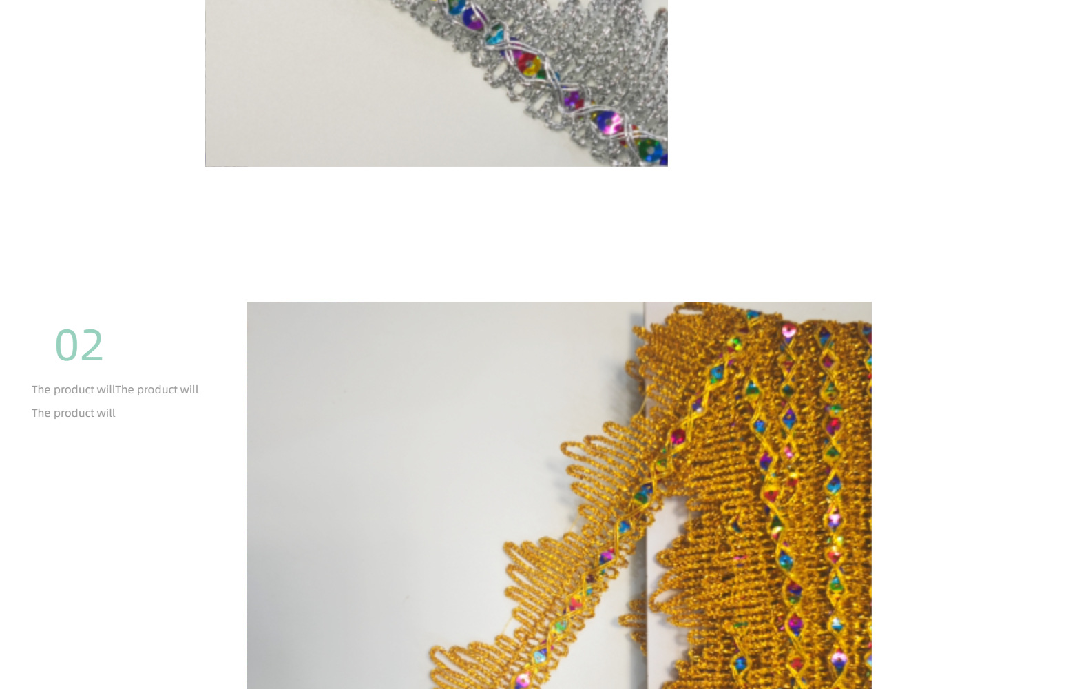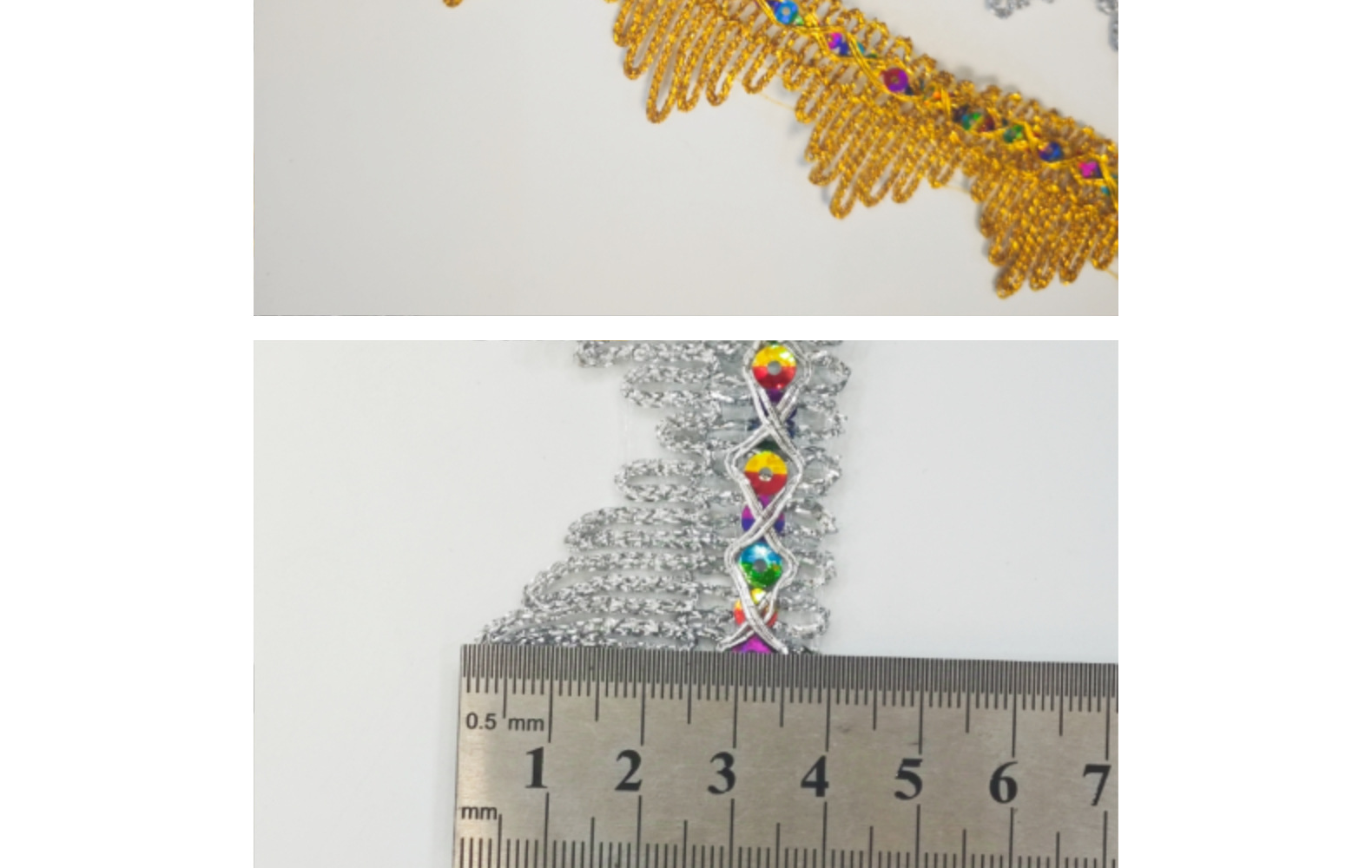 | Modelo de especificación | Ancho 4cm * Tres picos grandes dorados * una yarda de 10,Ancho 4cm * Tres picos grandes plateados * una yarda de 10 |