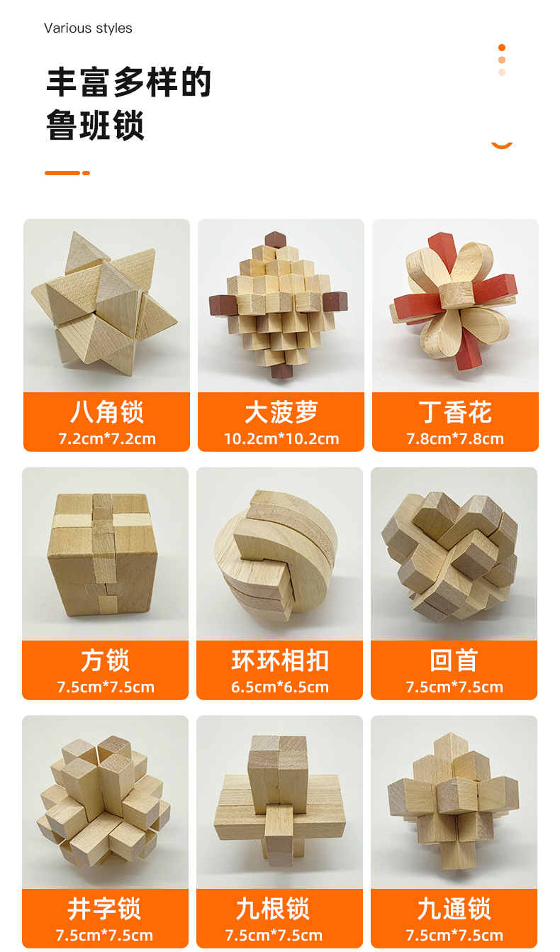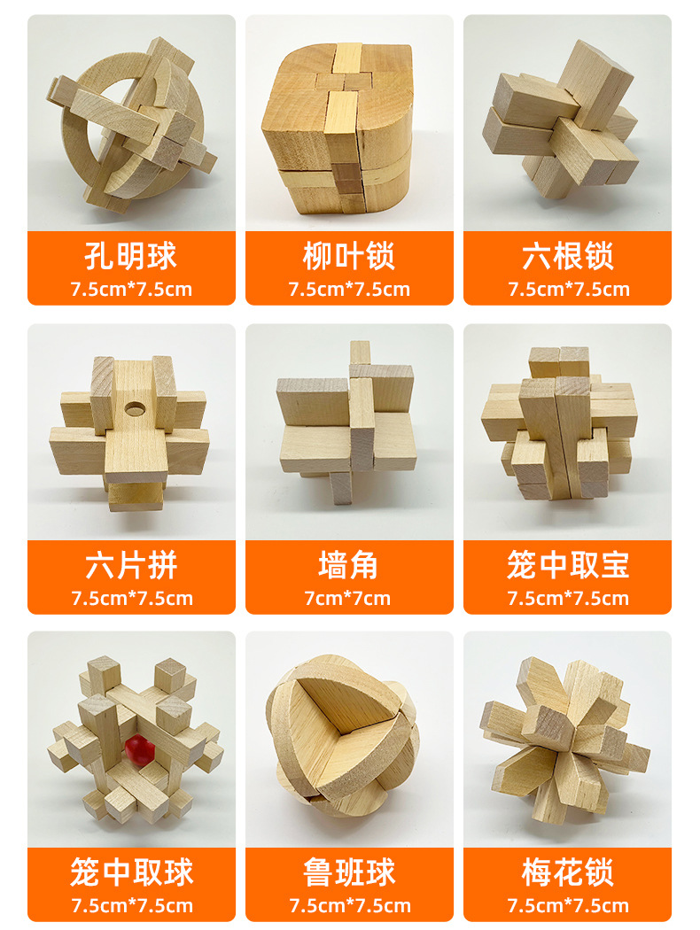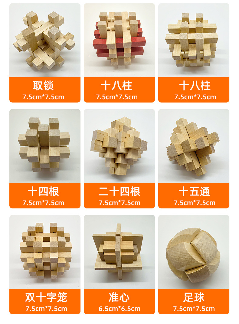 | Colores | Ocho tiros de esquina,Piña grande,Flor lila,Cerradura cuadrada,El enclavado,Bloqueo,Doce columnas,Cerradura de nueve agujeros,Nueve pequeños,Globo,Cerradura de sauce,Cerradura de seis vías,Cerradura de seis piezas,Esquina,Tesoro,Toma la bola roja,Pelota de Luban,Cerradura de flor de ciruelo,Cerradura de bloqueo,Dieciocho columnas de dos colores,Dieciocho pilares de agua clara,Diez o cuatro pilares,24 cerraduras,Piña pequeña,Doble cruz,Cerradura cuasi-corazón,Cruz,Cerradura de chismes |