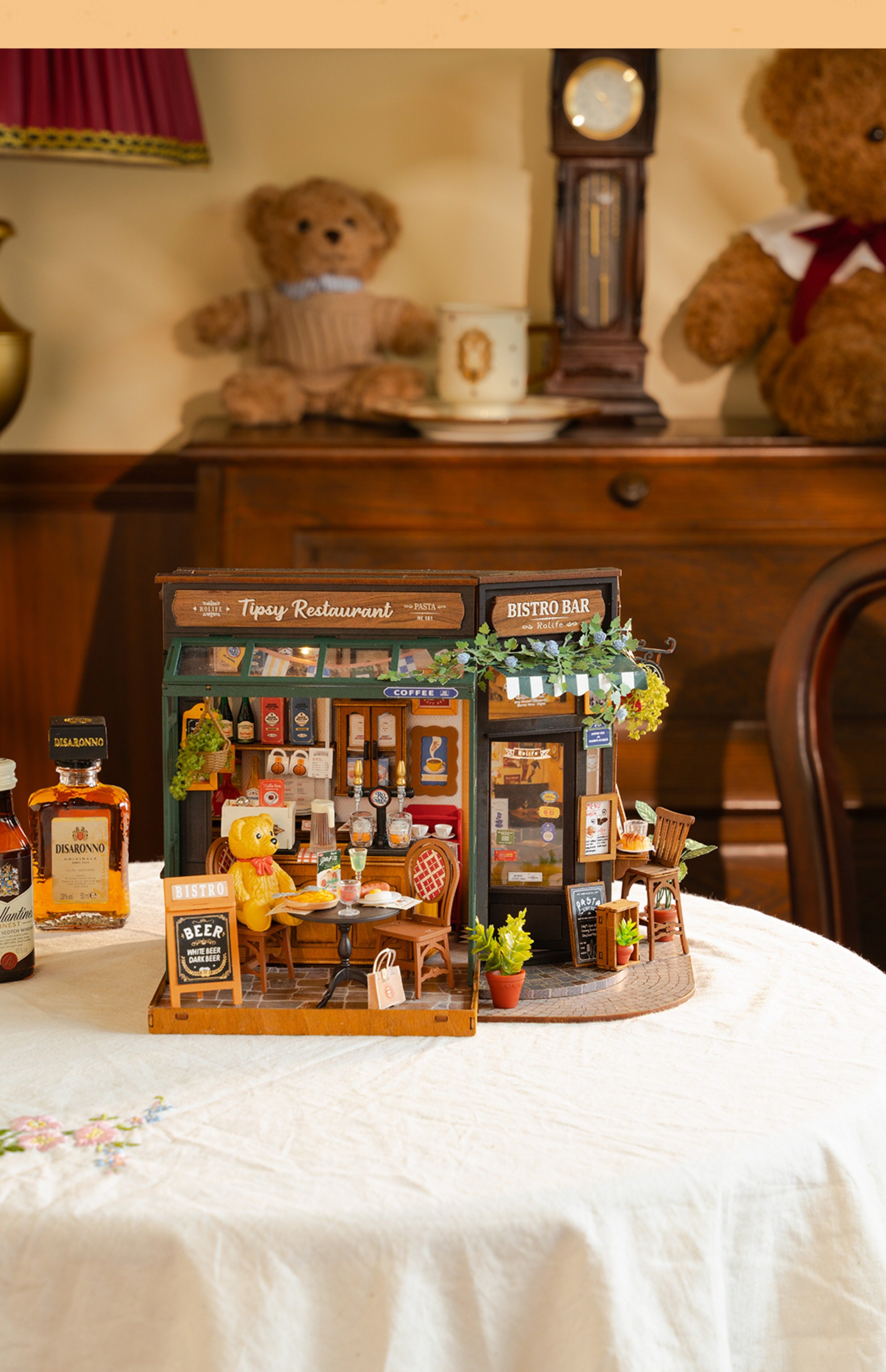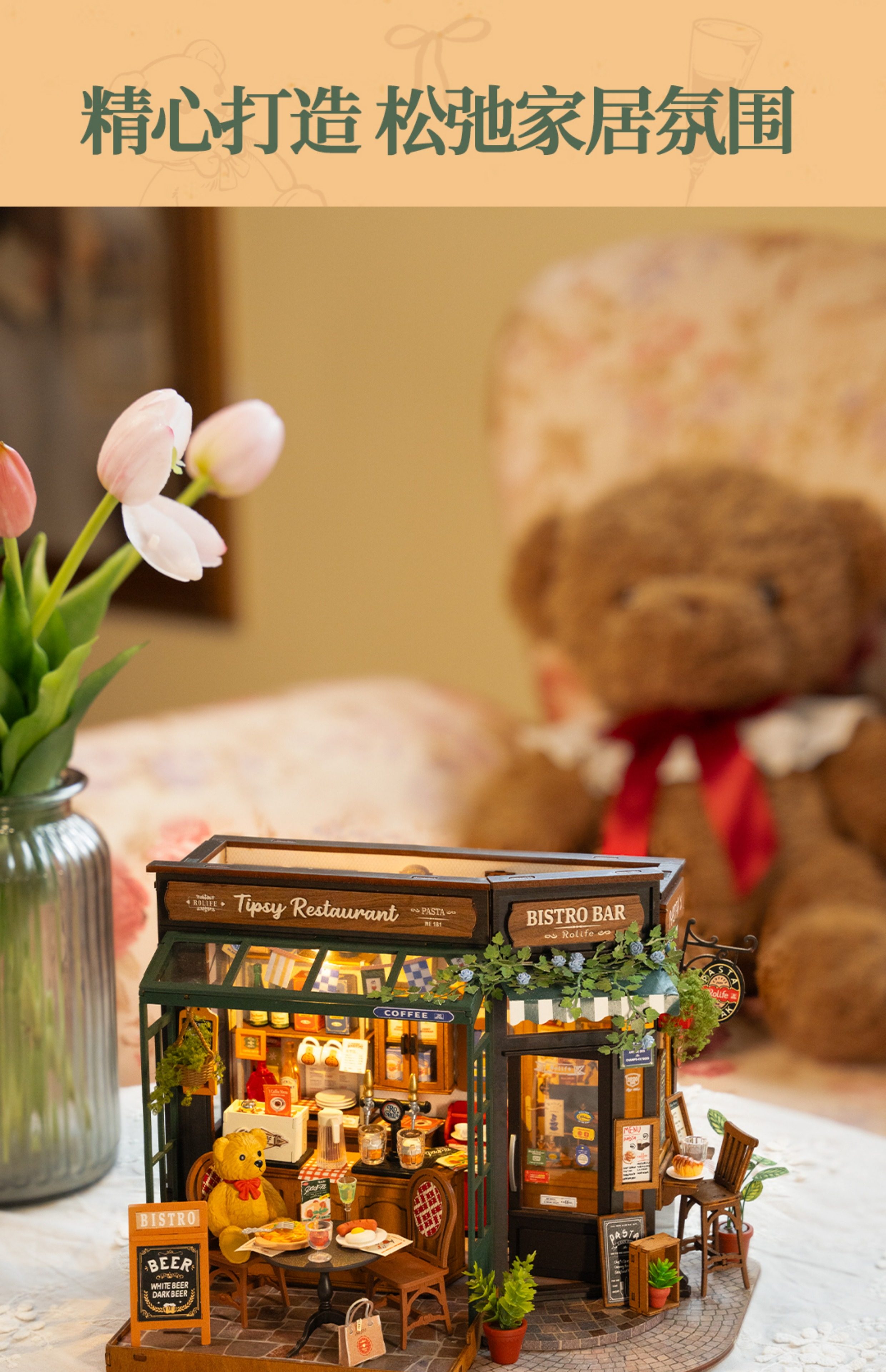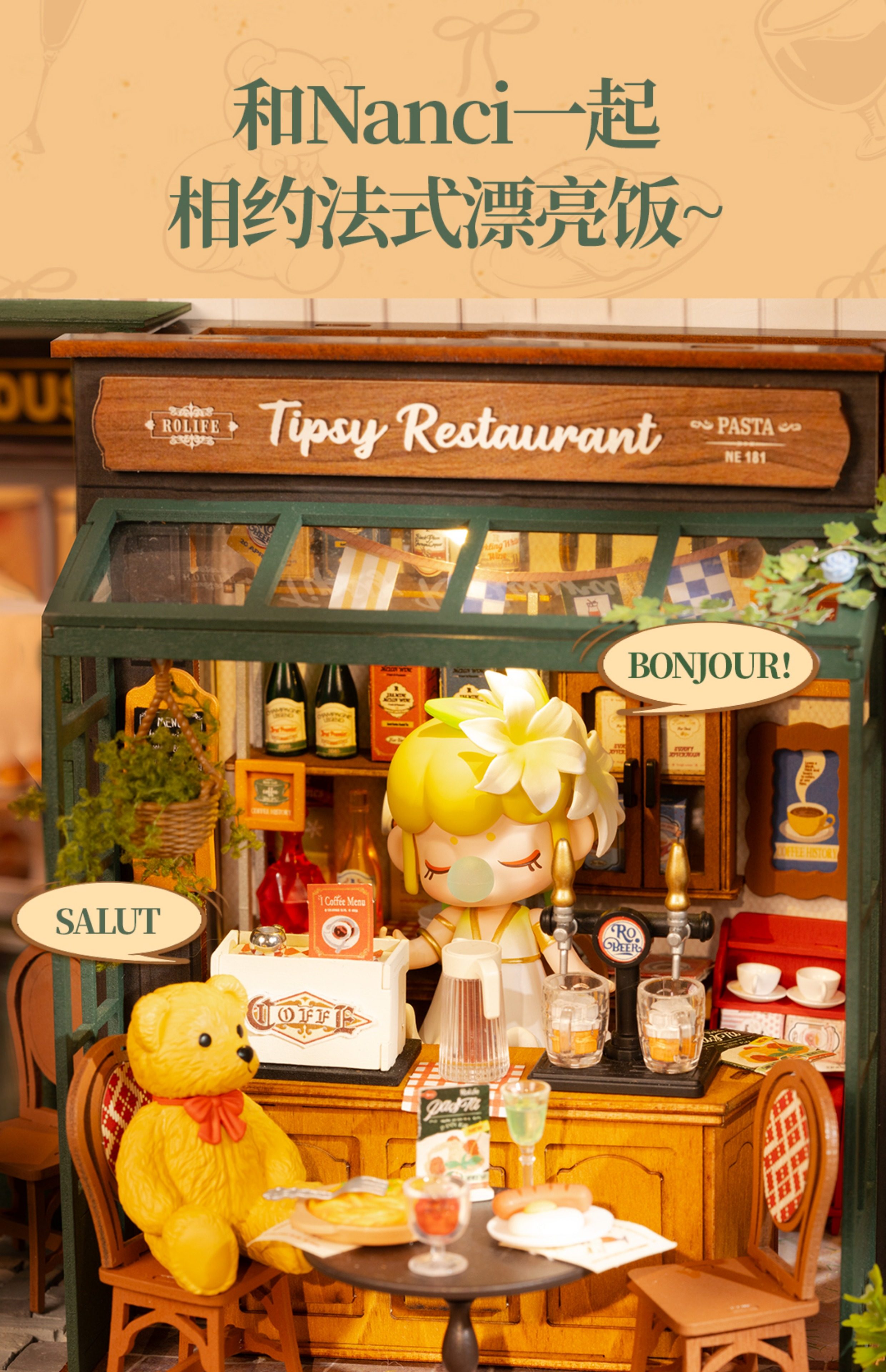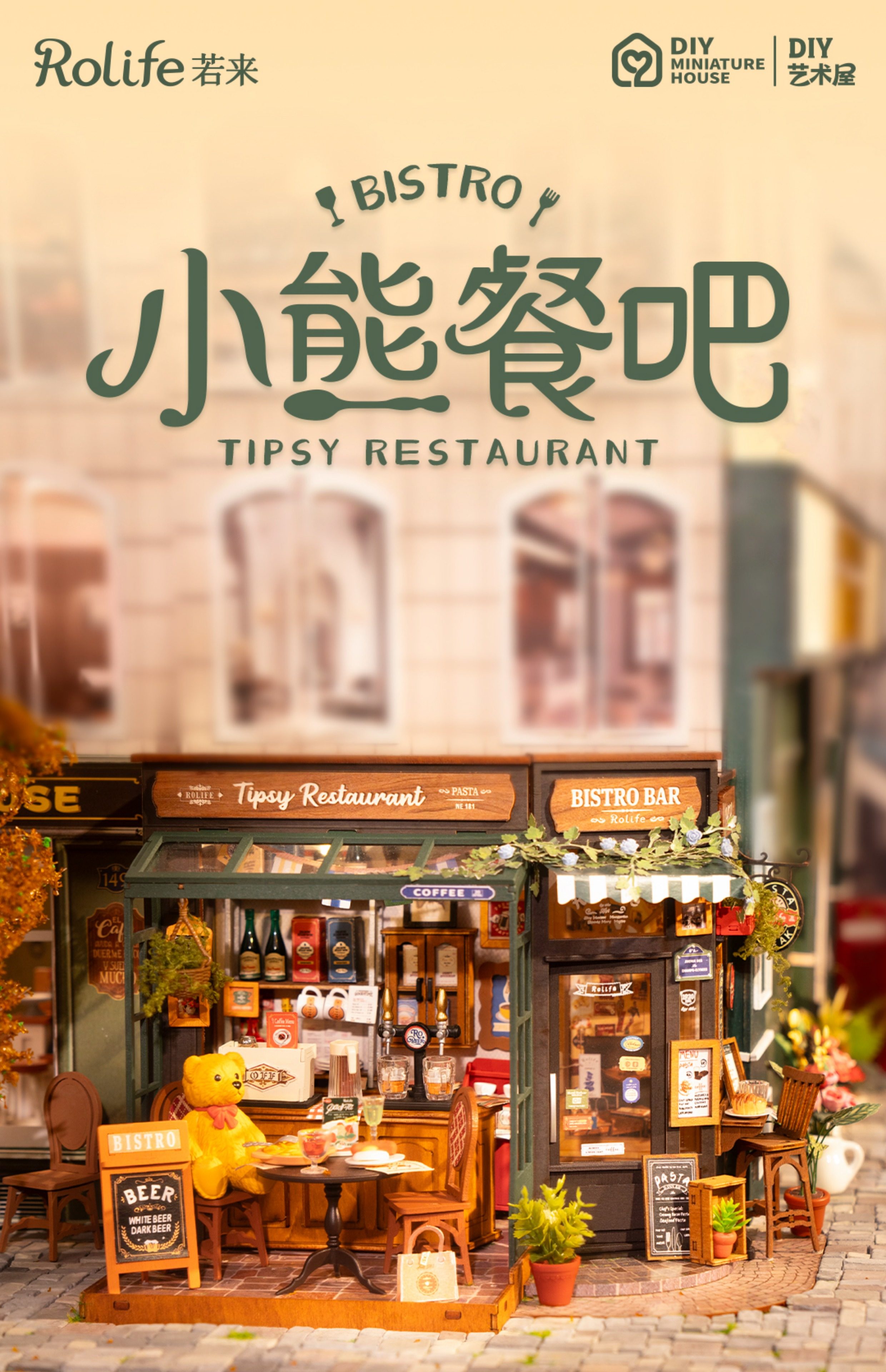 Rollife Ruo Lai Bear Dining Bar Cabaña hecha a mano de bricolaje Modelo de miniatura Casa de juguete ensamblado Bloques de construcción Chica